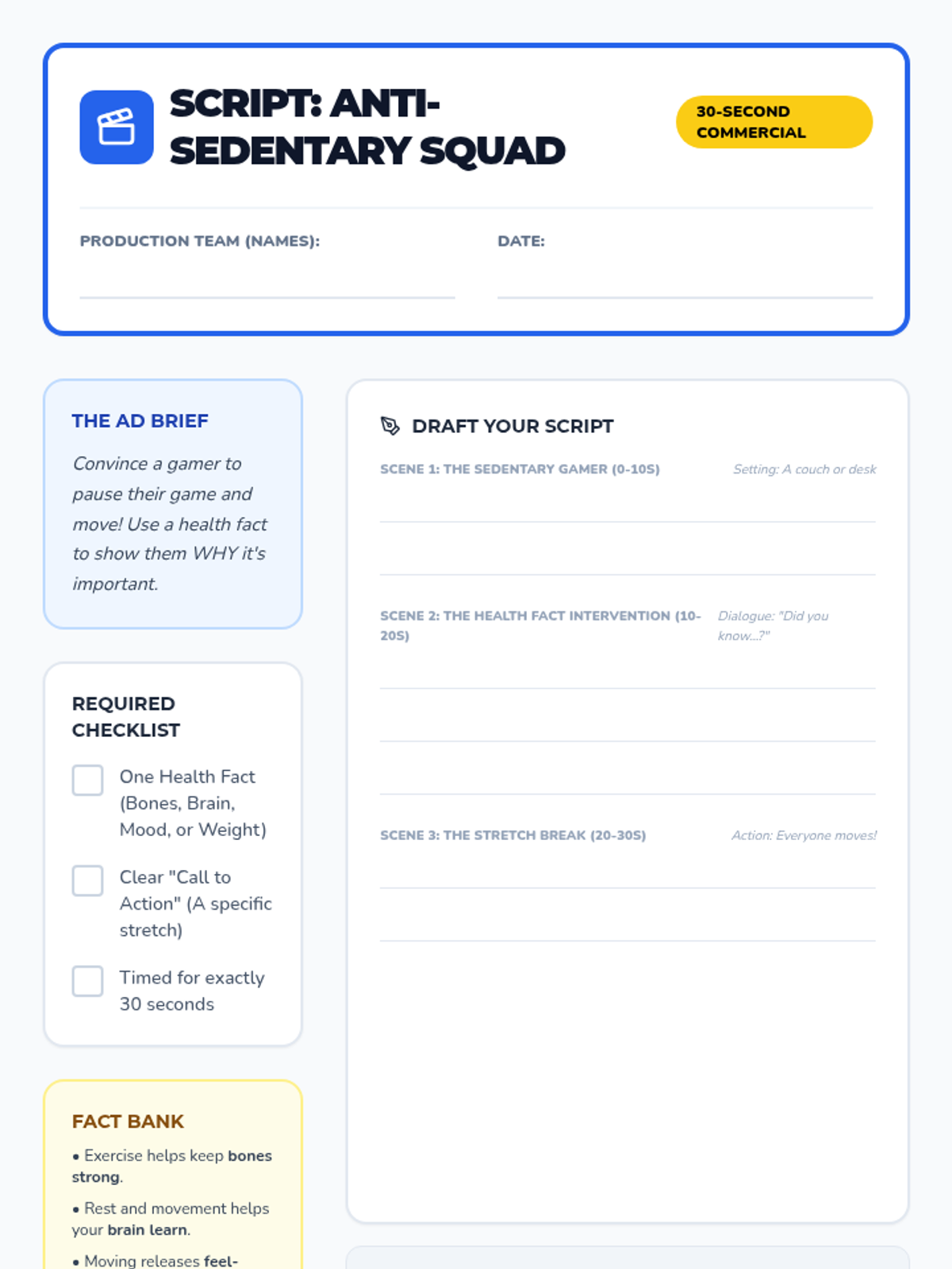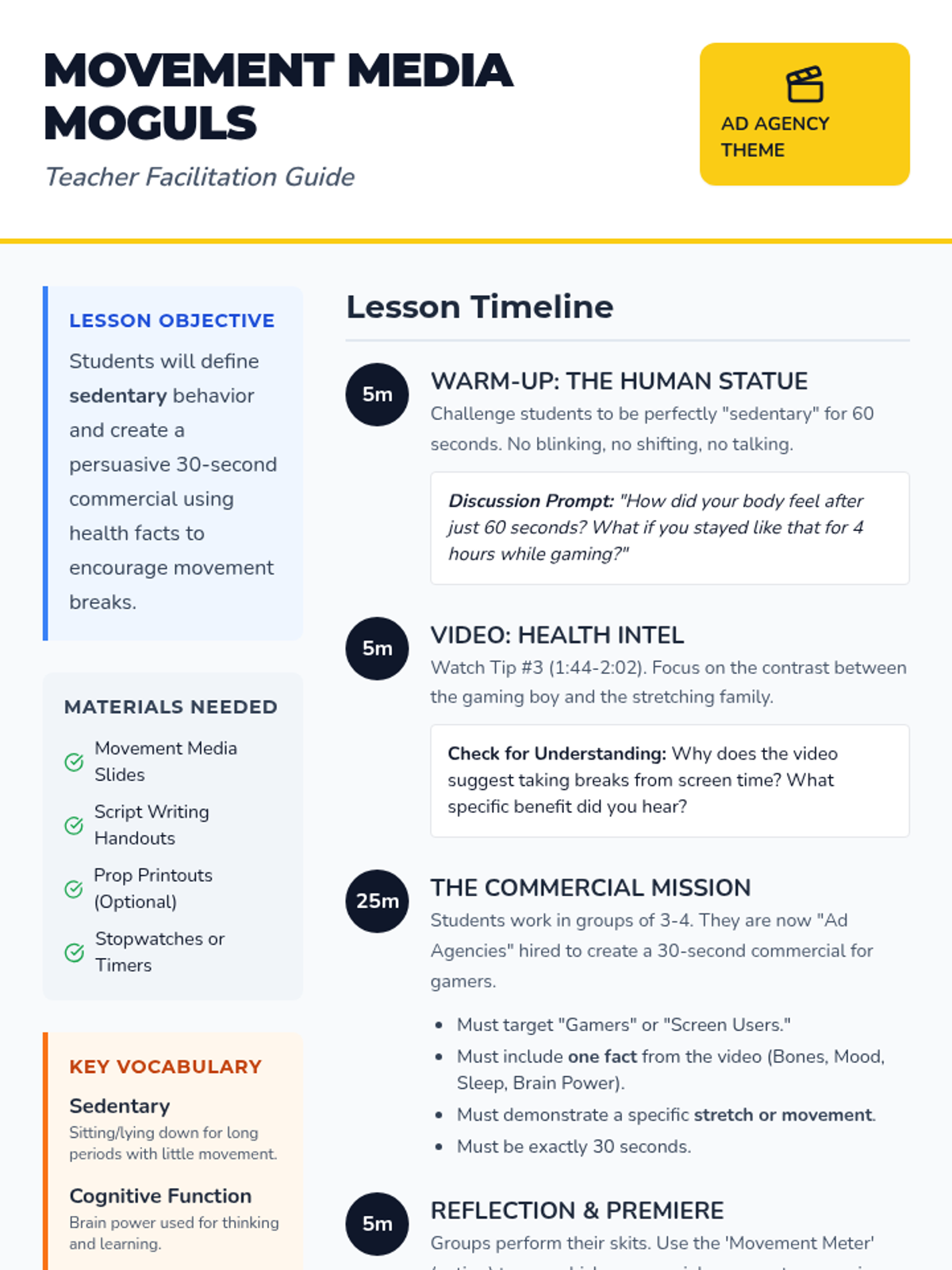 A high-energy lesson where students transform into 'Ad Agencies' to create 30-second commercials persuading others to break sedentary habits with movement. Students learn the definition of sedentary behavior and use facts from a health video to craft their message.