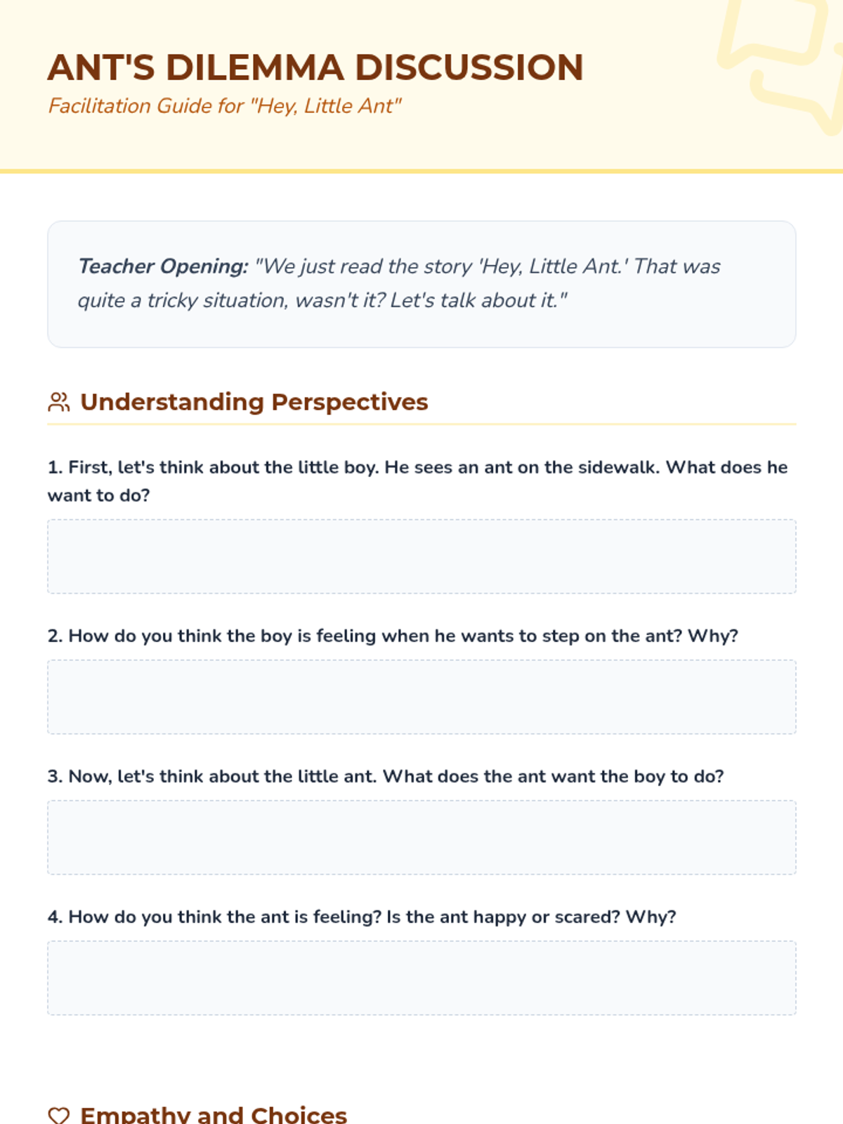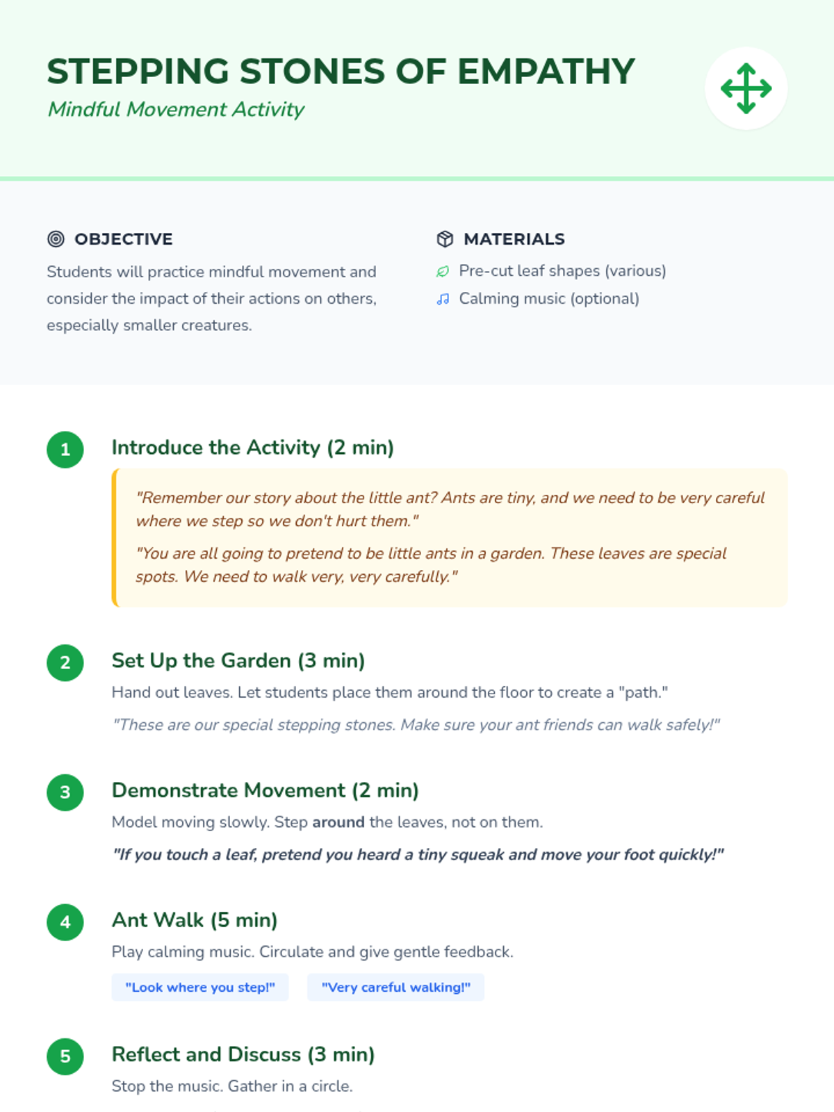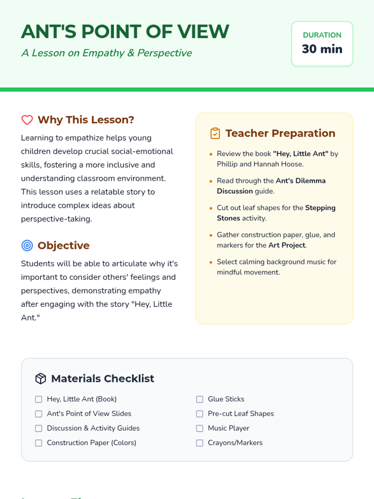 A 30-minute social-emotional learning lesson for 5-year-olds using the book 'Hey, Little Ant' to teach empathy and perspective-taking. Students engage in a read-aloud, a mindful movement activity, and a creative art project to understand that everyone has feelings, regardless of size.