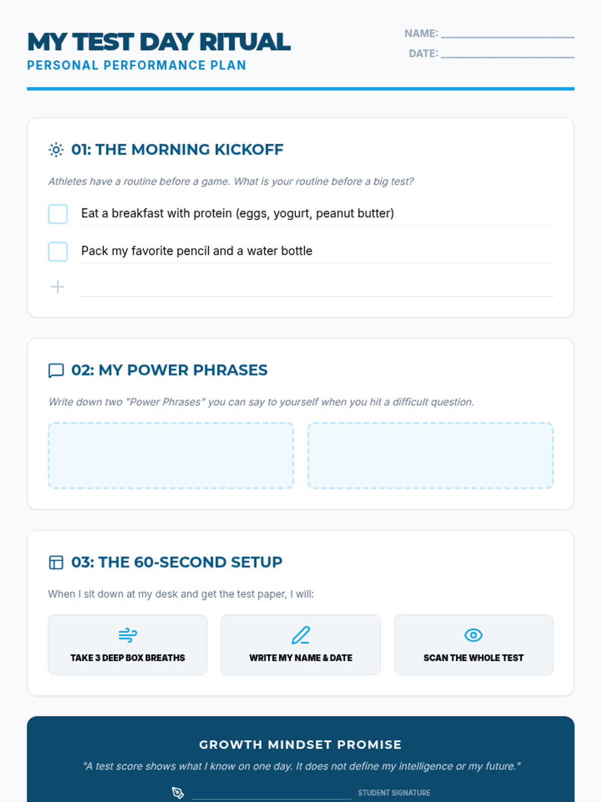 Students develop emotional regulation tools, including box breathing and positive self-talk, to manage test-day nerves and build a personal pre-game routine.