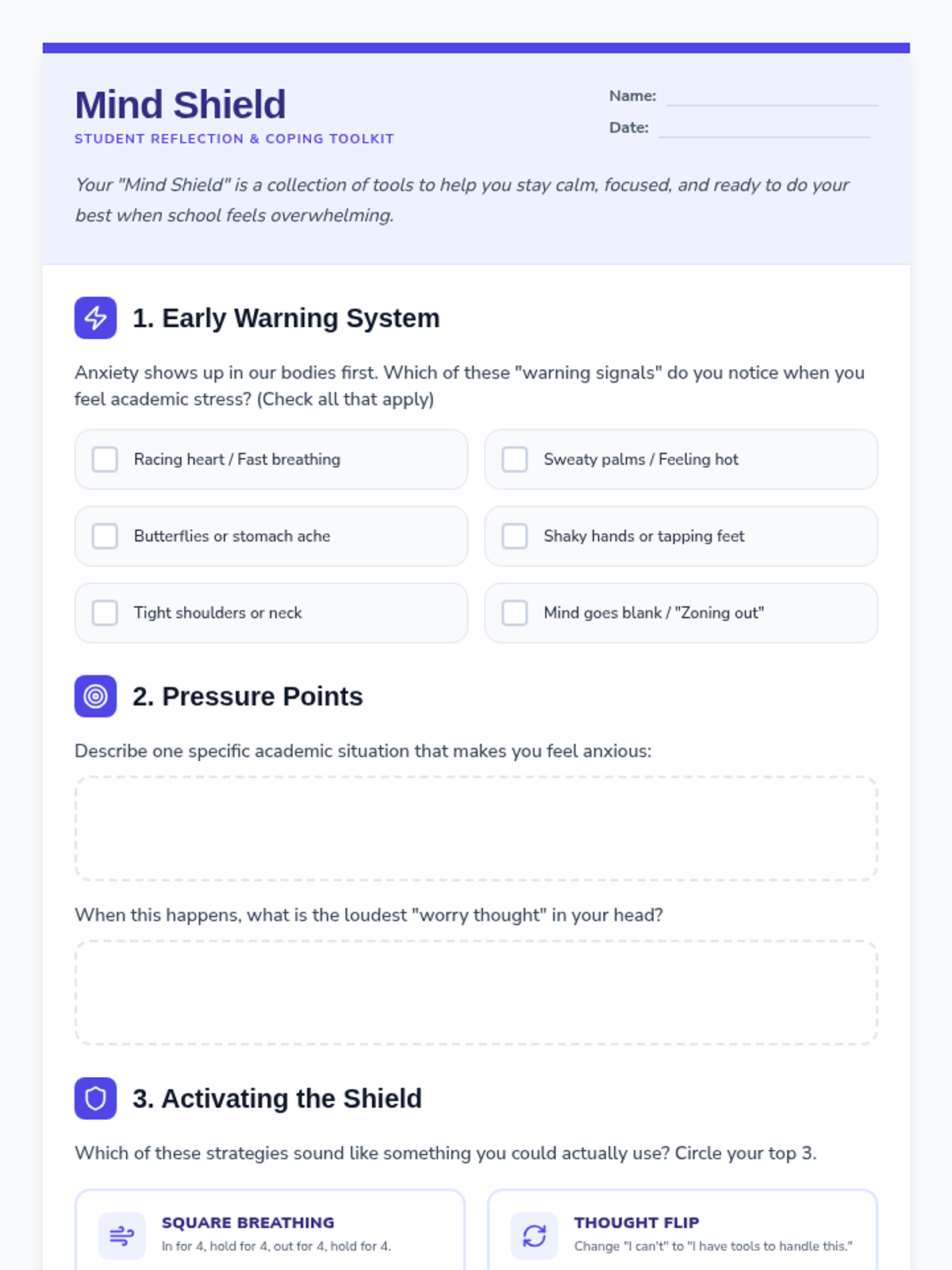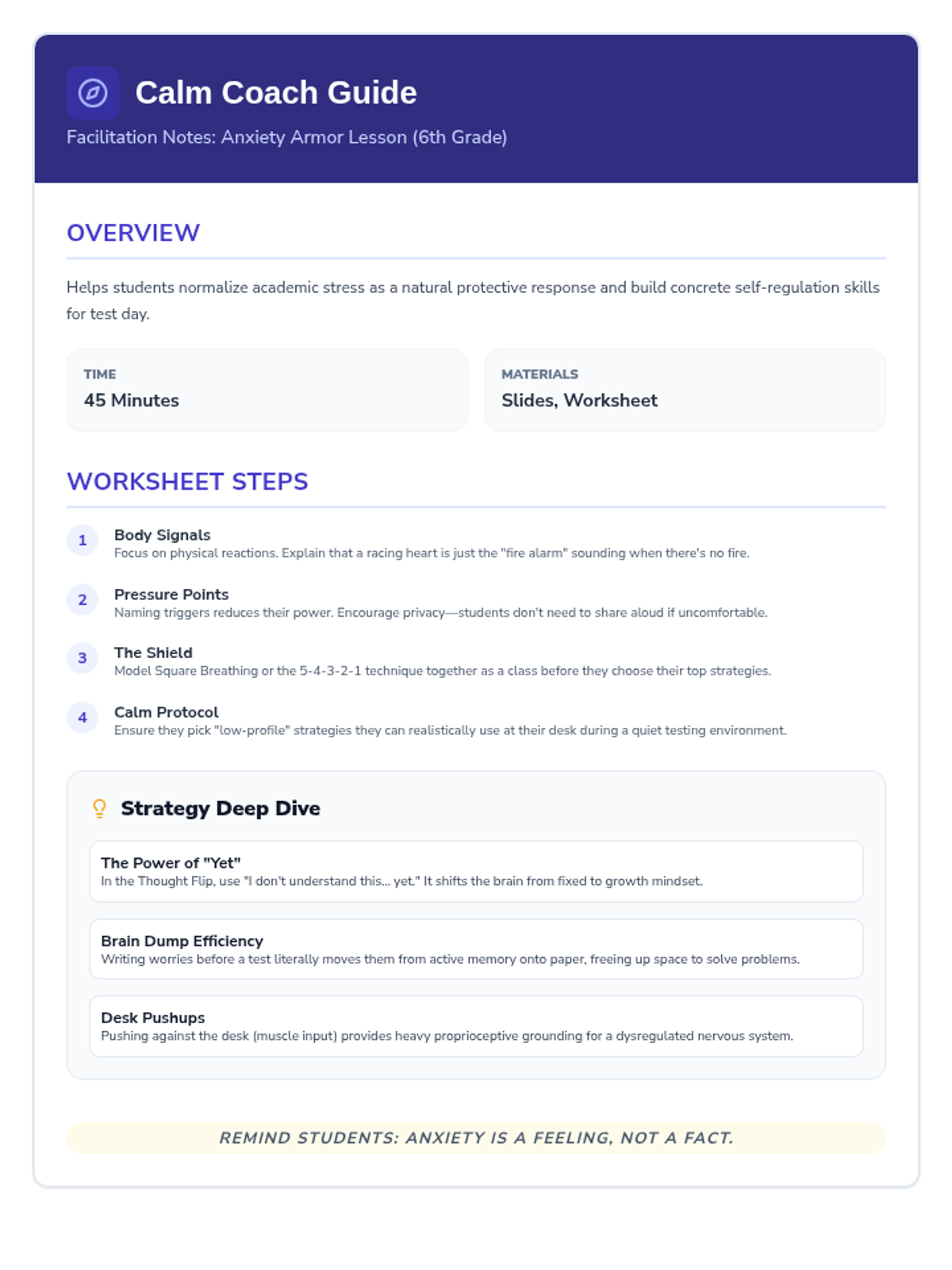 A supportive lesson designed to help 6th graders identify the physical signs of academic stress and build a personalized toolkit of coping strategies for tests and schoolwork.