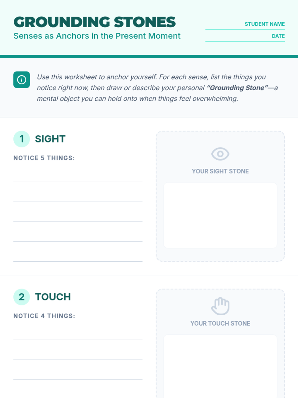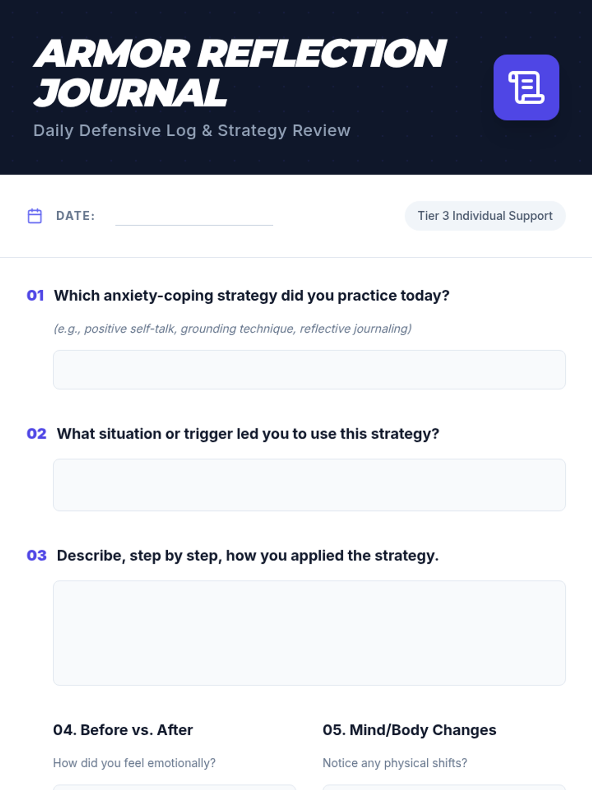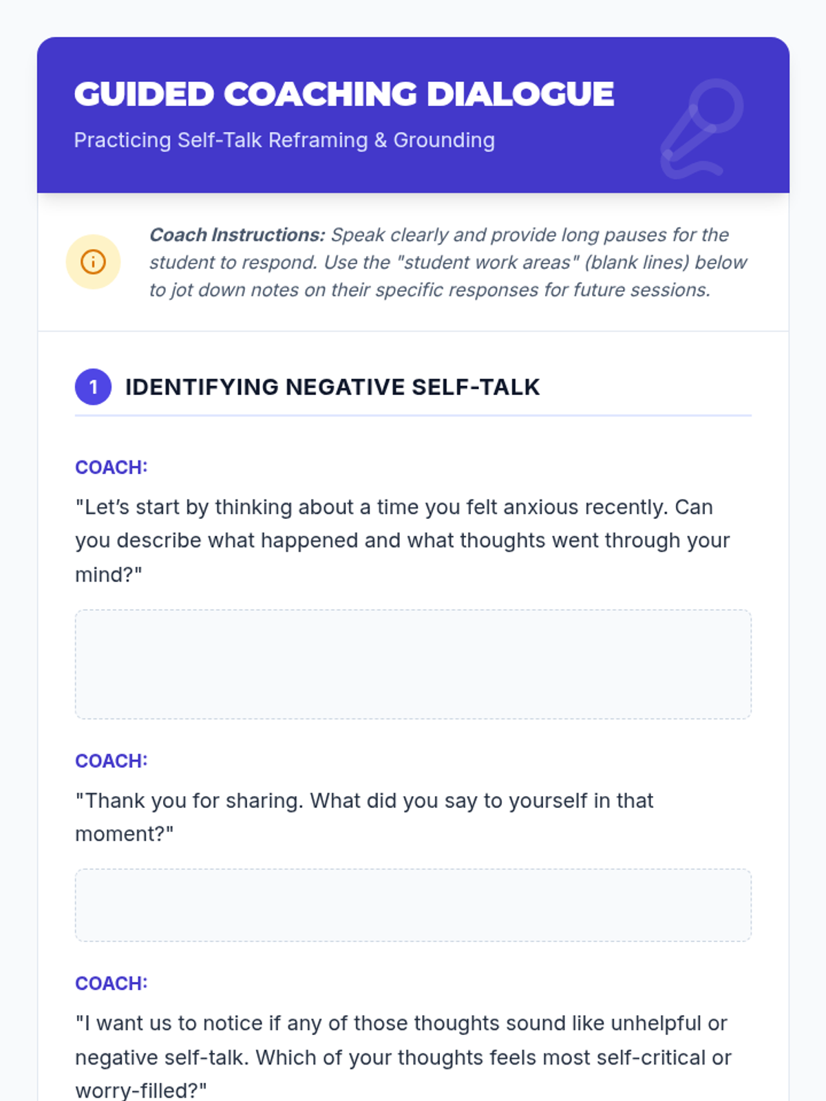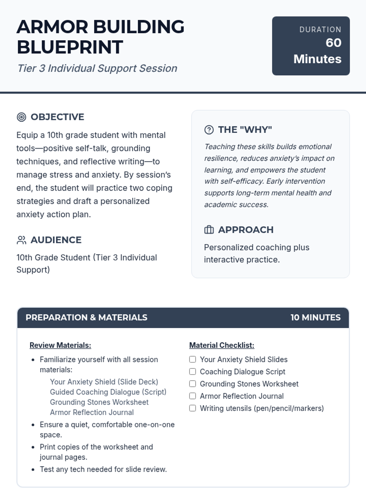 A Tier 3 individual coaching session designed to equip a 10th-grade student with grounding techniques, positive self-talk, and reflective tools to manage anxiety and build emotional resilience.