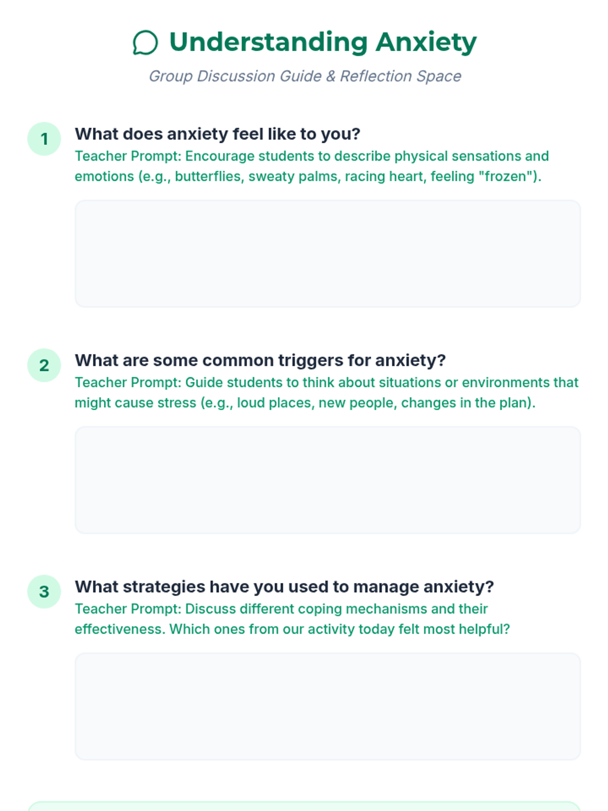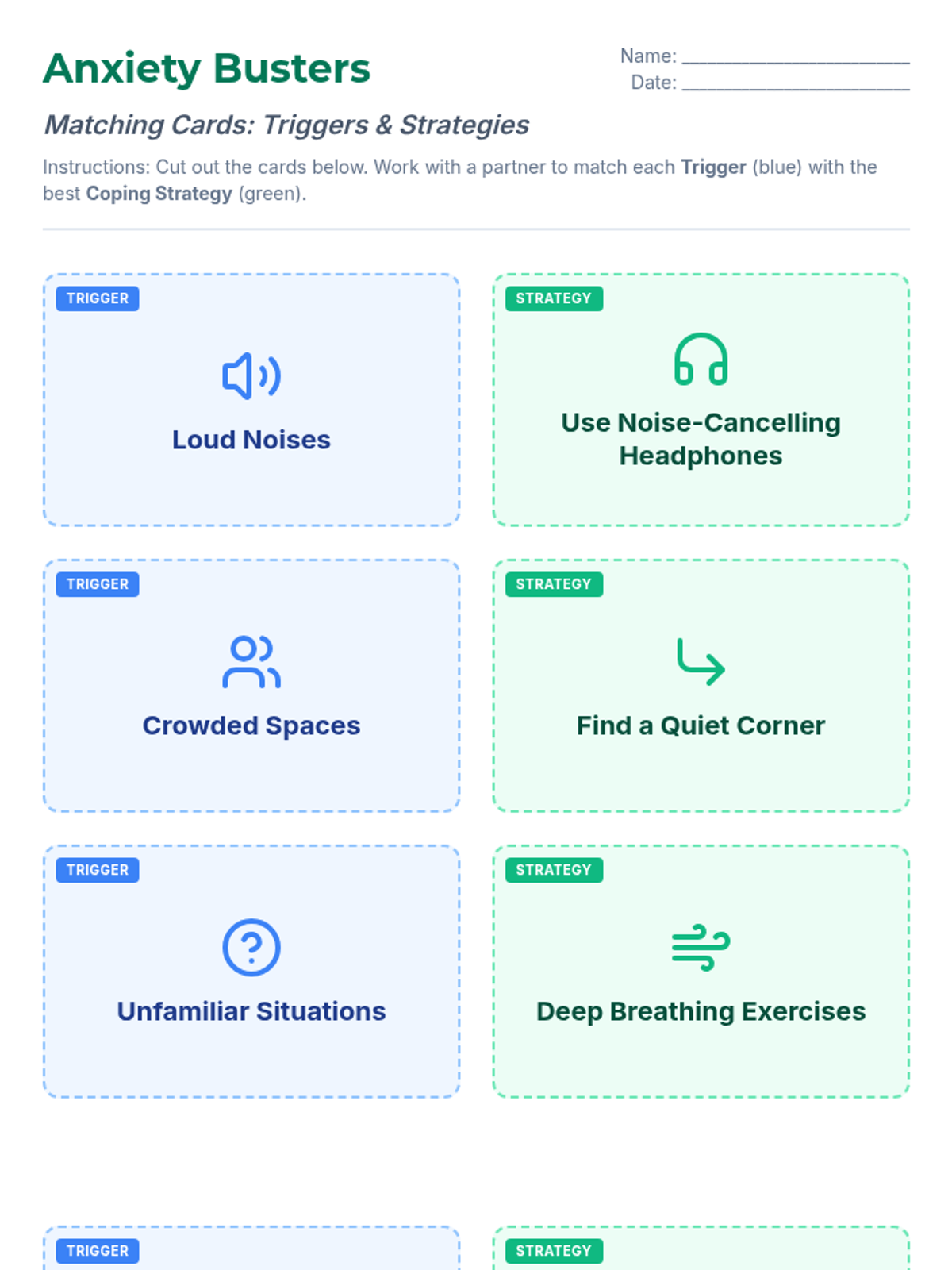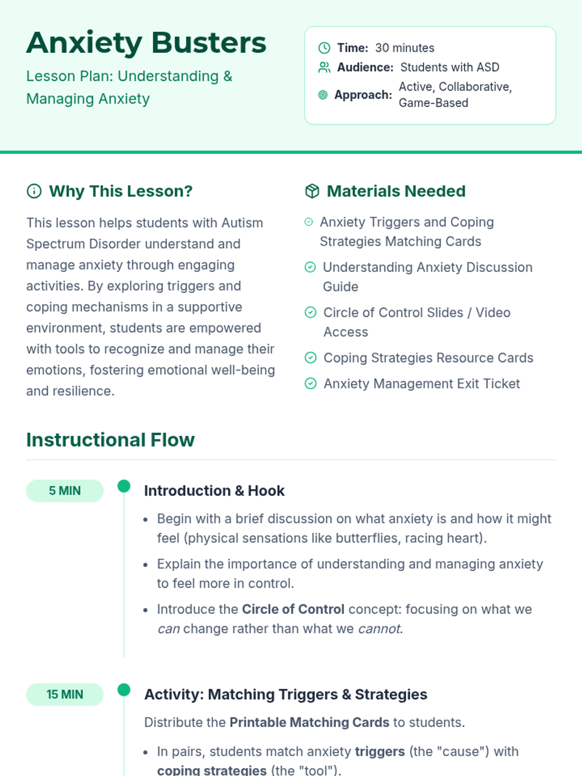 A lesson designed for students with Autism Spectrum Disorder to identify anxiety triggers and learn effective coping strategies through collaborative matching activities and the 'Circle of Control' concept.
