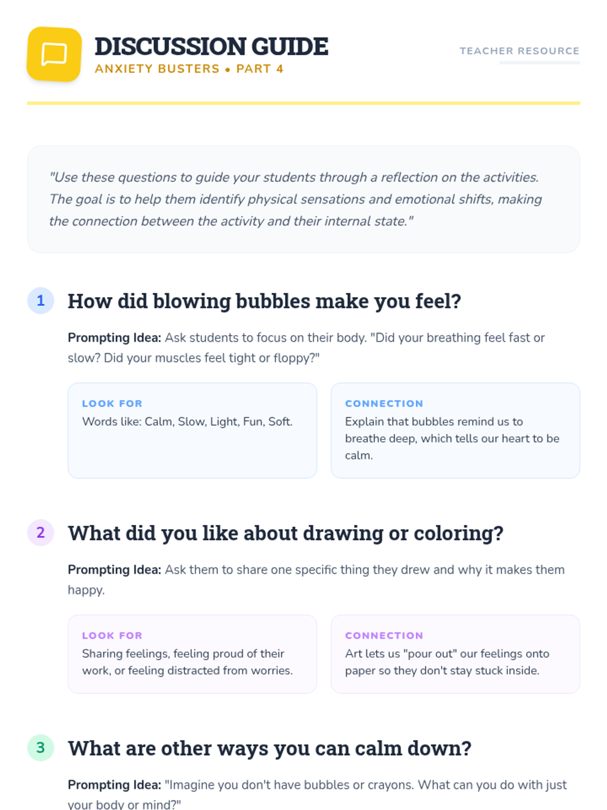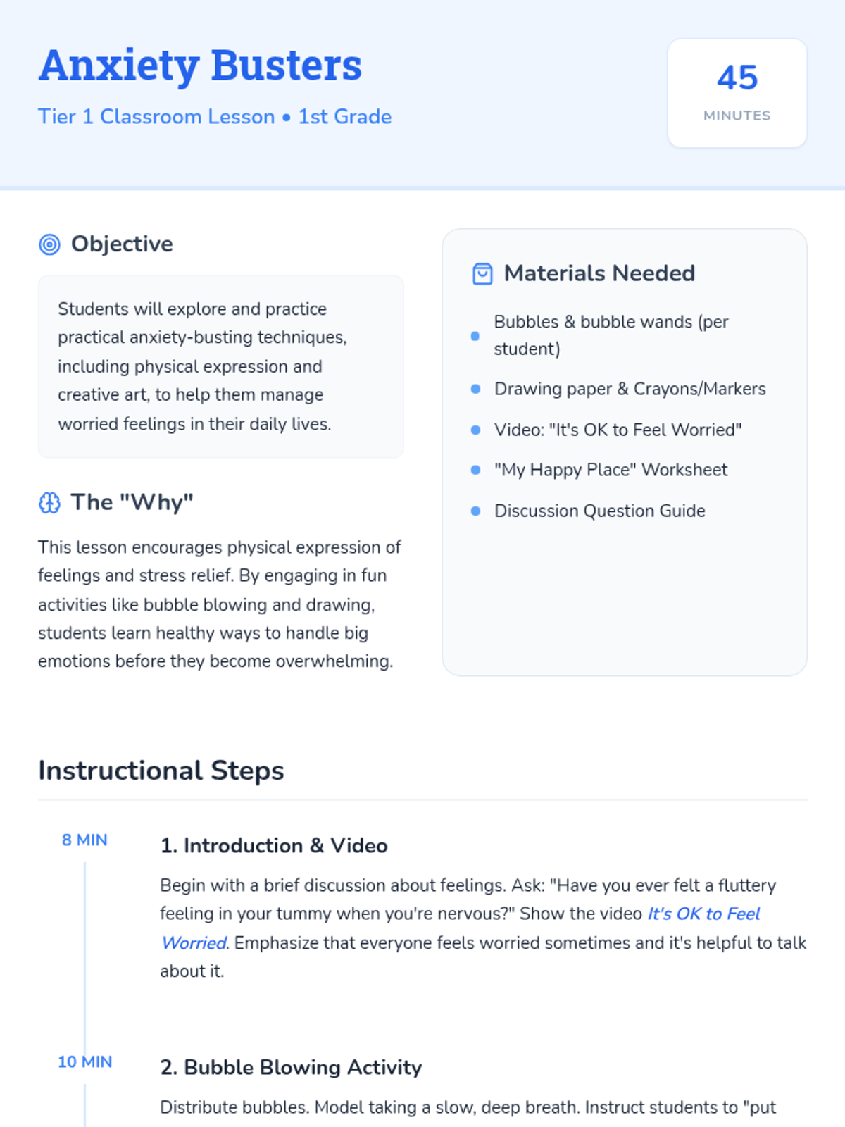 A 1st-grade lesson where students explore anxiety-busting techniques like bubble blowing and drawing to manage their emotions.