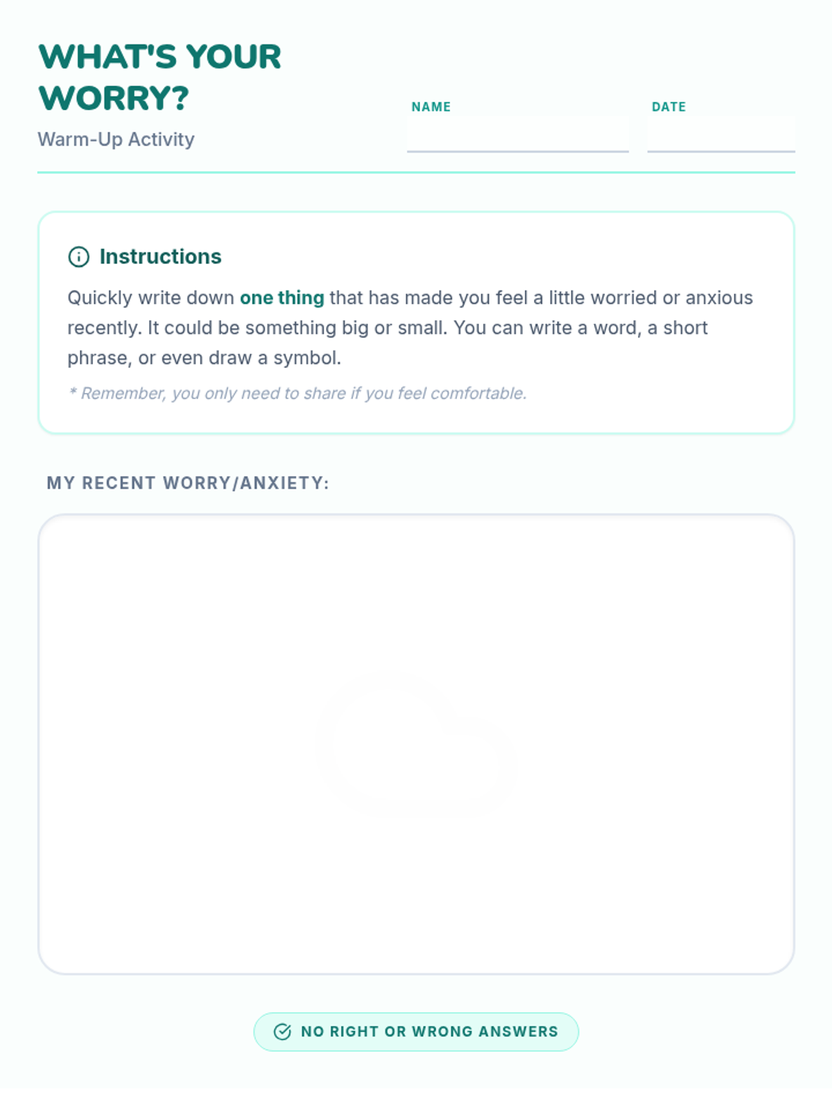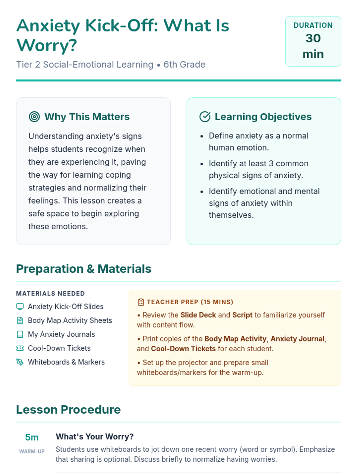 A 30-minute Tier 2 group lesson for 6th graders that introduces the concept of anxiety as a normal emotion and helps students identify their own physical and emotional signs of worry.