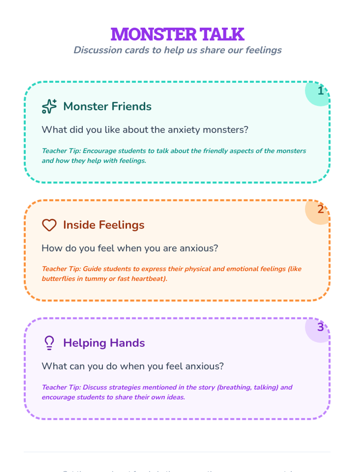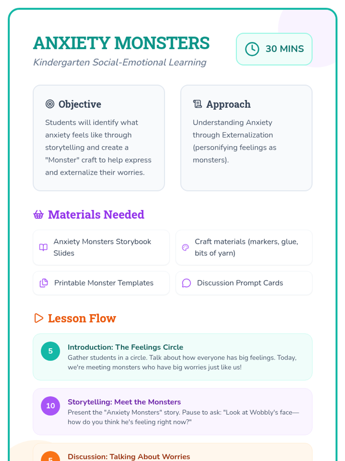 A Kindergarten lesson introducing anxiety through friendly monsters, storytelling, and a hands-on craft activity to help children identify and manage their feelings.