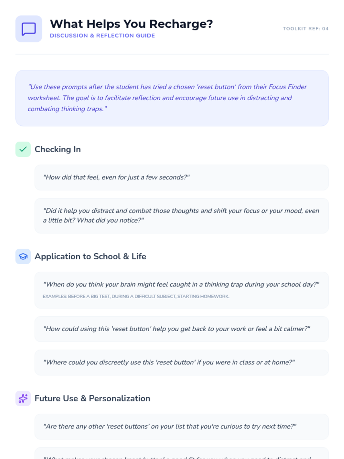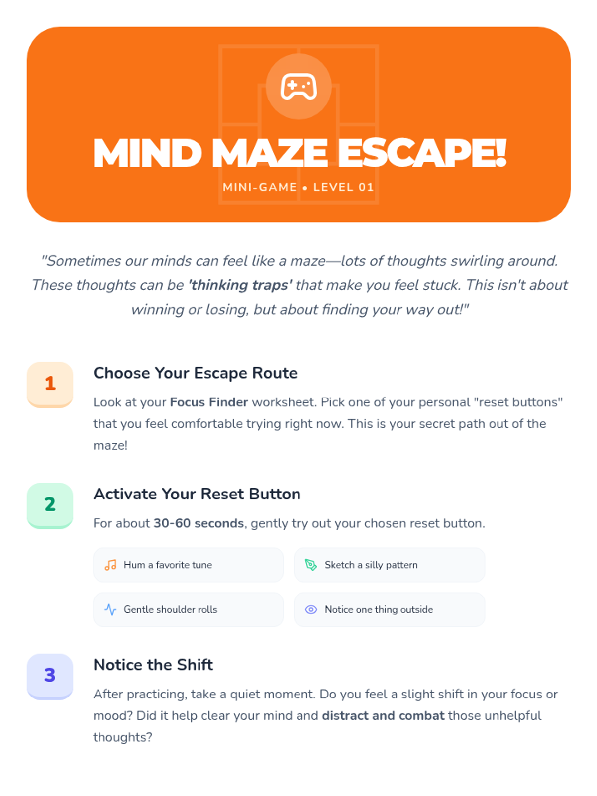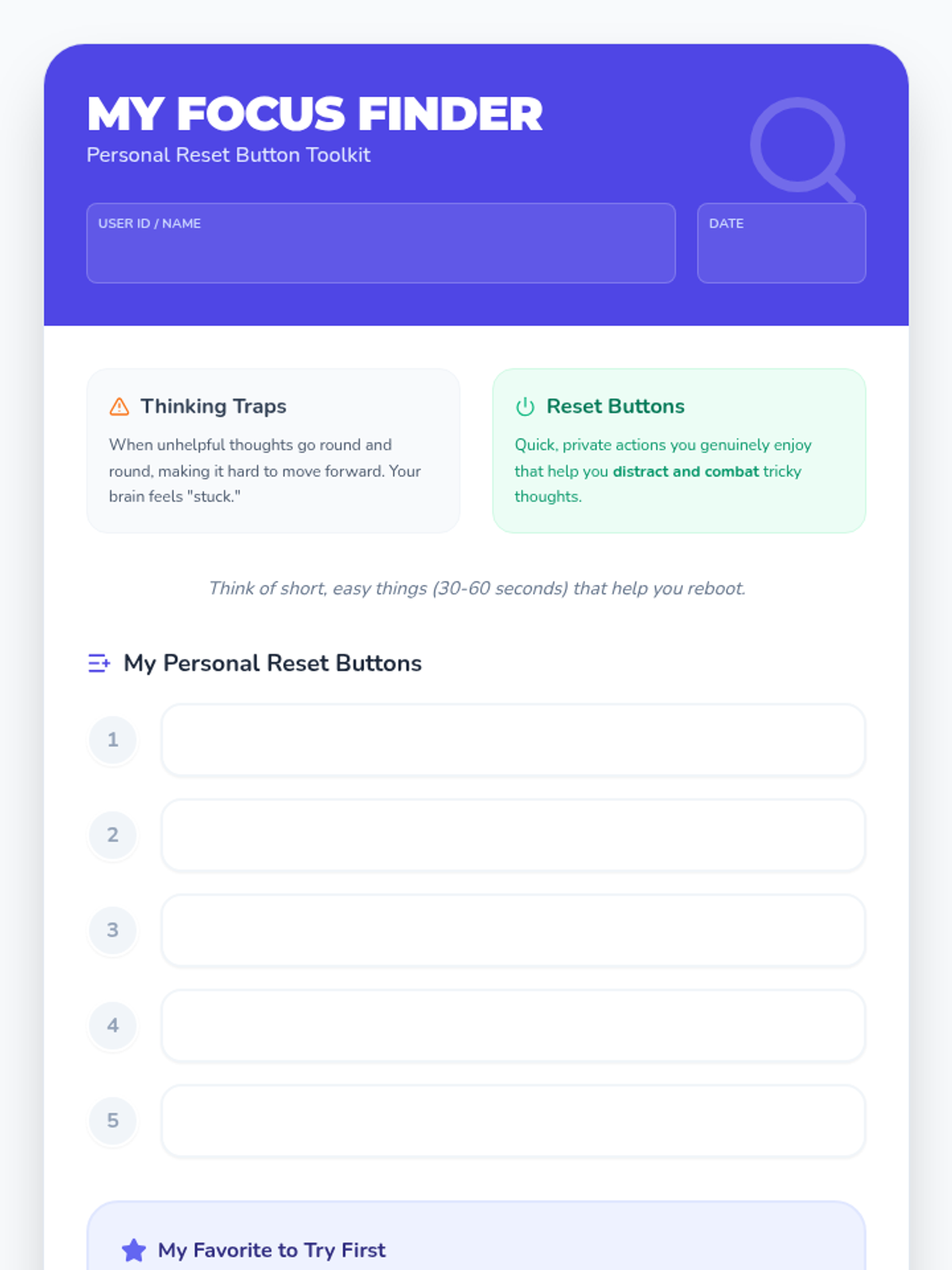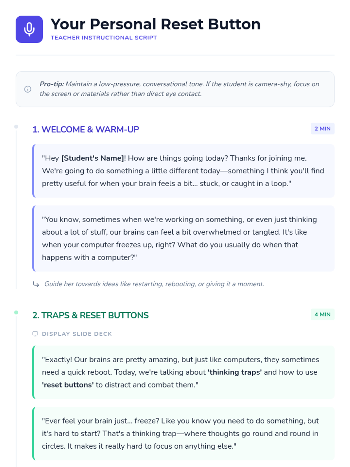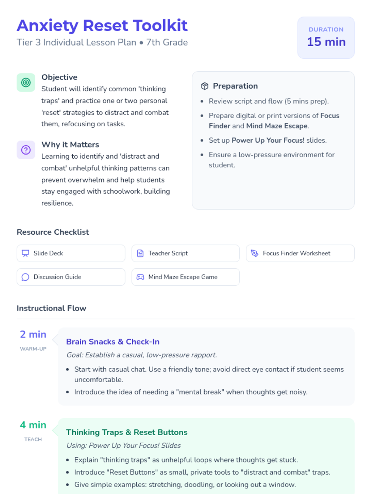 A 15-minute Tier 3 individual lesson designed for a 7th-grade student to identify 'thinking traps' and practice 'reset buttons'—quick, non-traditional strategies to distract from anxiety and refocus on schoolwork.