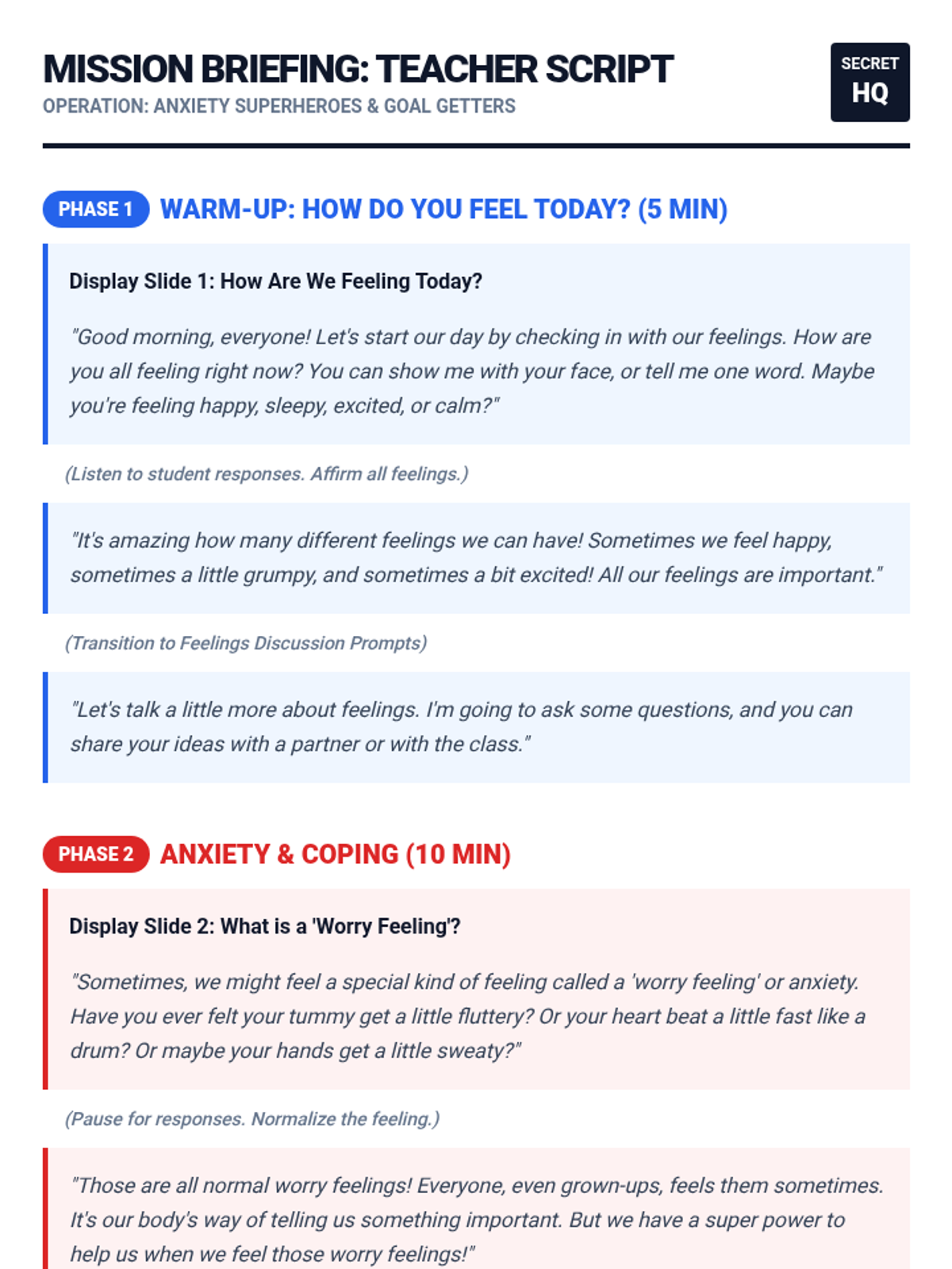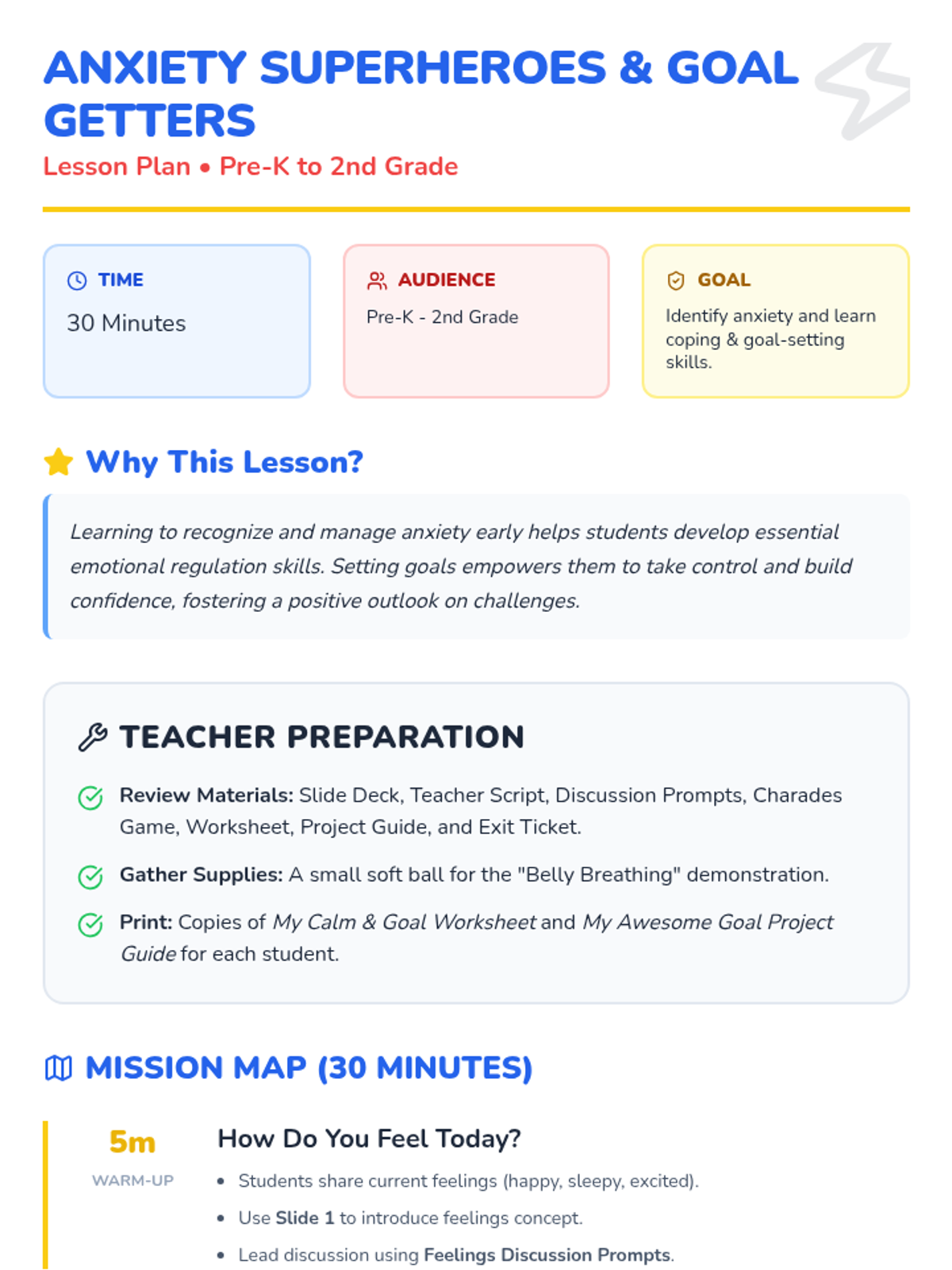 This lesson helps Pre-K to 2nd grade students understand and manage feelings of anxiety through 'superhero' coping strategies and learn how to set simple goals as 'Goal Getters.' It builds emotional resilience and self-management skills through interactive play, discussion, and guided reflection.