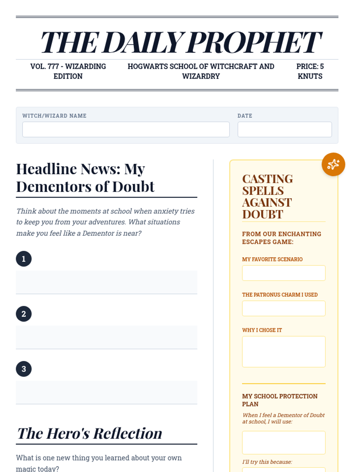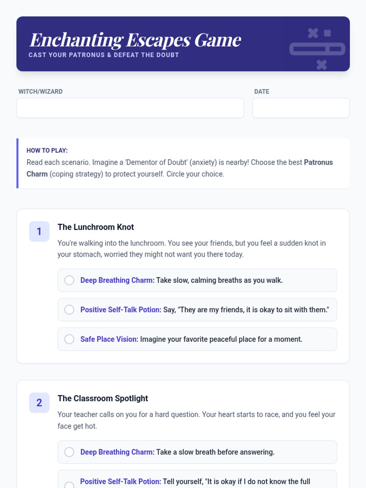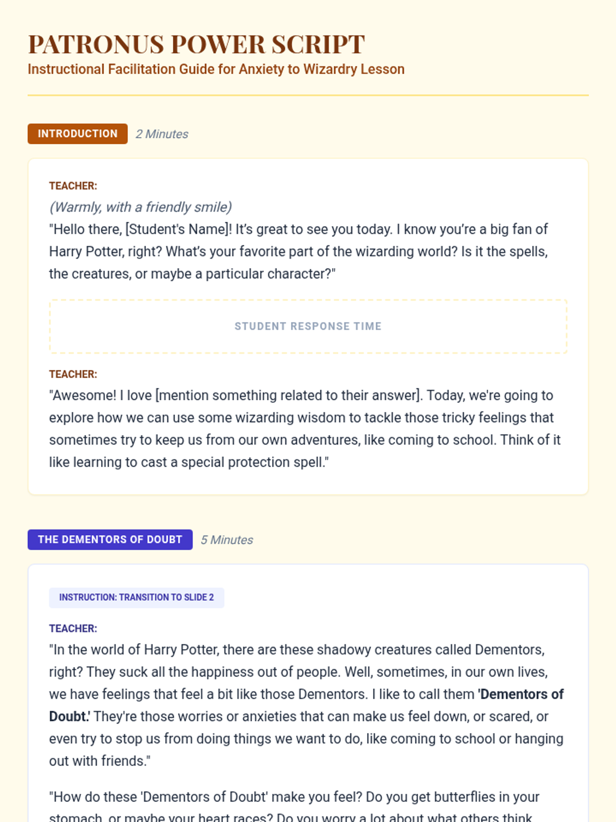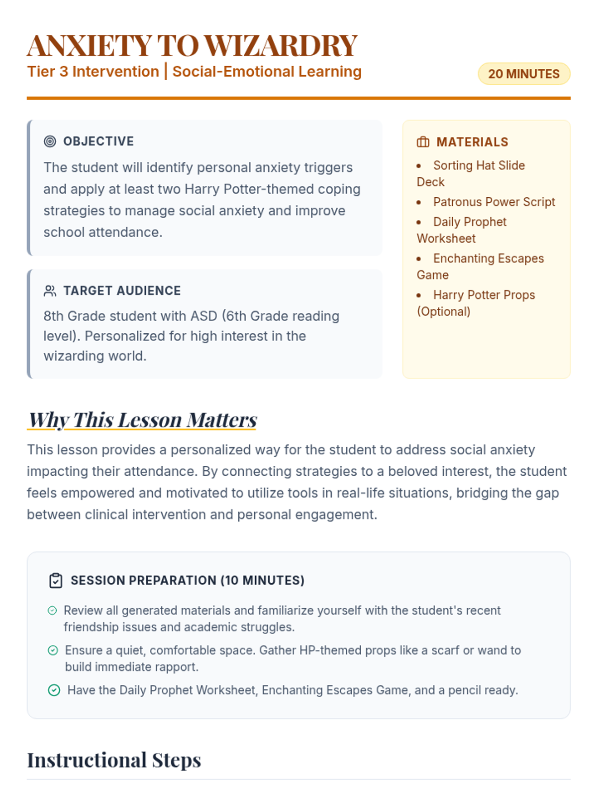A specialized 20-minute Tier 3 intervention for an 8th-grade student with ASD, using Harry Potter metaphors to address social anxiety and improve school attendance. The lesson focuses on identifying anxiety triggers ('Dementors of Doubt') and applying coping strategies ('Patronus Charms').