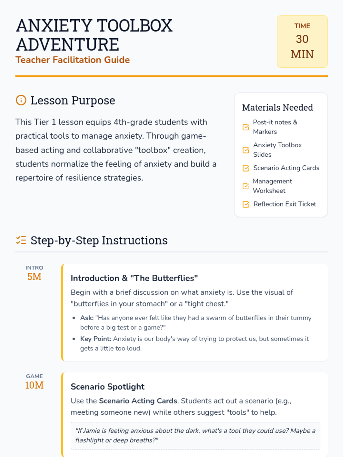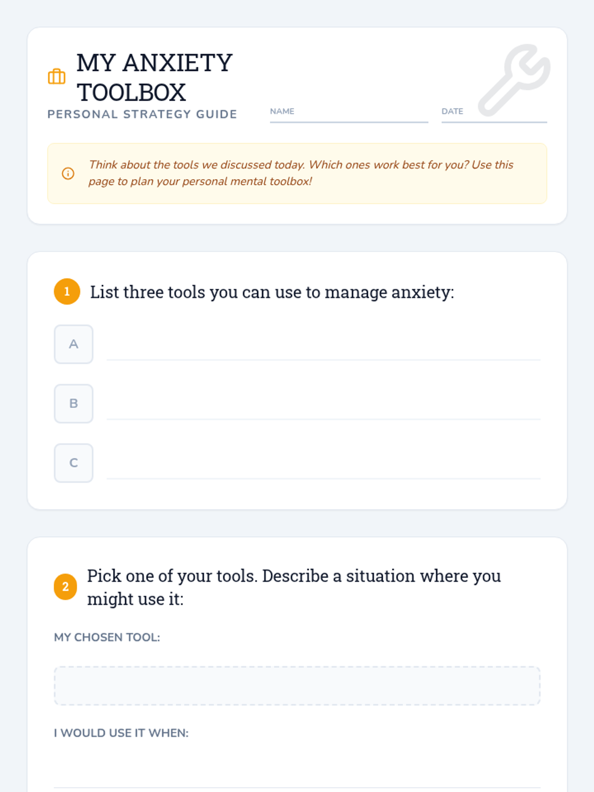 A lesson for 4th-grade students to explore and practice anxiety management strategies through games, collaboration, and reflection. Students build a mental 'toolbox' of coping skills to use in stressful situations.