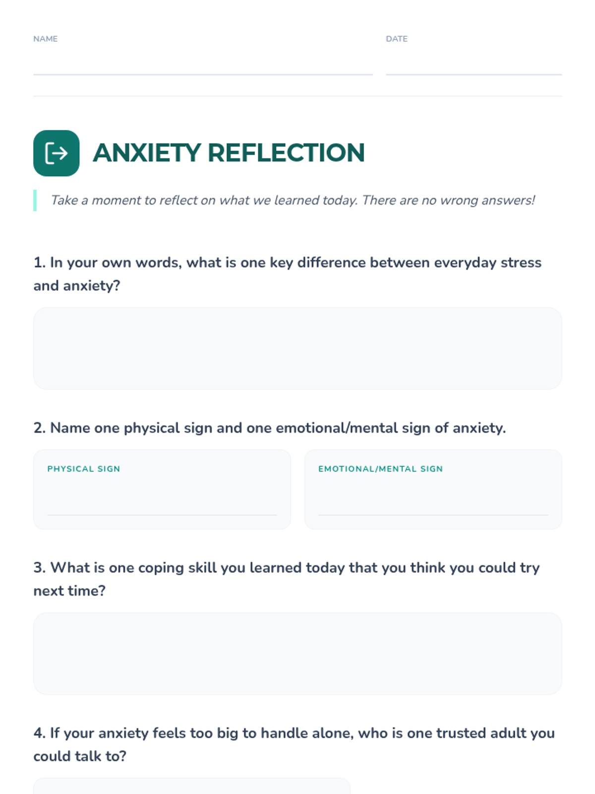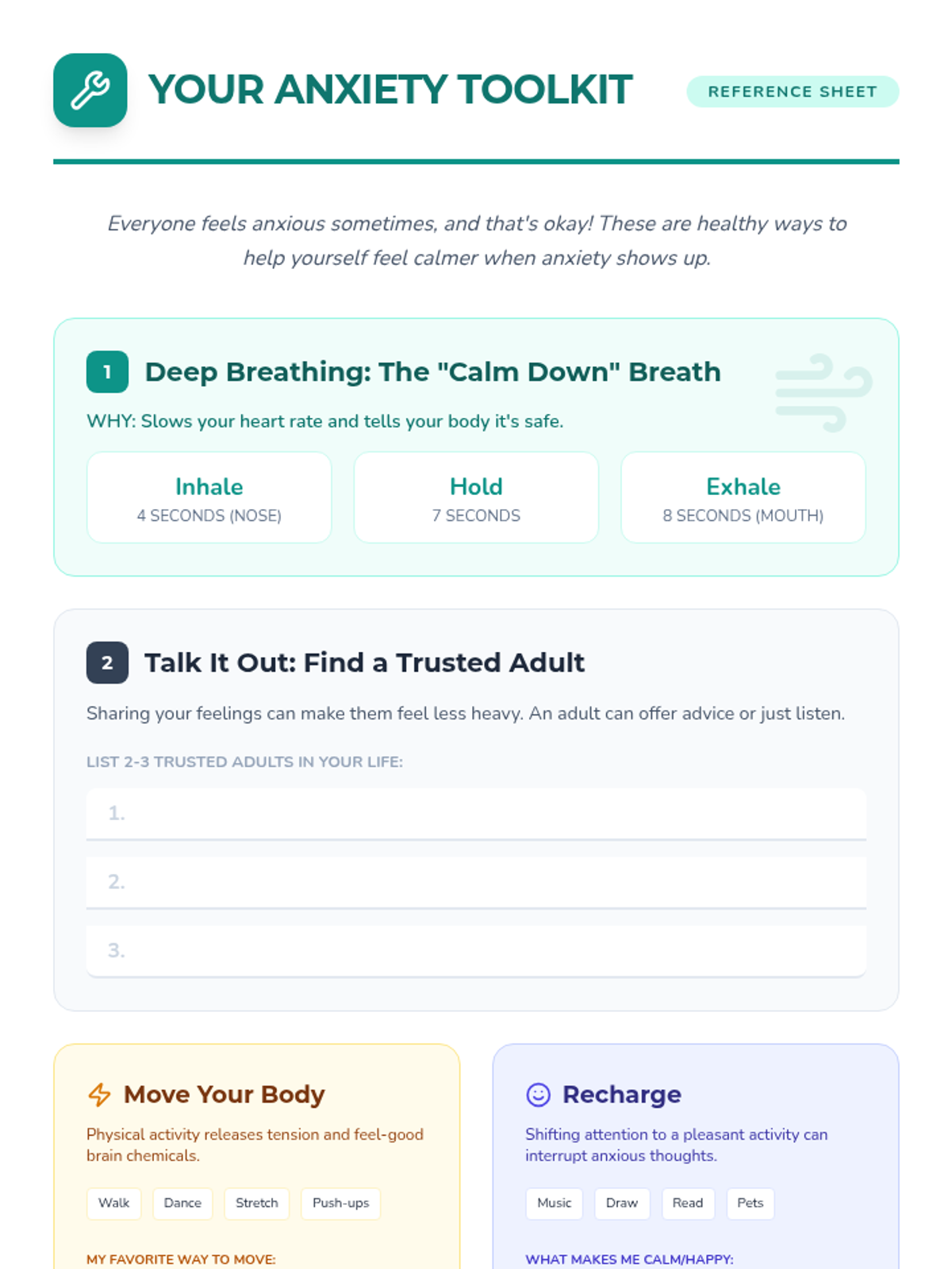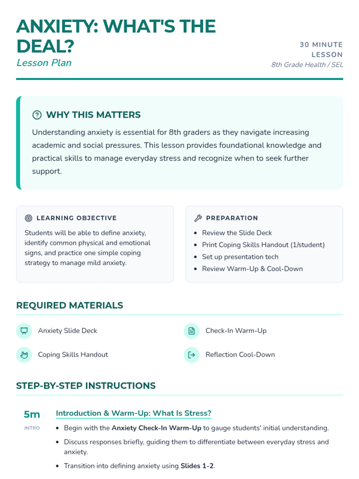 A 30-minute introductory lesson for 8th graders on understanding anxiety, recognizing its signs, and building a toolkit of initial coping strategies.