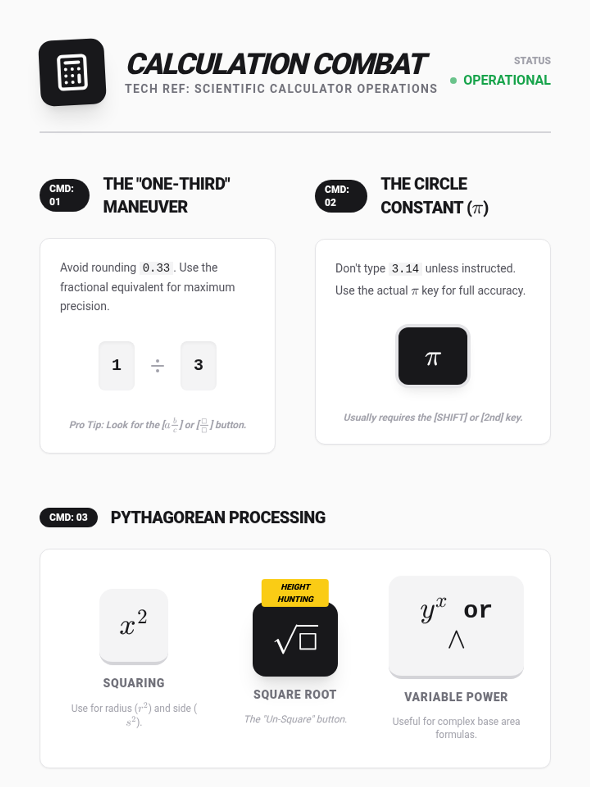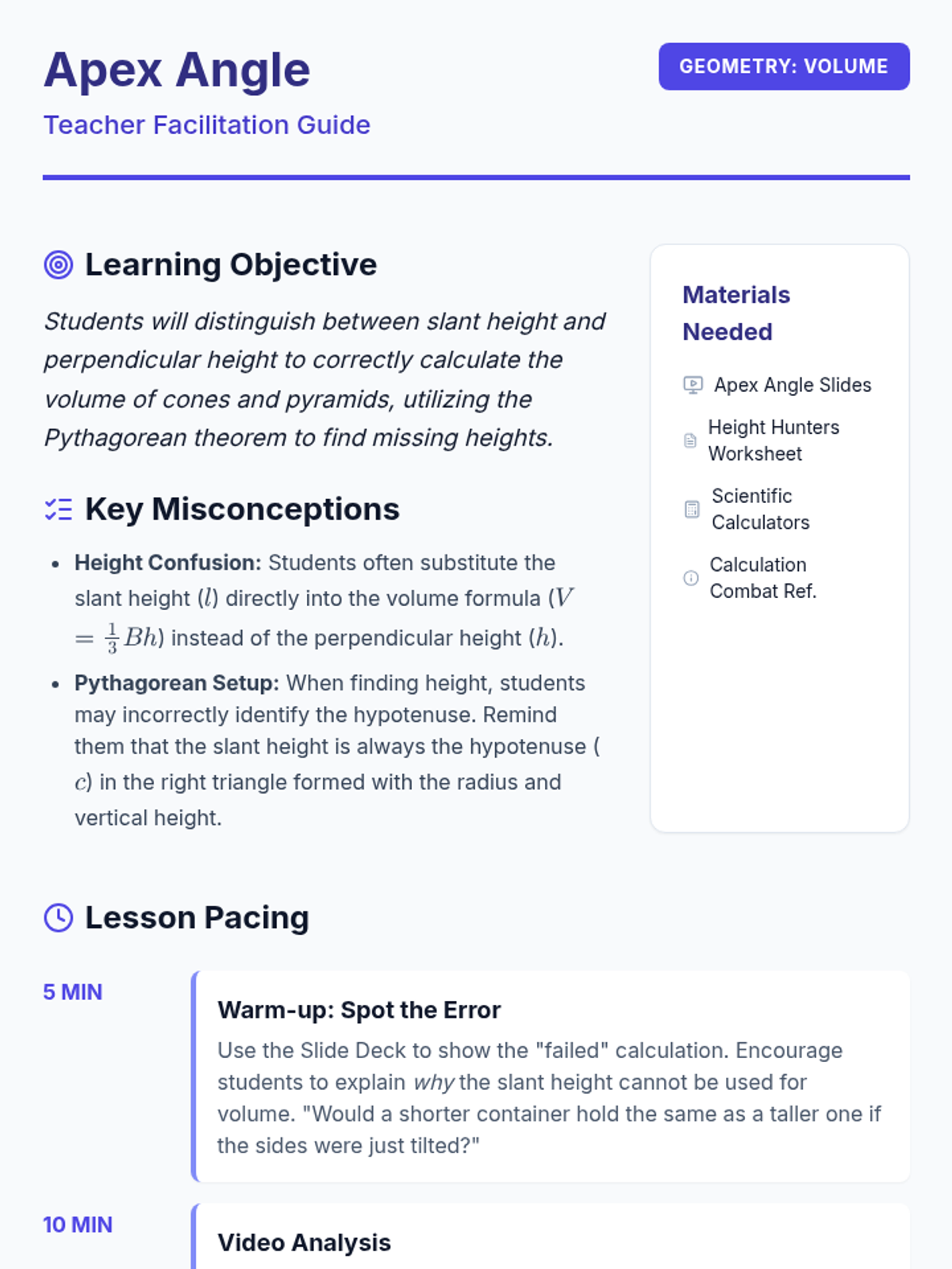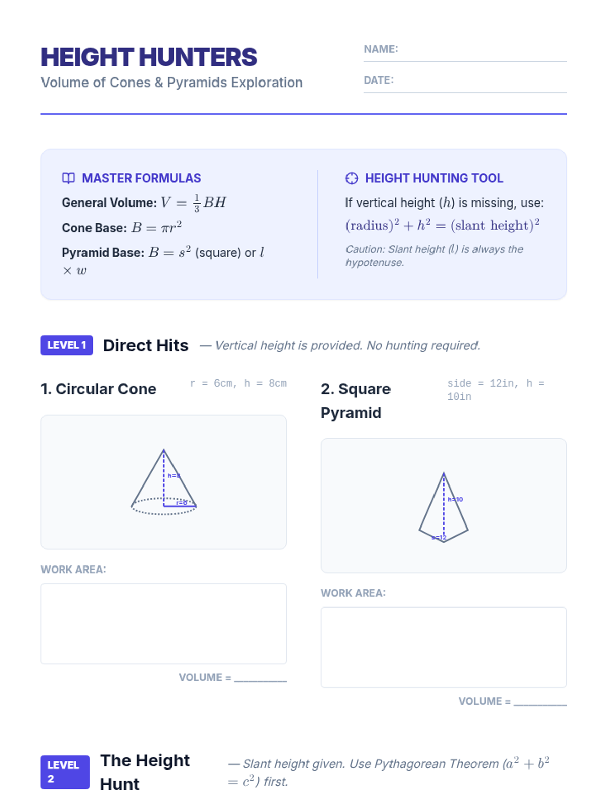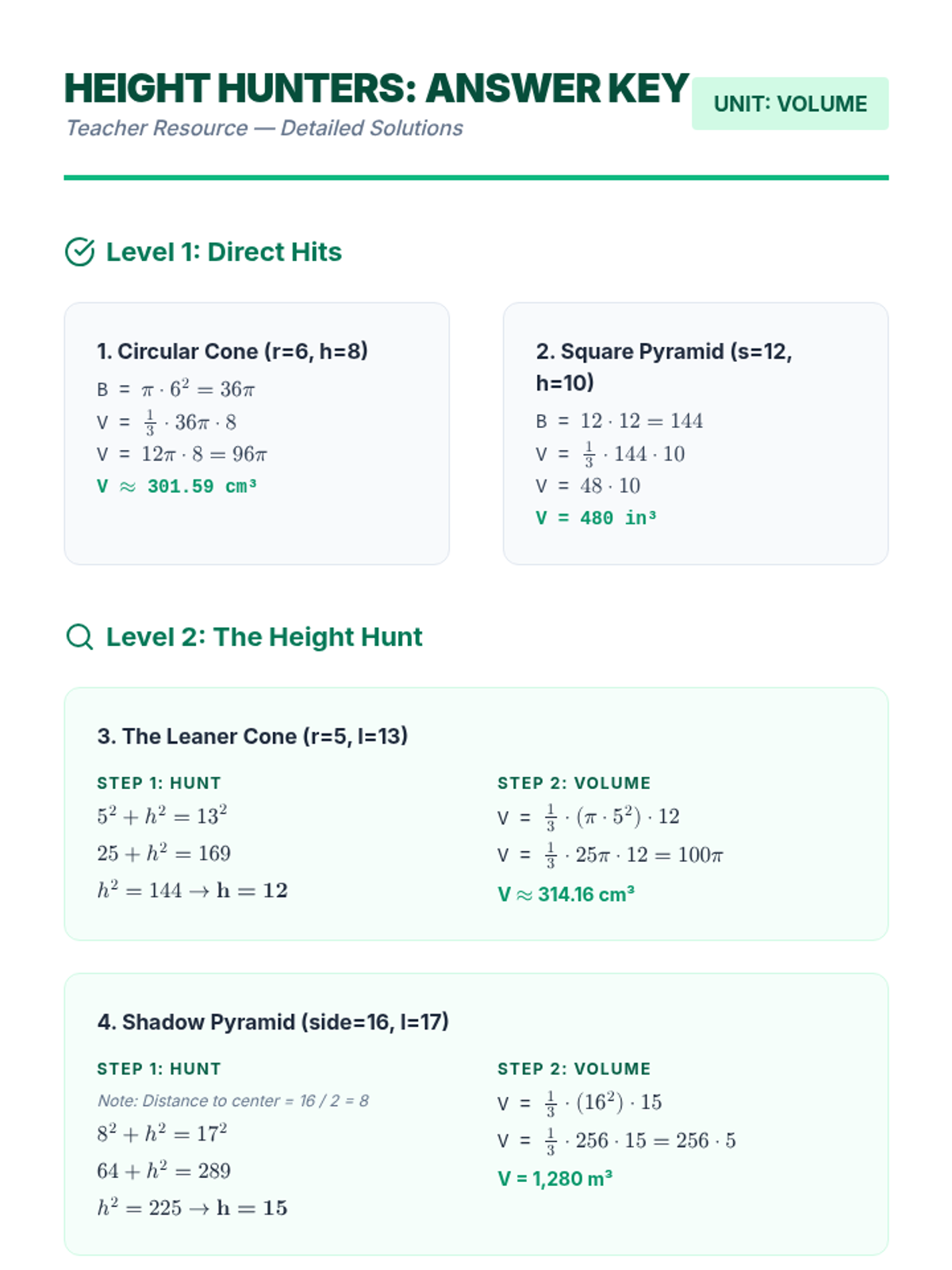 A high-school geometry lesson focused on differentiating between perpendicular height and slant height when calculating the volume of cones and pyramids, featuring the Pythagorean theorem for 'hunting' missing heights.