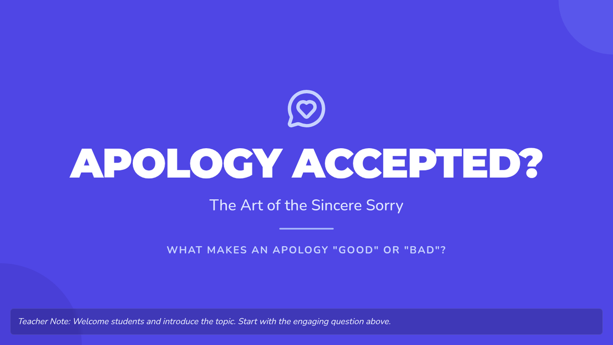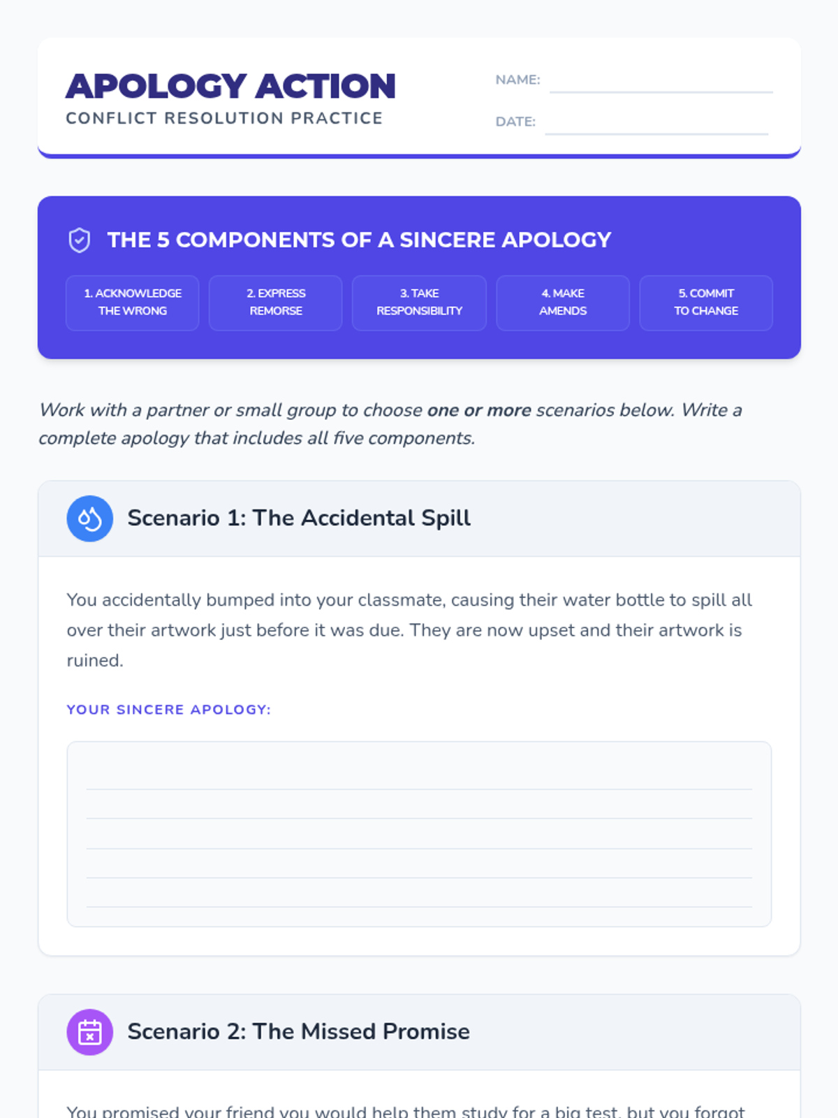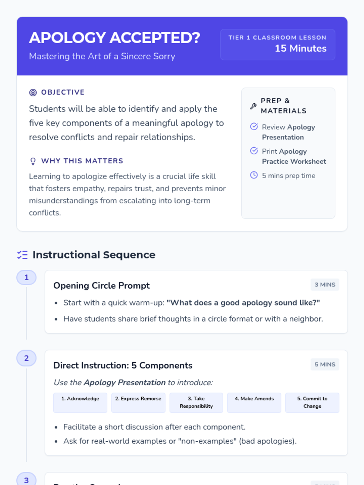 A 15-minute lesson for 6th-grade students on the five essential components of a sincere and effective apology to help build stronger relationships and resolve conflicts.