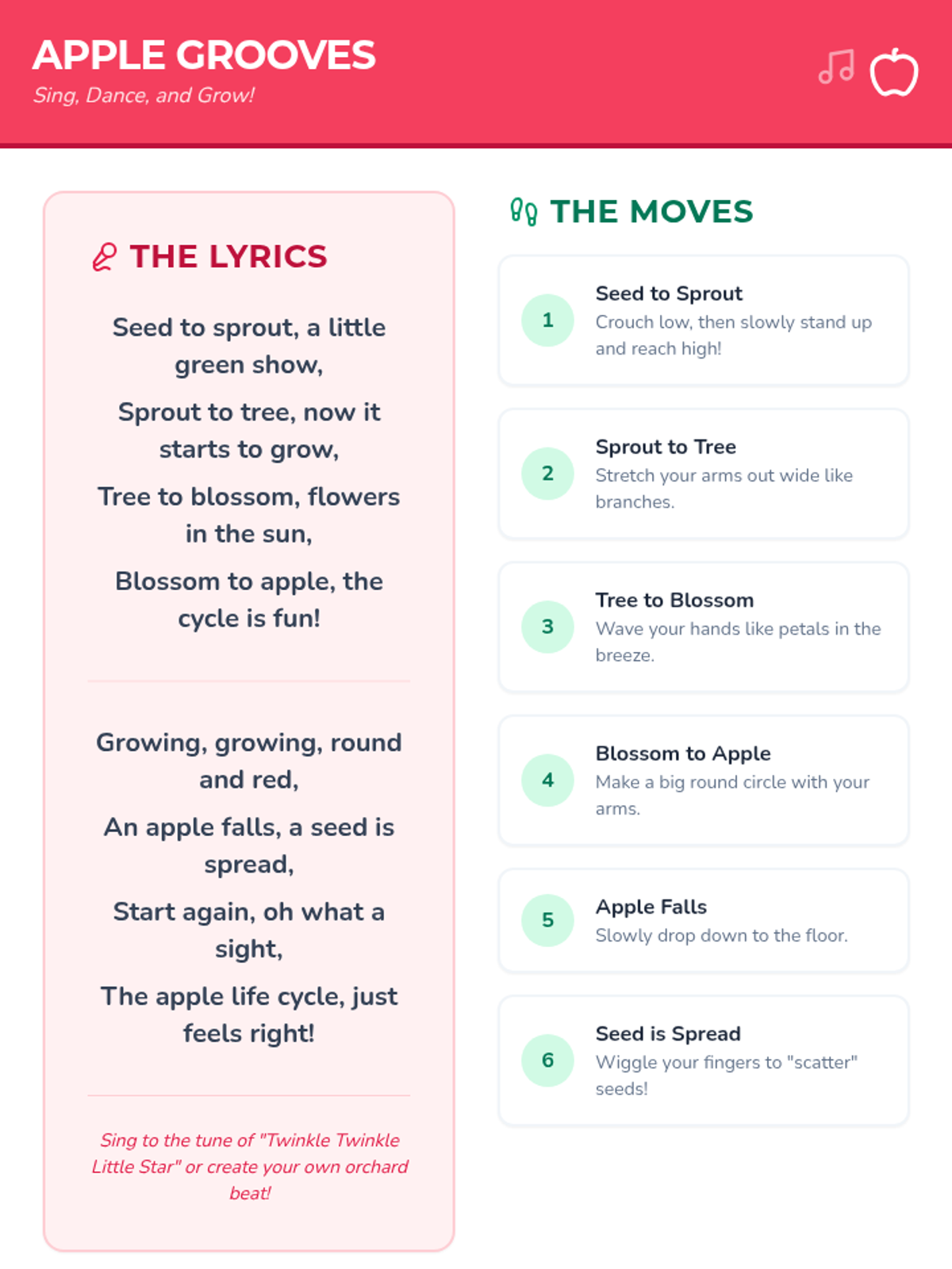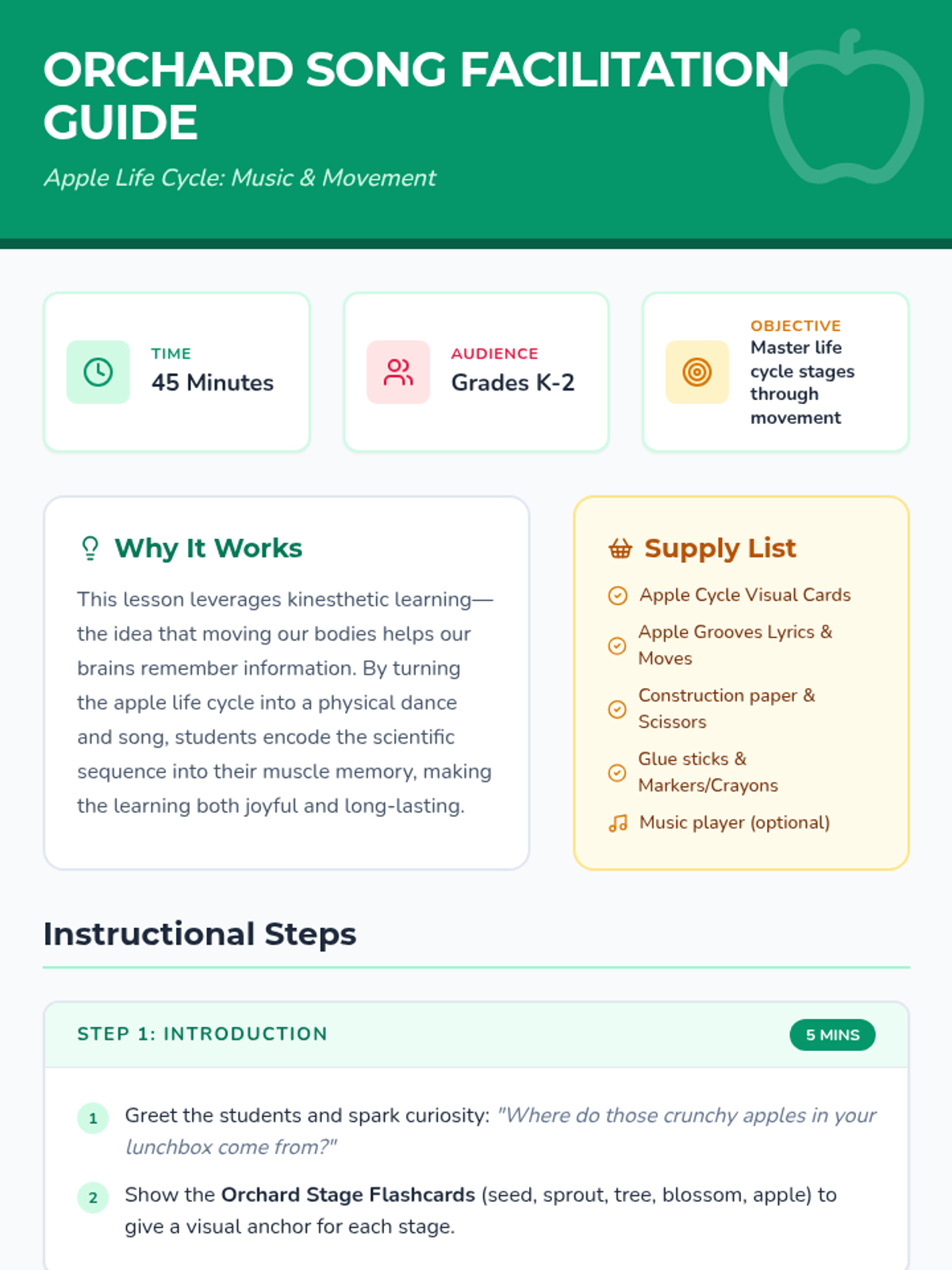 Students will learn a song and dance that explains the apple life cycle, using kinesthetic movement and a hands-on paper craft to reinforce learning.