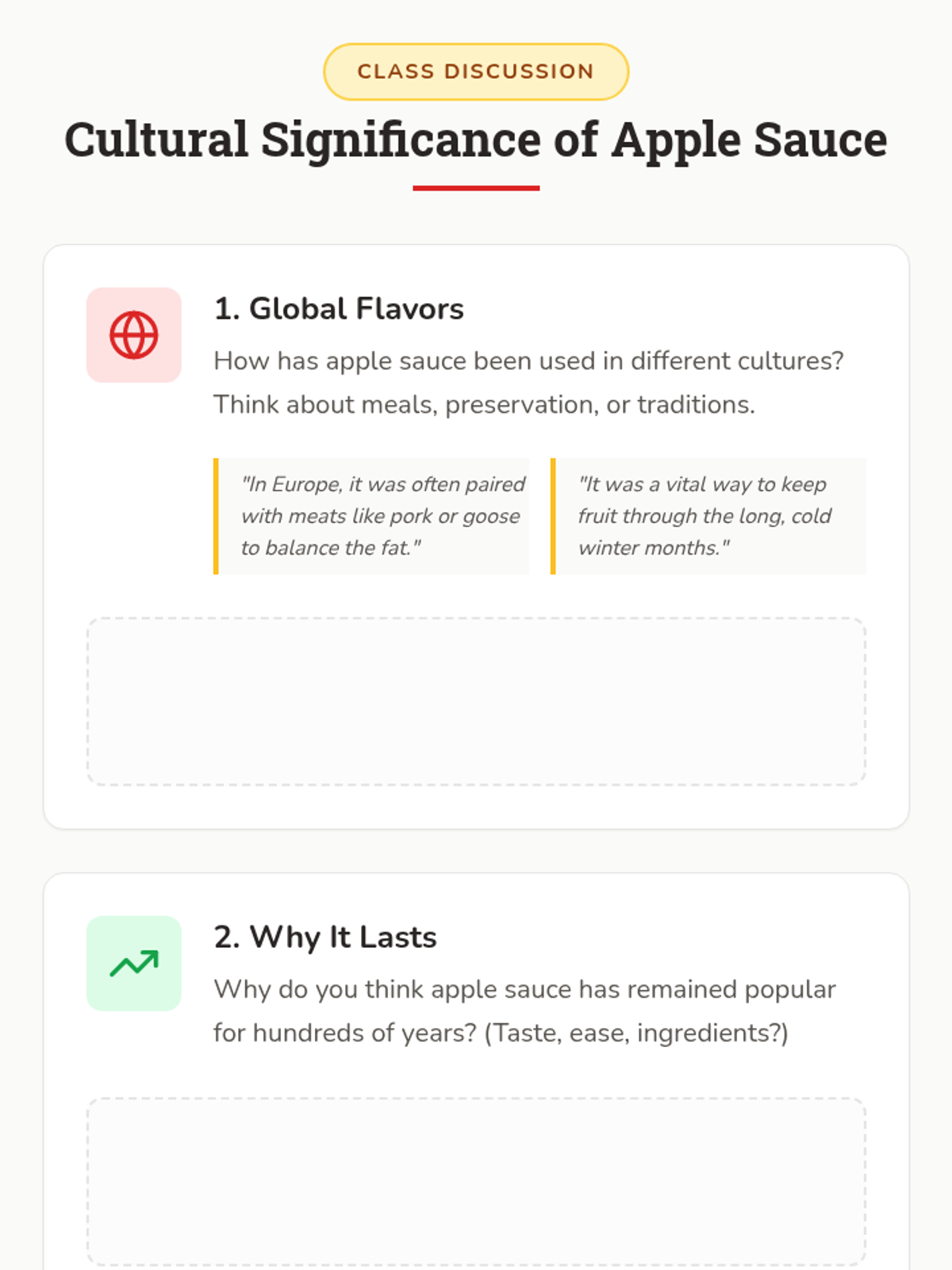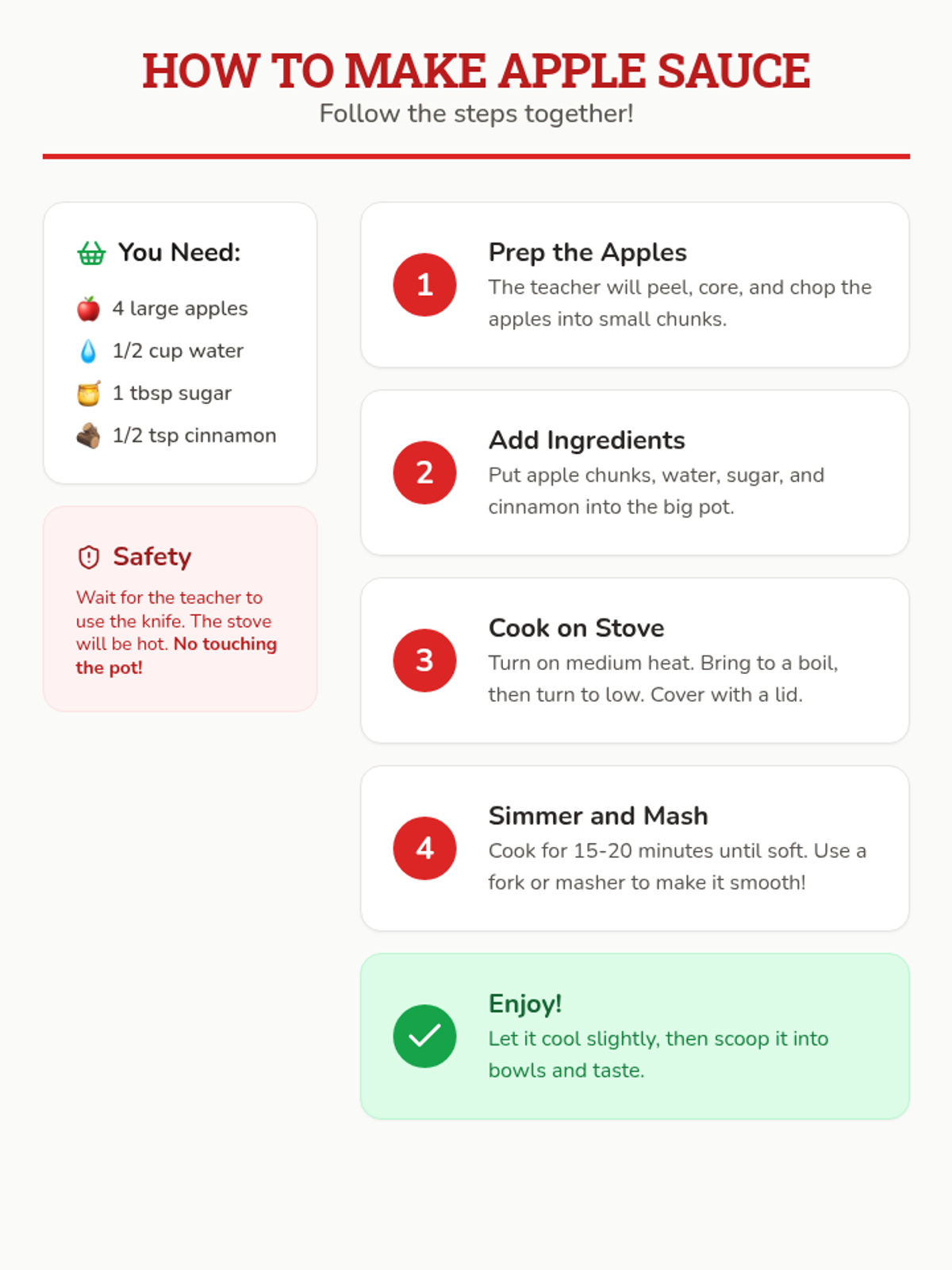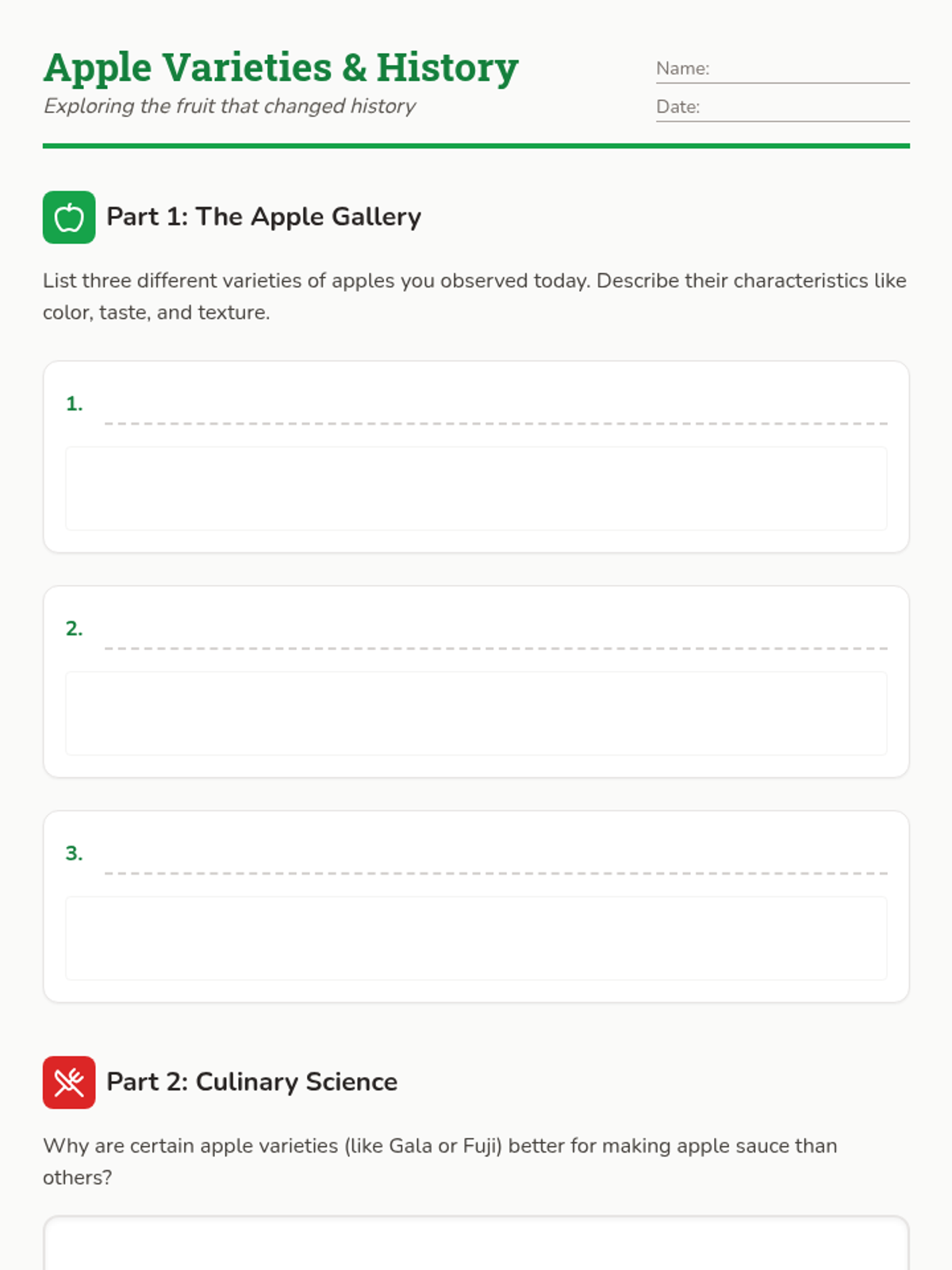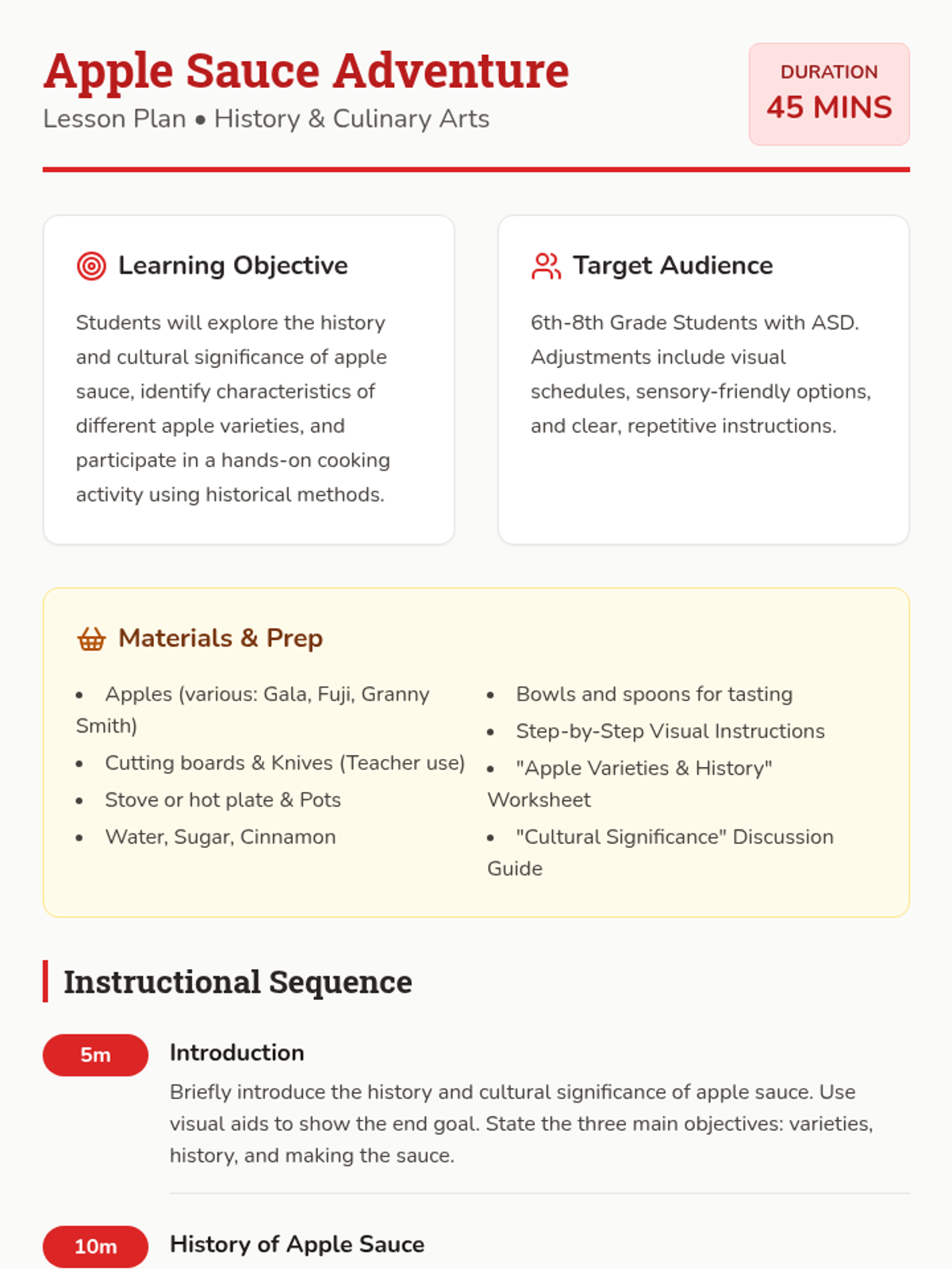 A hands-on lesson exploring the historical origins, cultural significance, and culinary science of apple sauce, specifically designed for middle school students with ASD. Students will identify apple varieties and participate in a guided cooking activity.