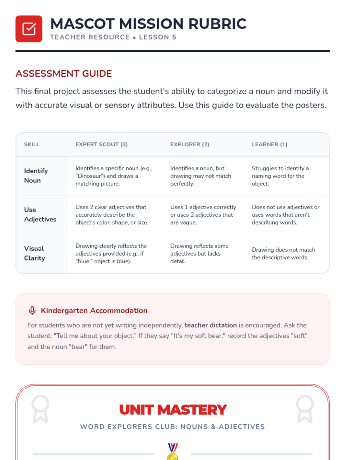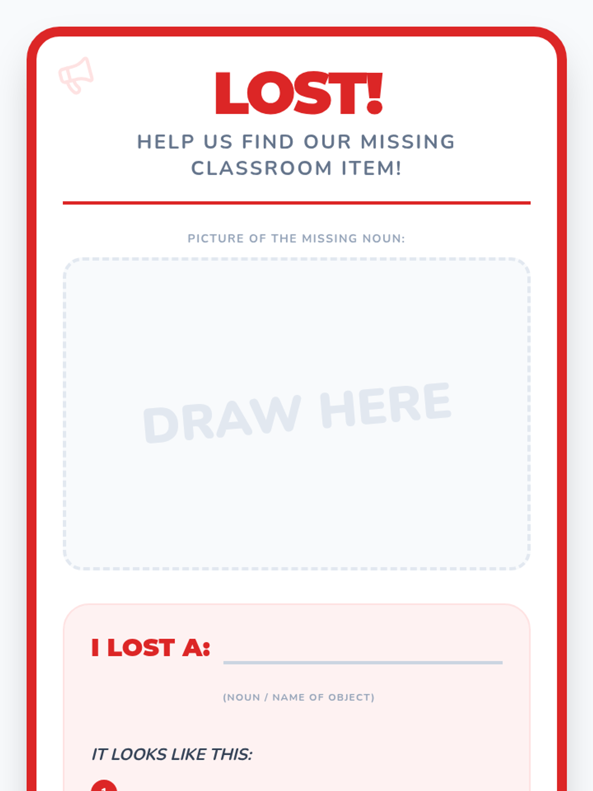 Students apply their knowledge of nouns and adjectives to create a descriptive 'Lost and Found' poster for a classroom object.