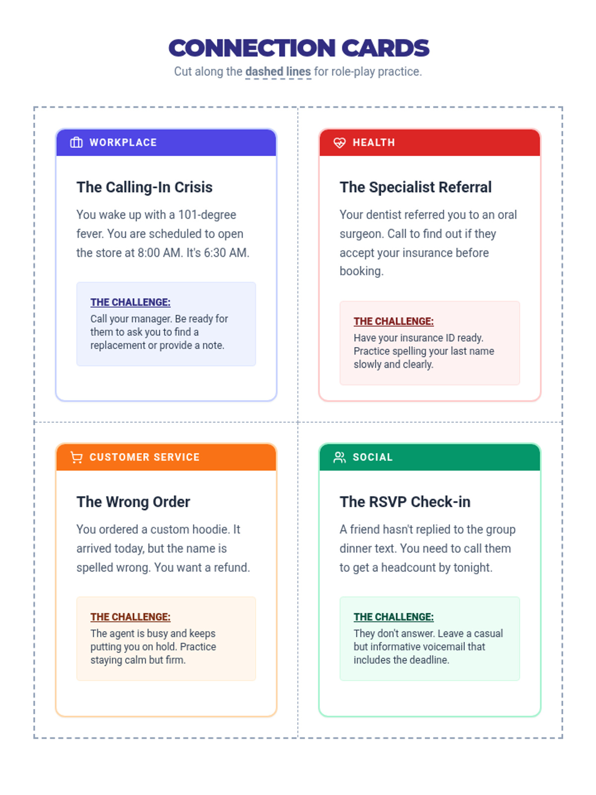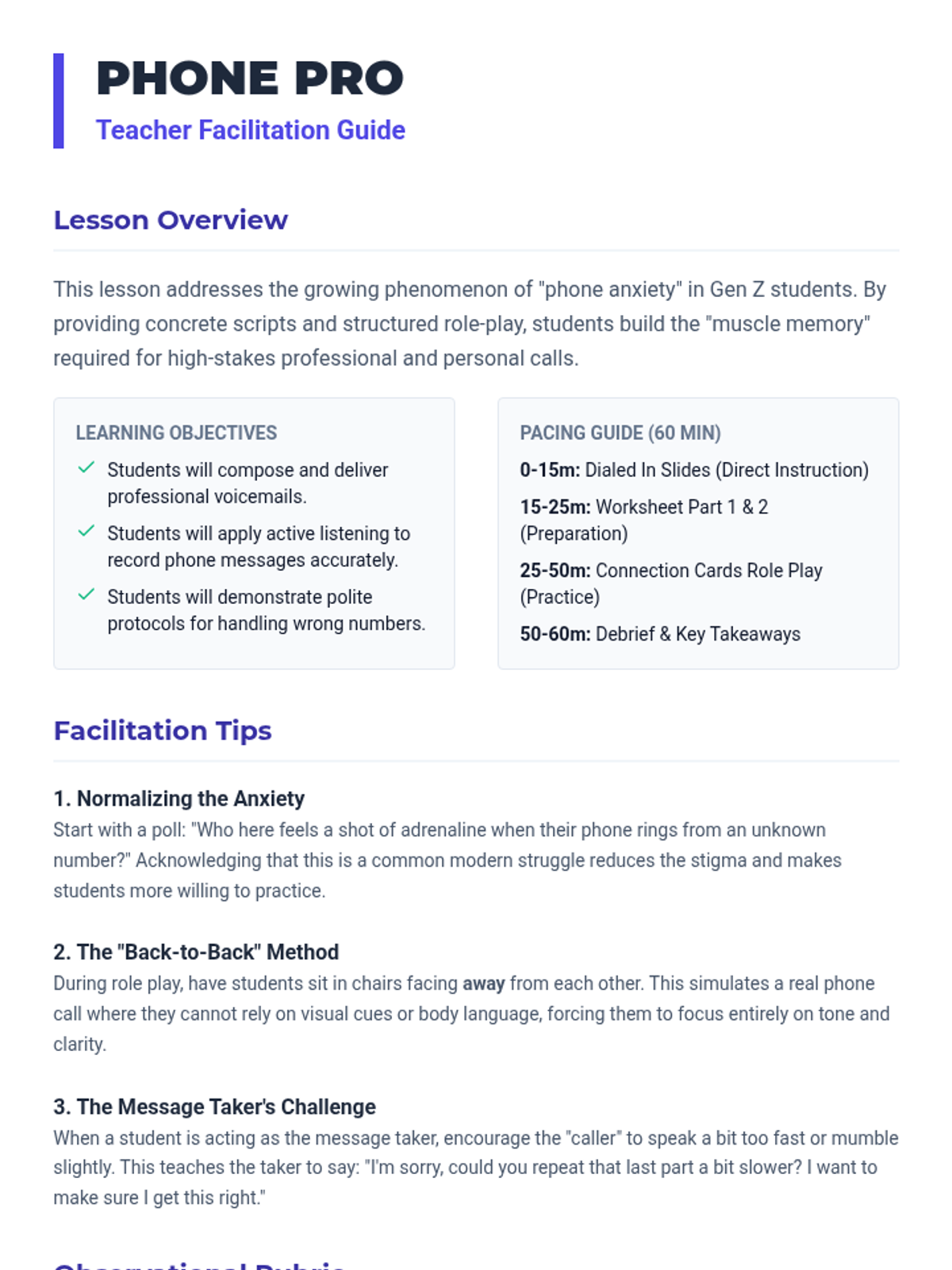 A comprehensive lesson designed to help high school seniors master the art of professional and personal phone communication, focusing on overcoming anxiety and handling diverse scenarios.