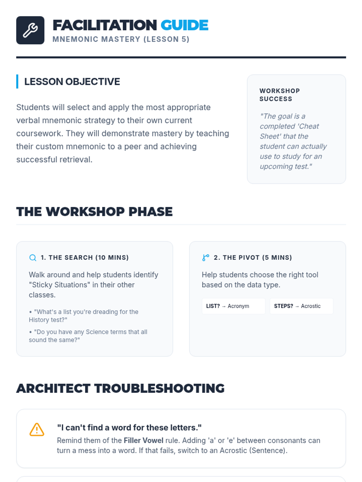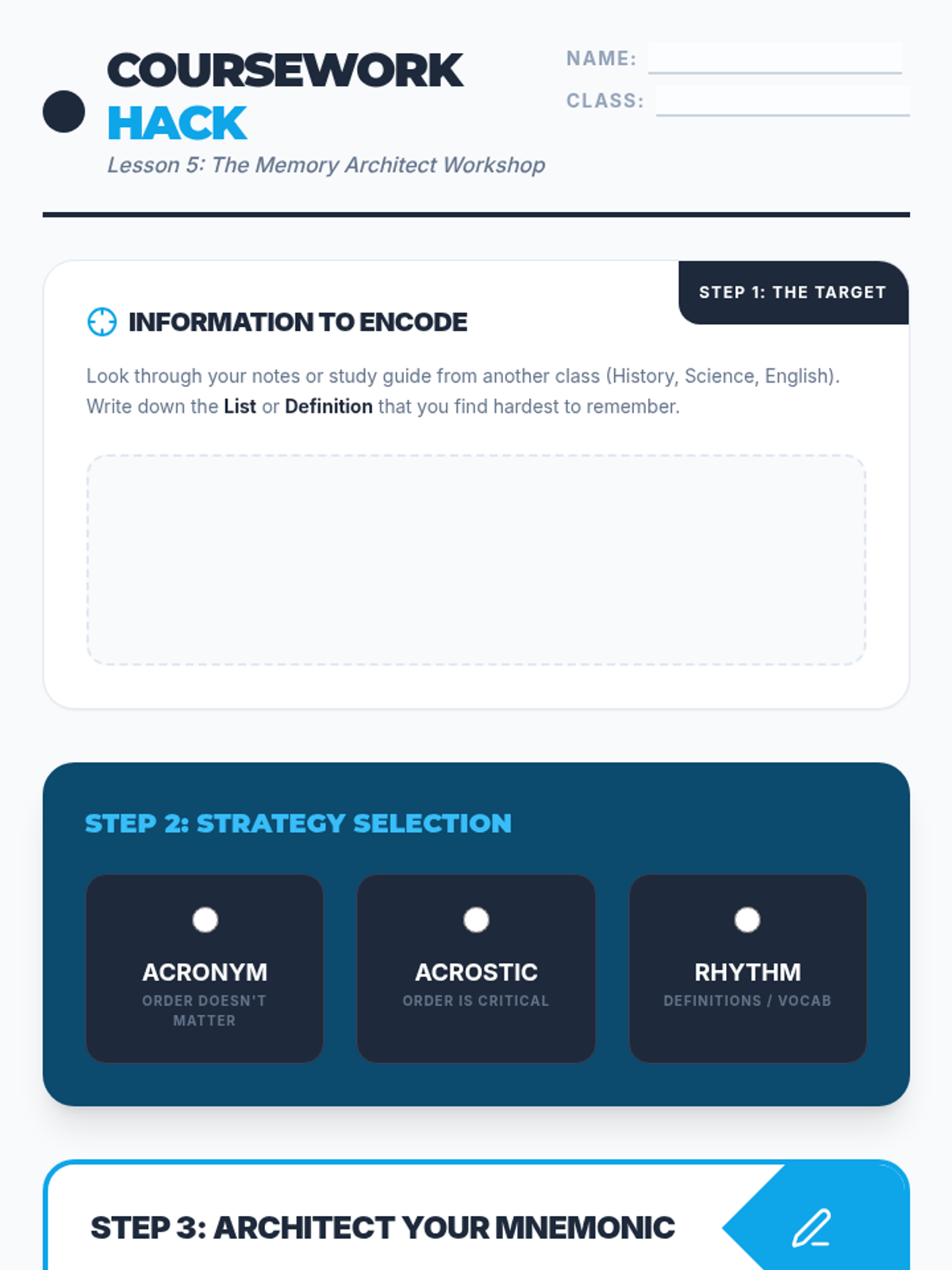A culminating workshop where students apply their selected mnemonic strategies to materials from their current classes.