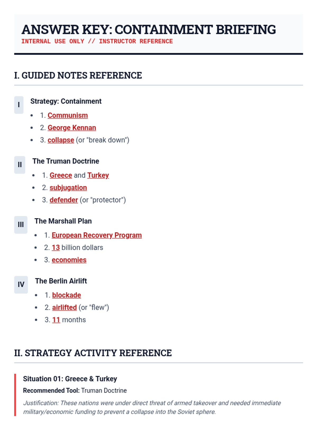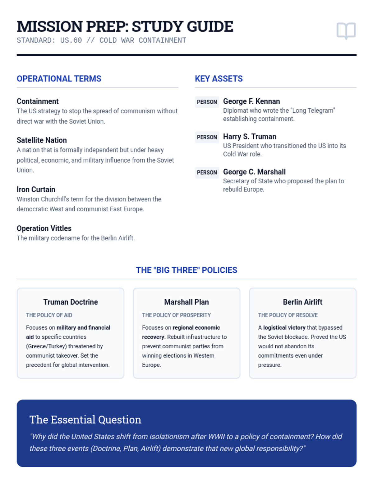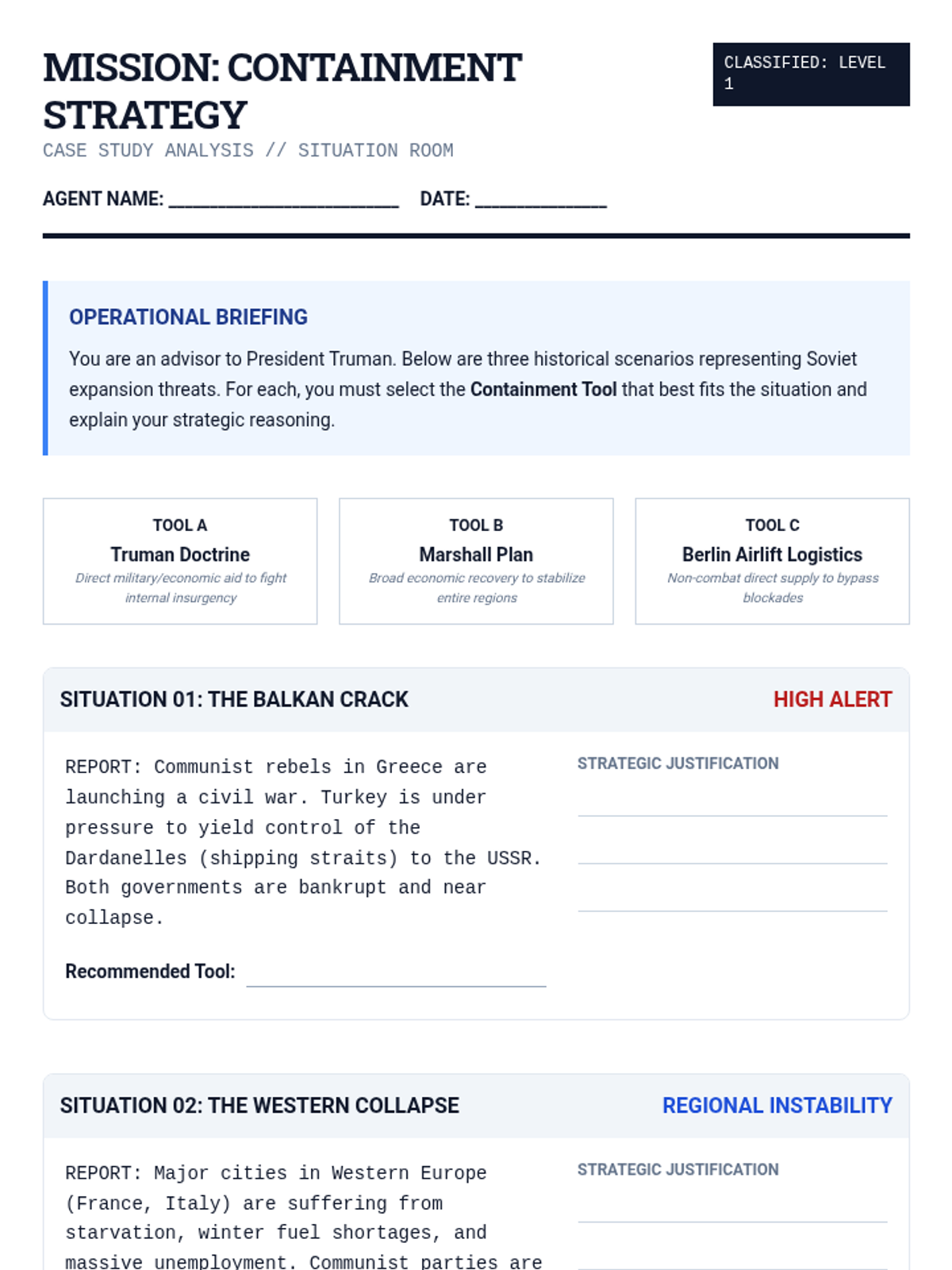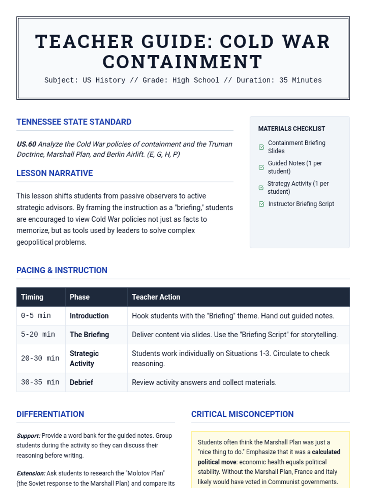 A 35-minute lesson analyzing the Cold War policies of containment, the Truman Doctrine, the Marshall Plan, and the Berlin Airlift. This lesson uses a military-intelligence 'briefing' theme to engage students in strategic historical analysis.