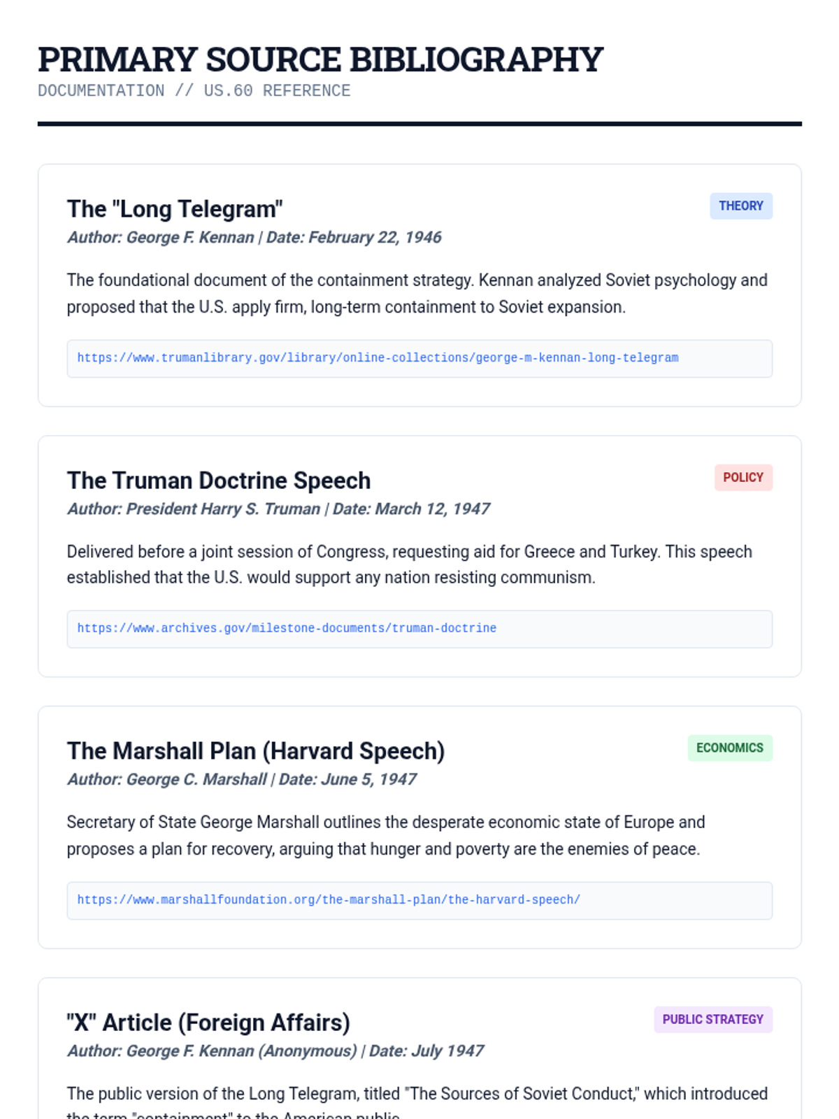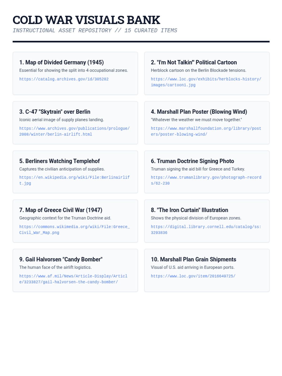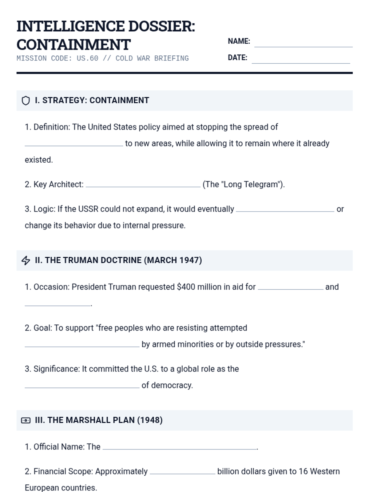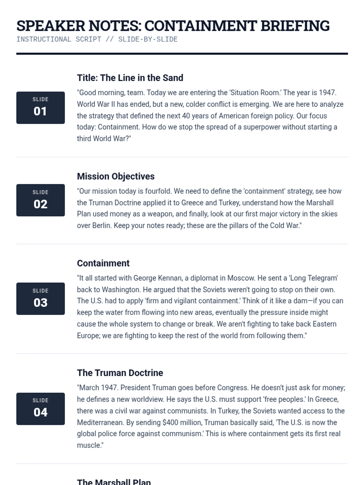 A 35-minute lesson analyzing the Cold War policies of containment, the Truman Doctrine, the Marshall Plan, and the Berlin Airlift. This lesson uses a military-intelligence 'briefing' theme to engage students in strategic historical analysis.