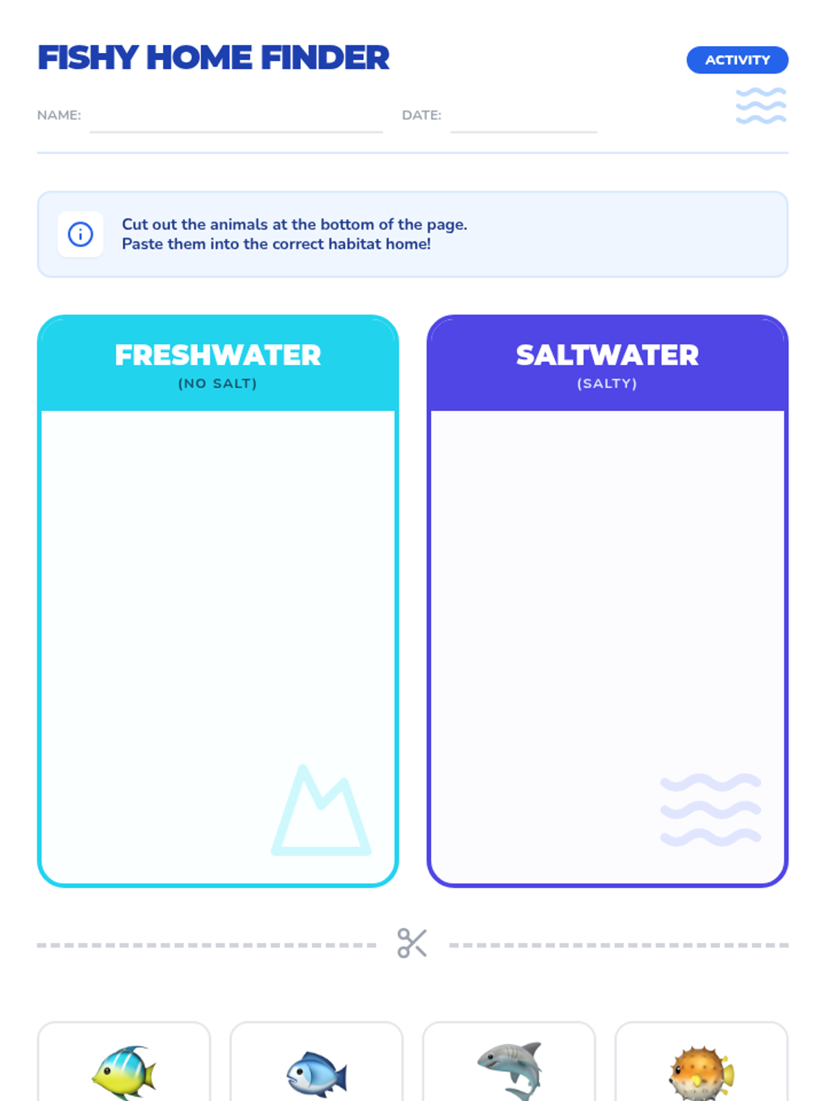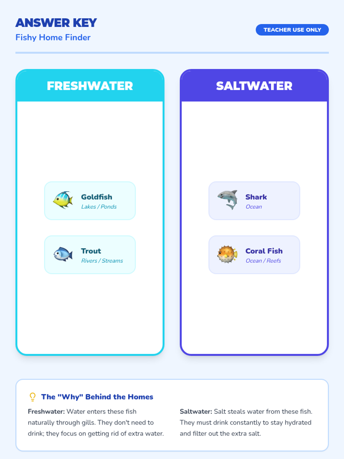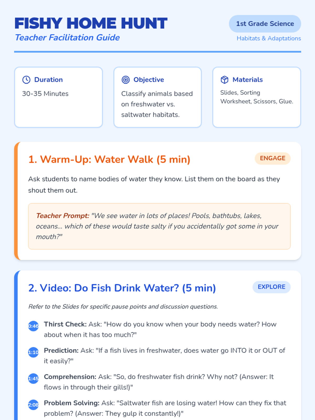 A 1st-grade science lesson exploring the differences between freshwater and saltwater habitats, featuring a SciShow Kids video and an interactive fish-sorting activity.