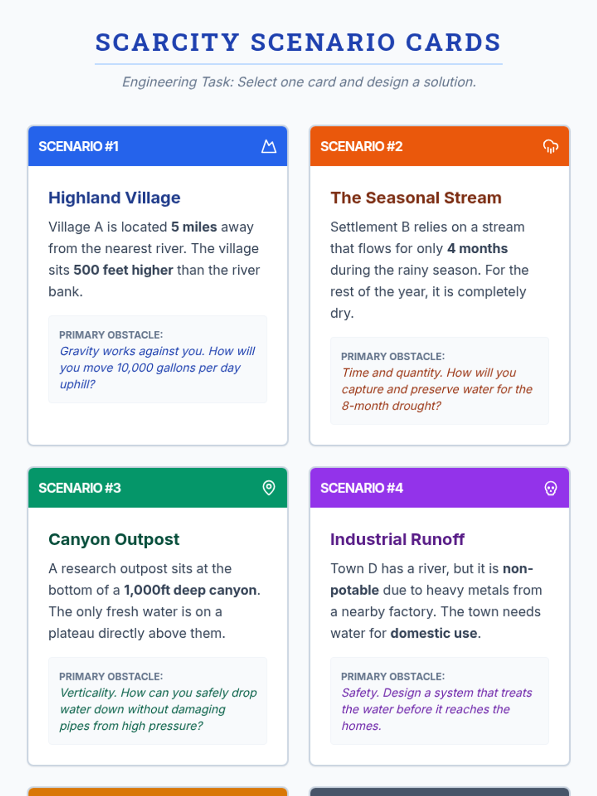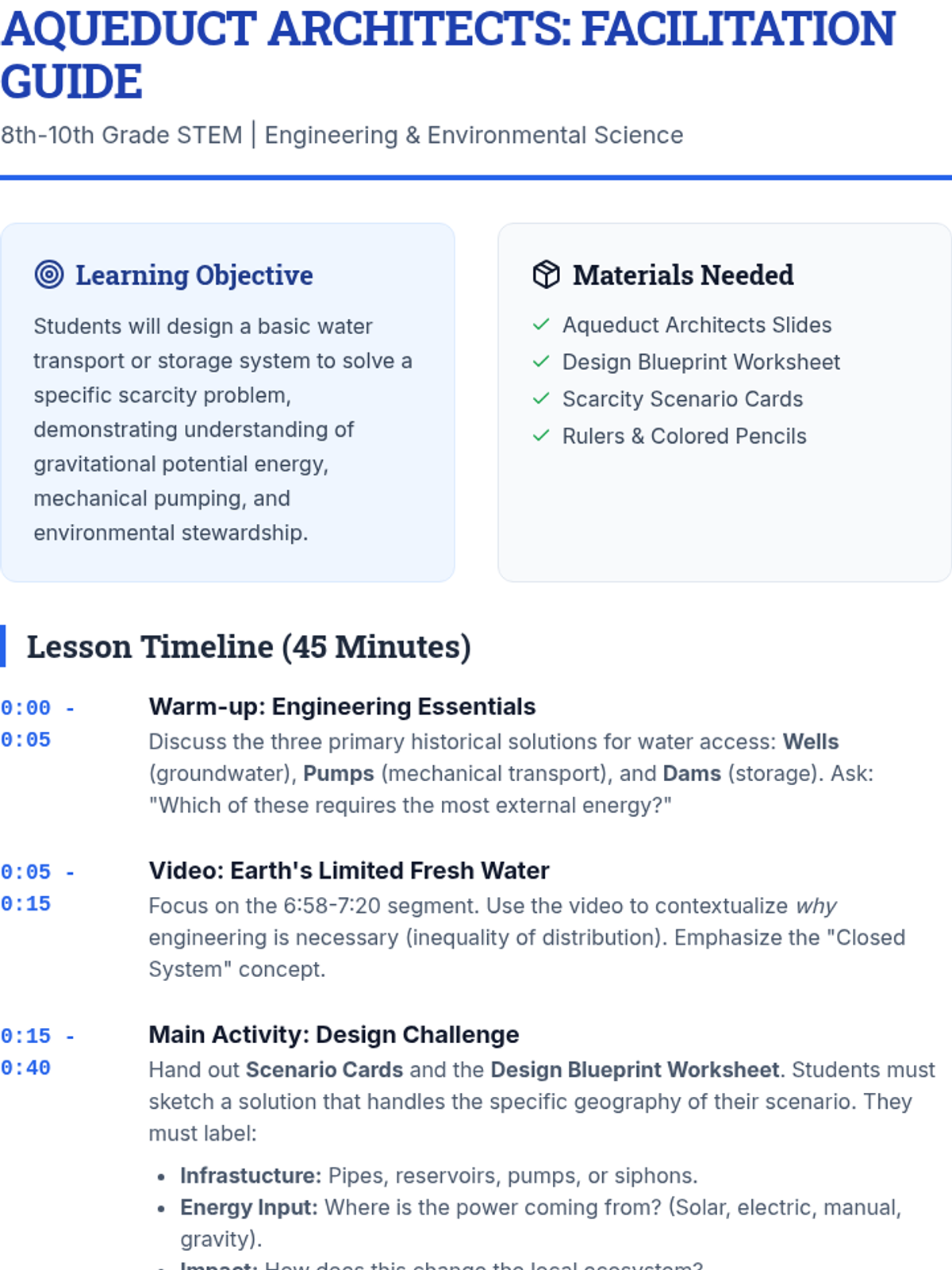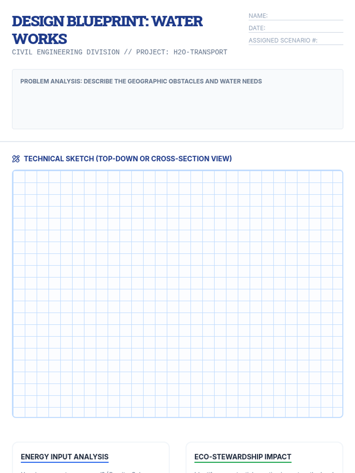 Students investigate the engineering challenges of water scarcity and design a transport or storage system to deliver fresh water to communities in need, analyzing energy inputs and environmental impacts.