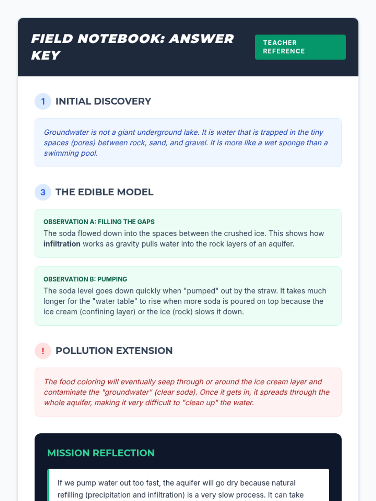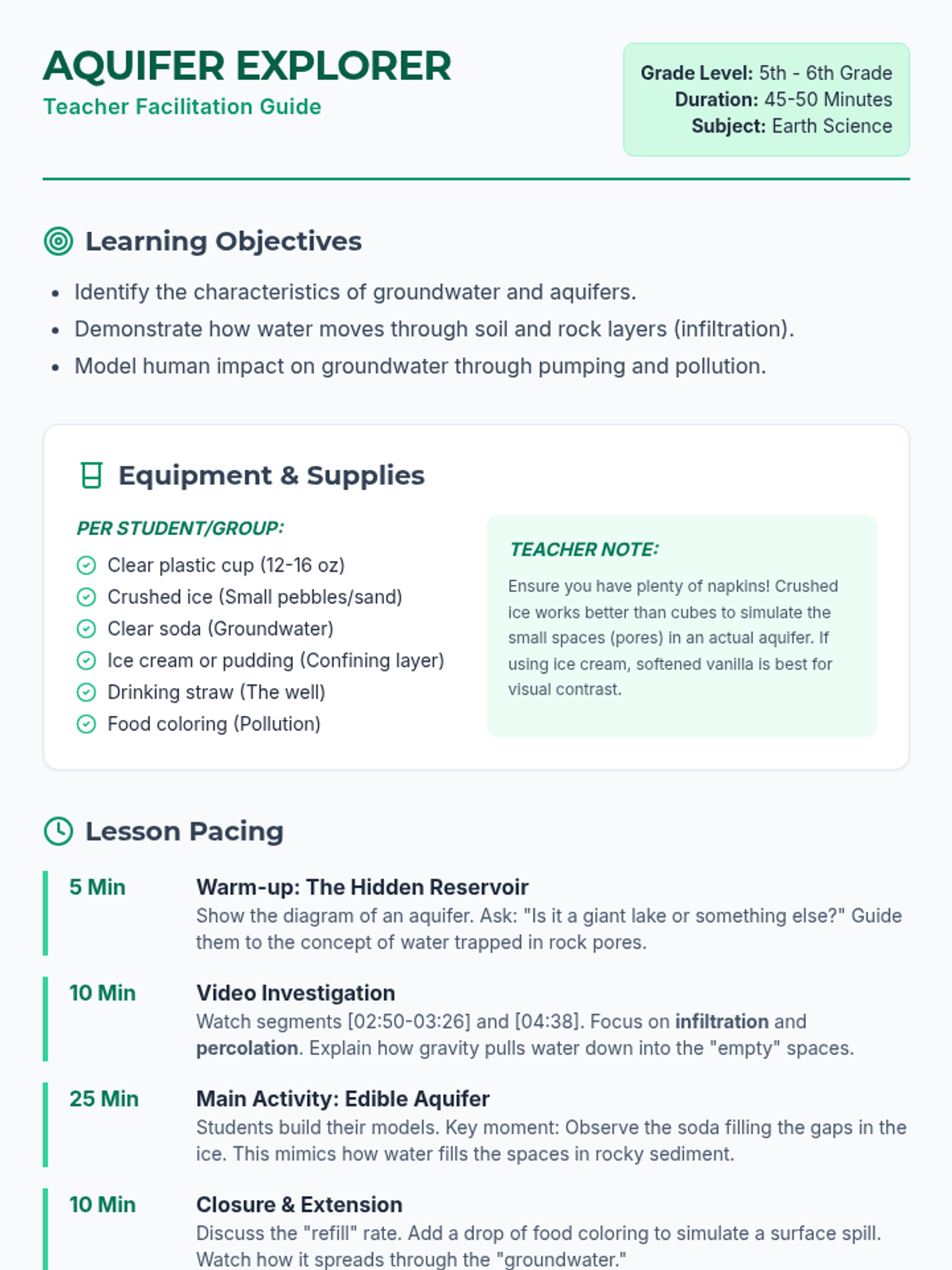 A comprehensive lesson exploring groundwater and aquifers through a hands-on 'edible aquifer' model, focused on infiltration, storage, and conservation.