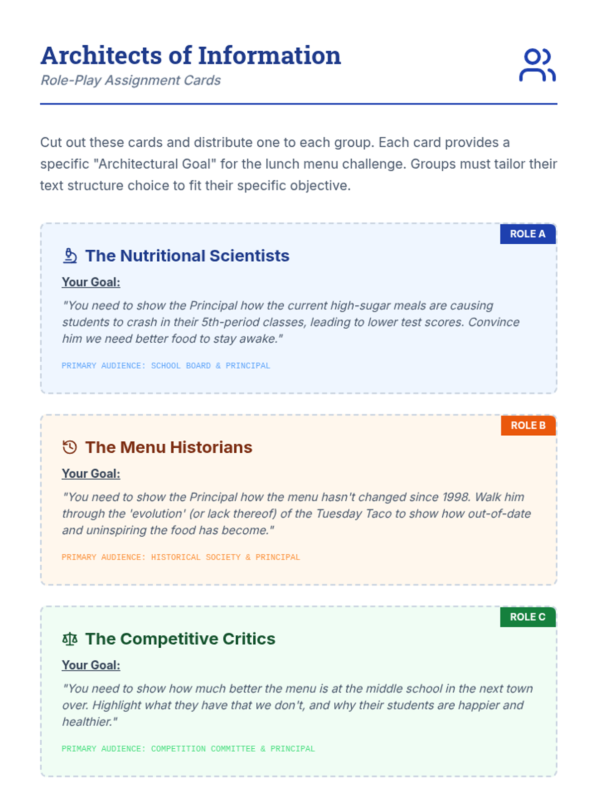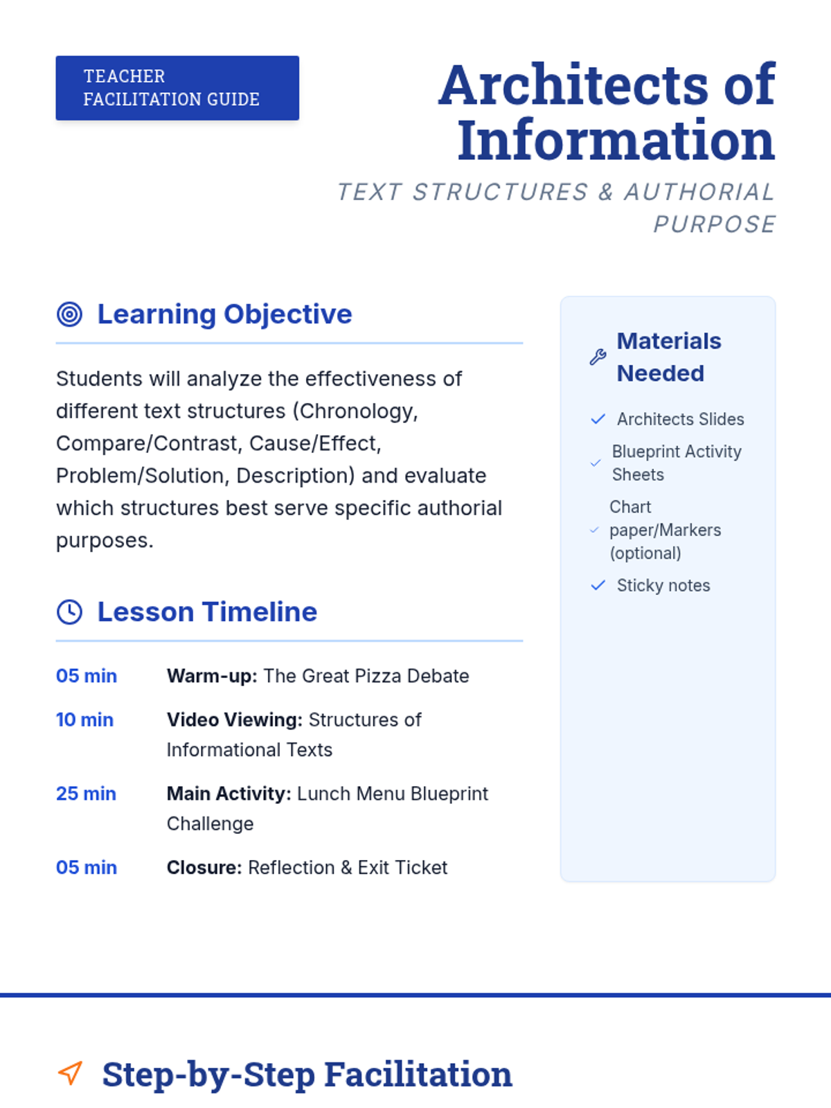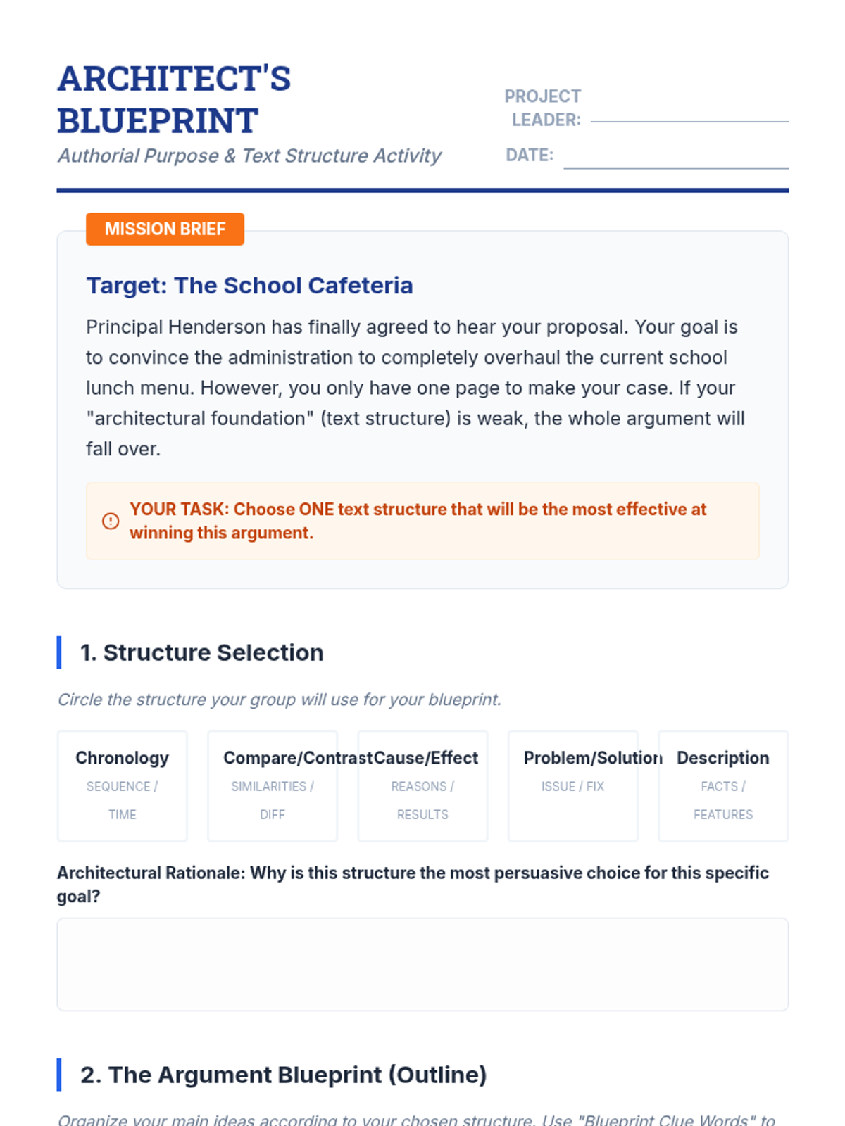 Students explore how writers use text structures as architectural foundations to support their purpose, specifically focusing on which structures are most effective for persuasion.