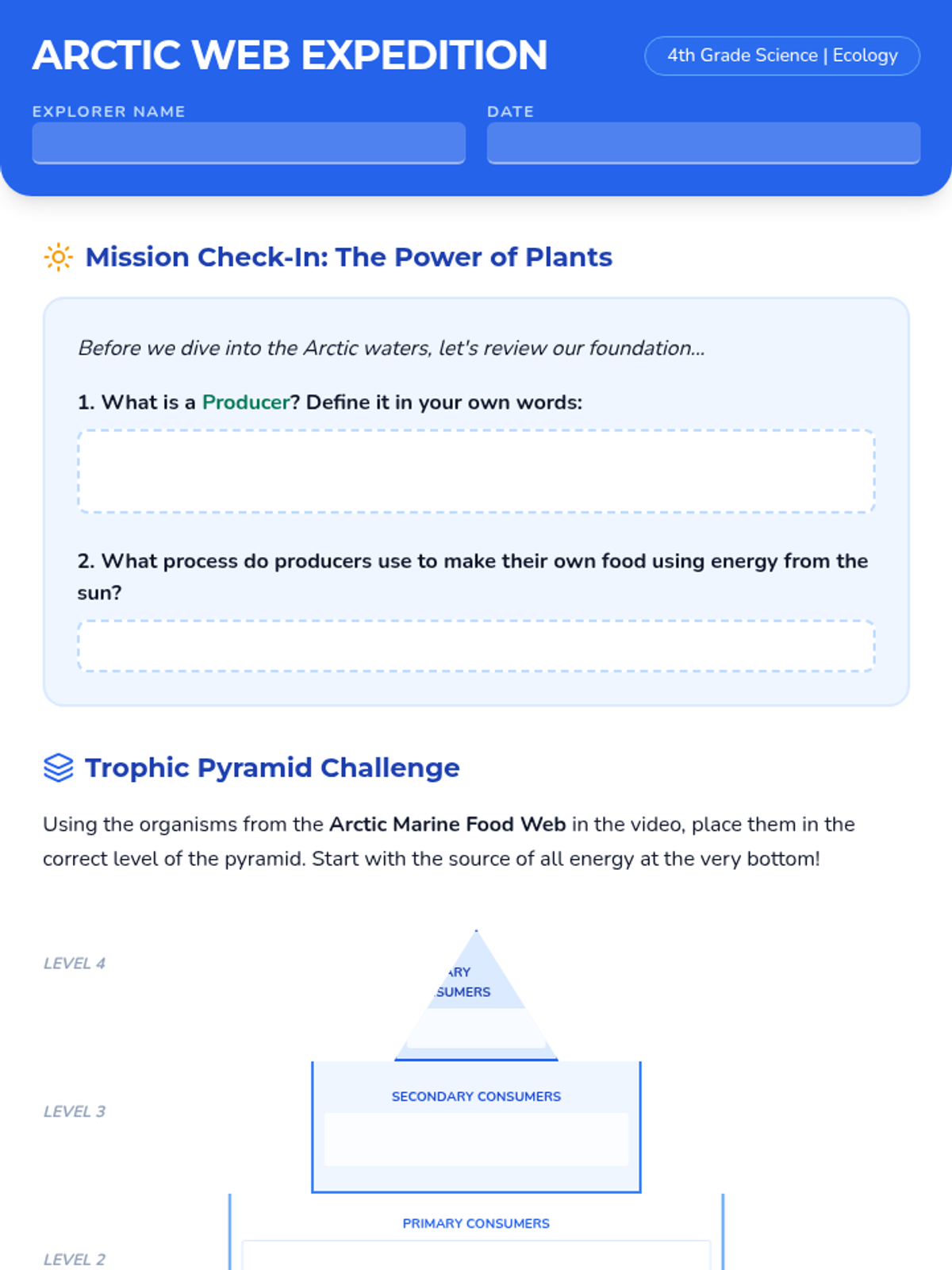 Students will investigate how energy flows through ecosystems by distinguishing between producers and different levels of consumers. They will use an Arctic marine food web as a case study to construct a trophic pyramid and analyze why energy decreases at higher levels.