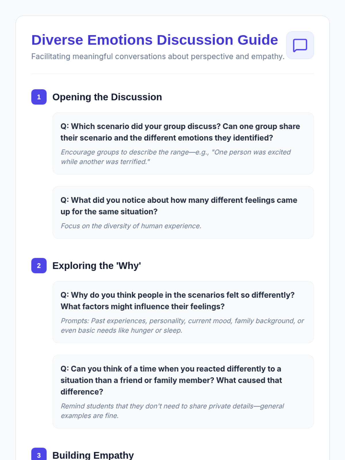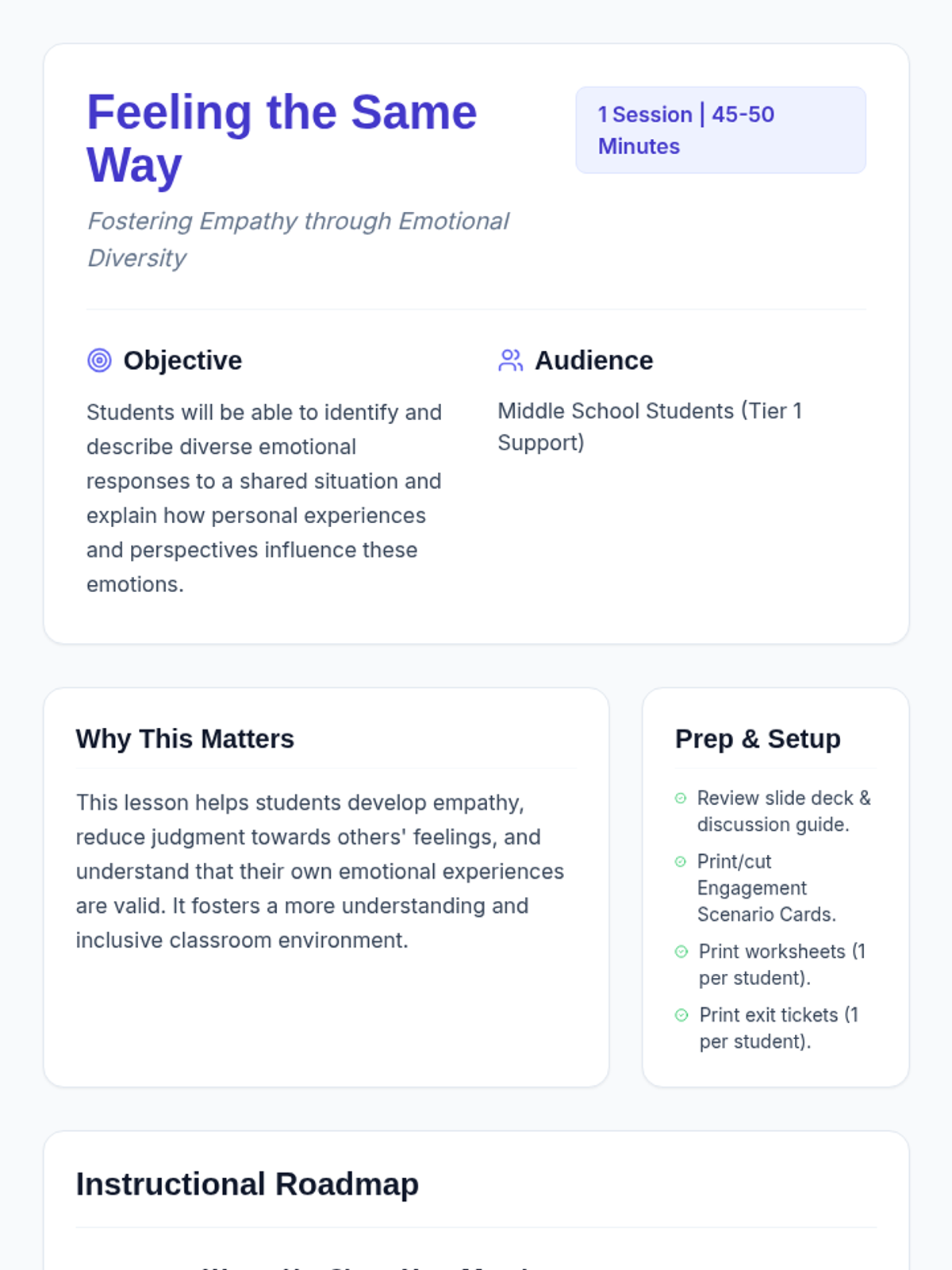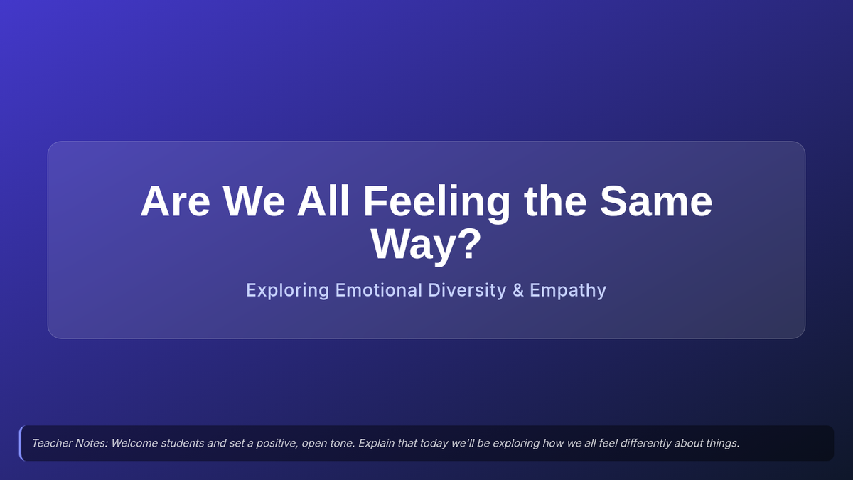 This lesson explores how different individuals can react to the same situation with varying emotions, promoting understanding and respect for diverse emotional responses. It's essential for fostering empathy and reducing judgment among middle school students.