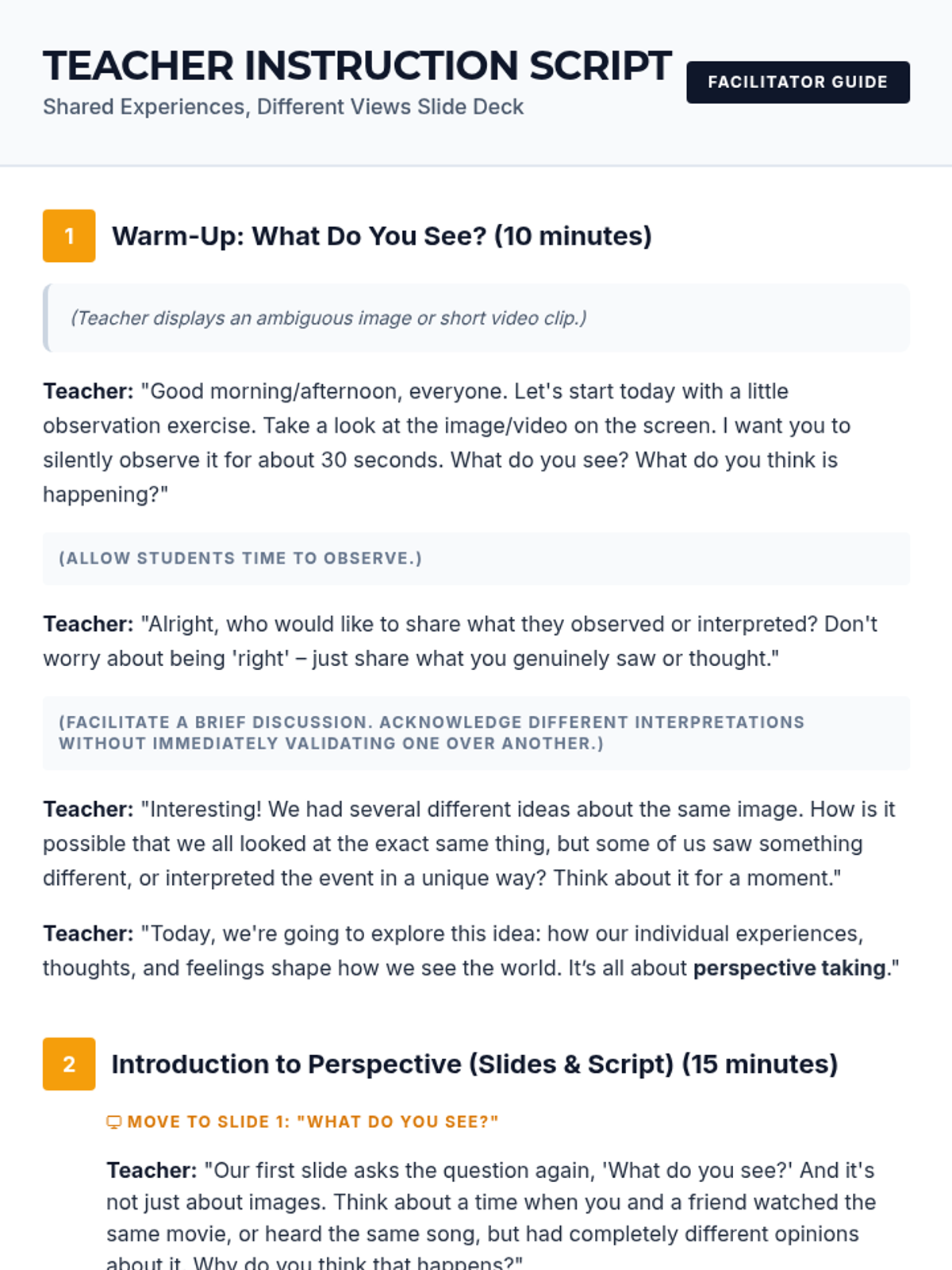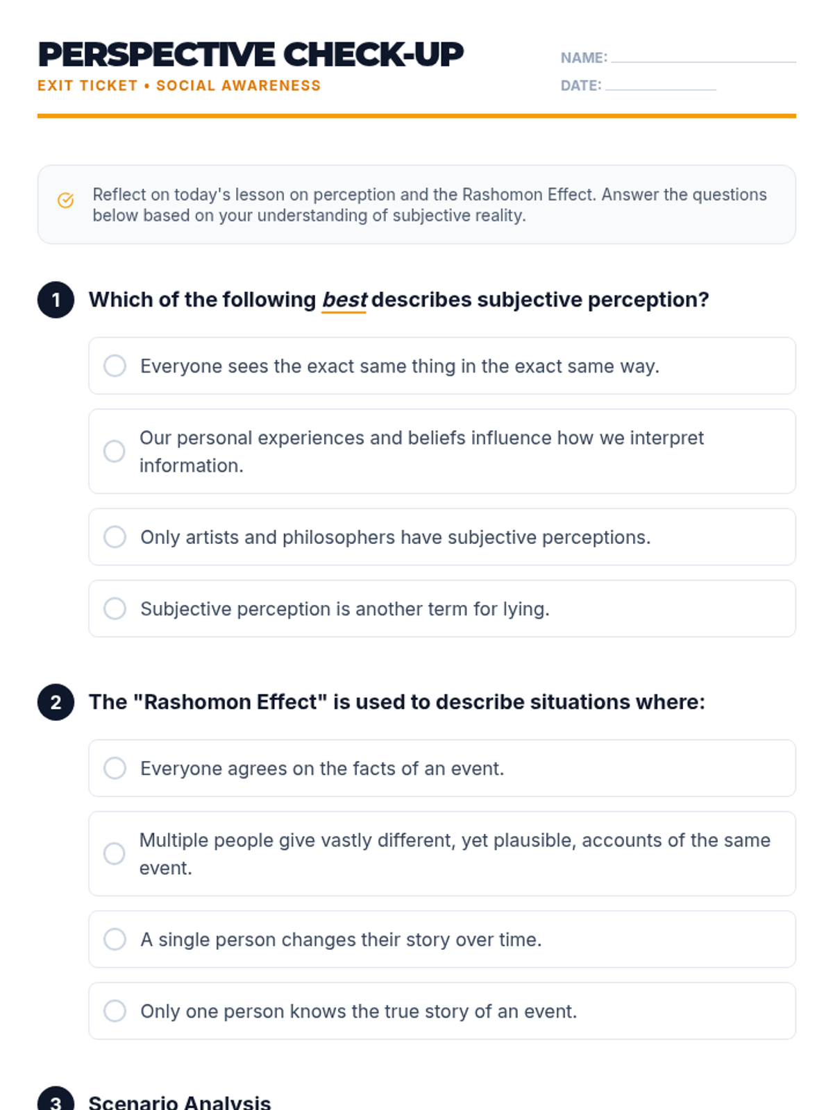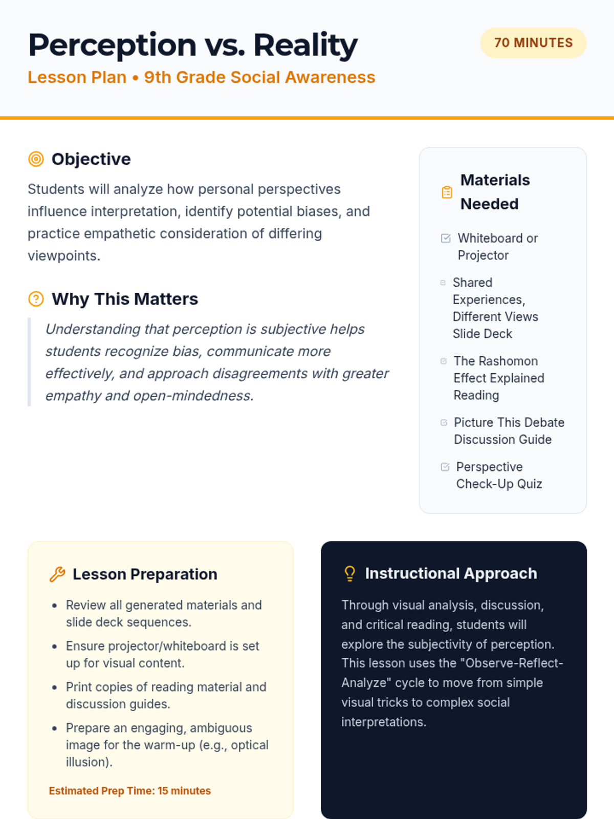 A 70-minute lesson for 9th grade students exploring the subjectivity of perception, the Rashomon Effect, and the importance of empathy in understanding different viewpoints.