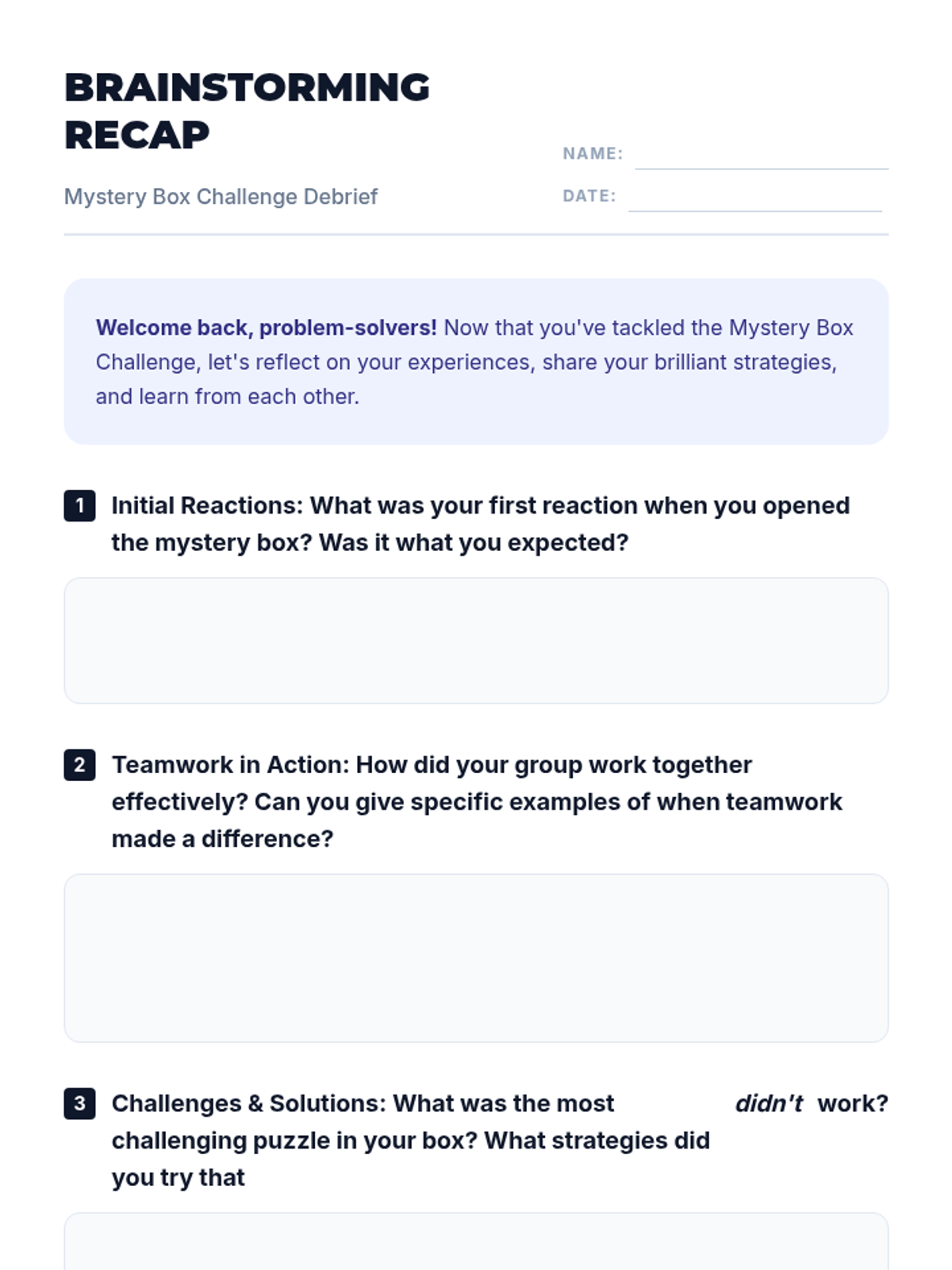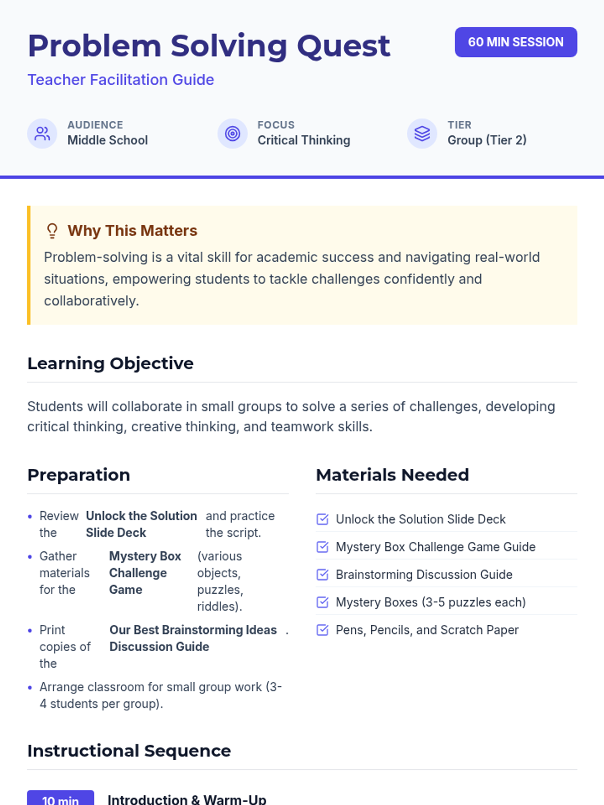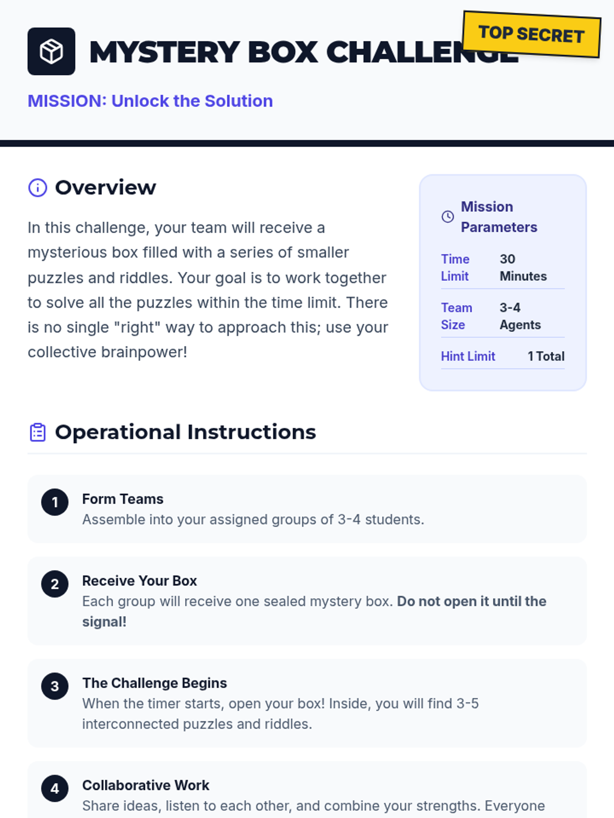 This lesson engages middle school students in collaborative challenges to develop critical thinking, creative problem-solving, and teamwork skills through a 'Mystery Box' escape-room style activity.