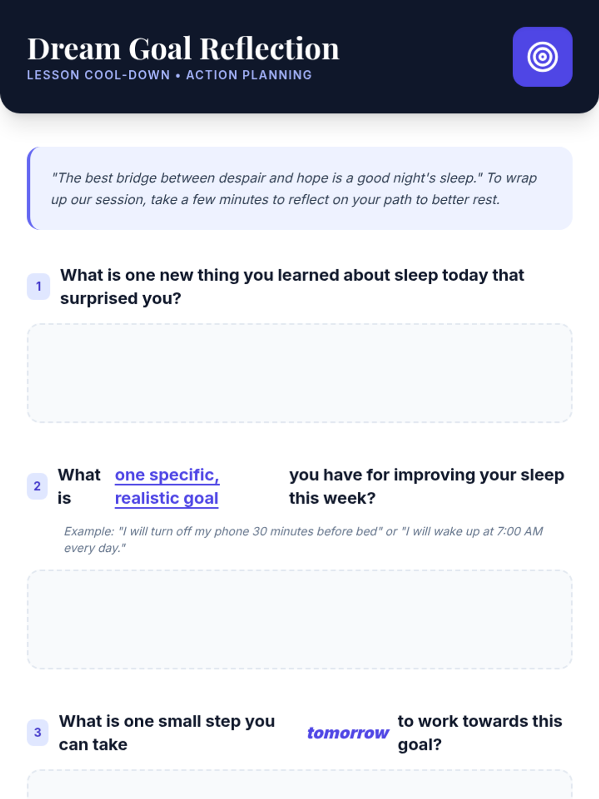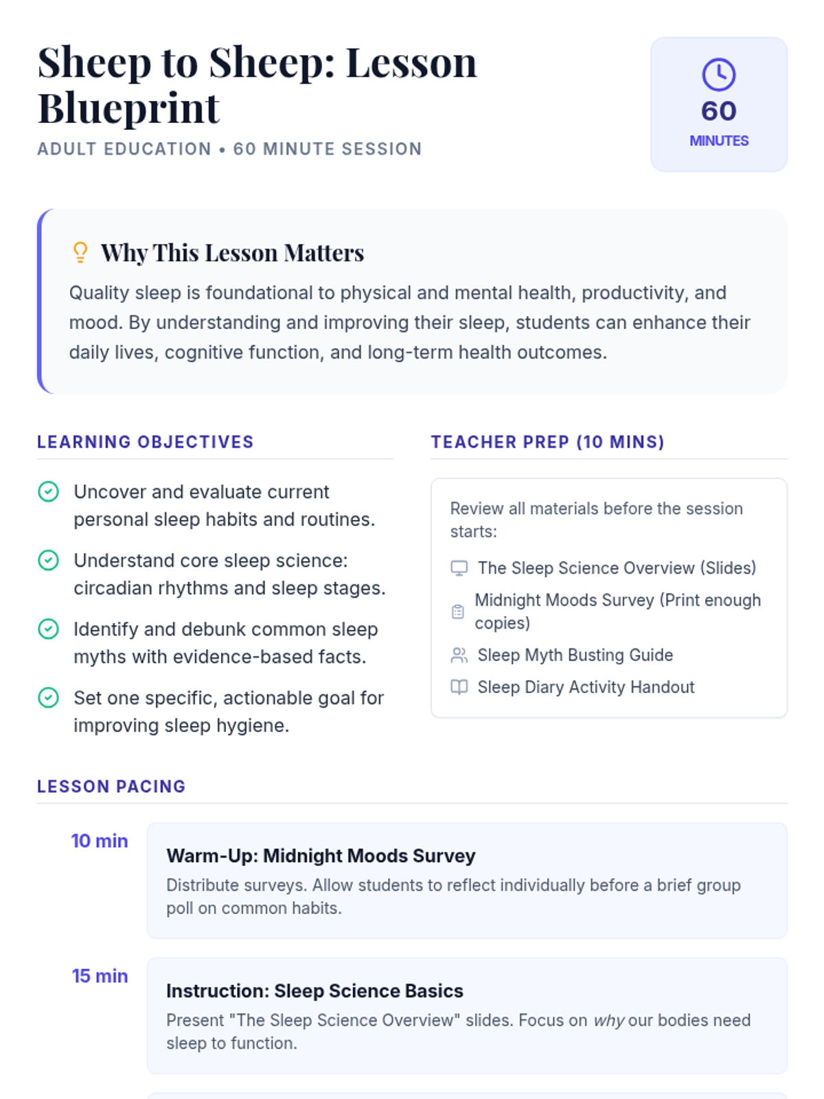 A comprehensive 60-minute session for adult learners to explore the science of sleep, evaluate their personal habits, and implement practical strategies for better rest.
