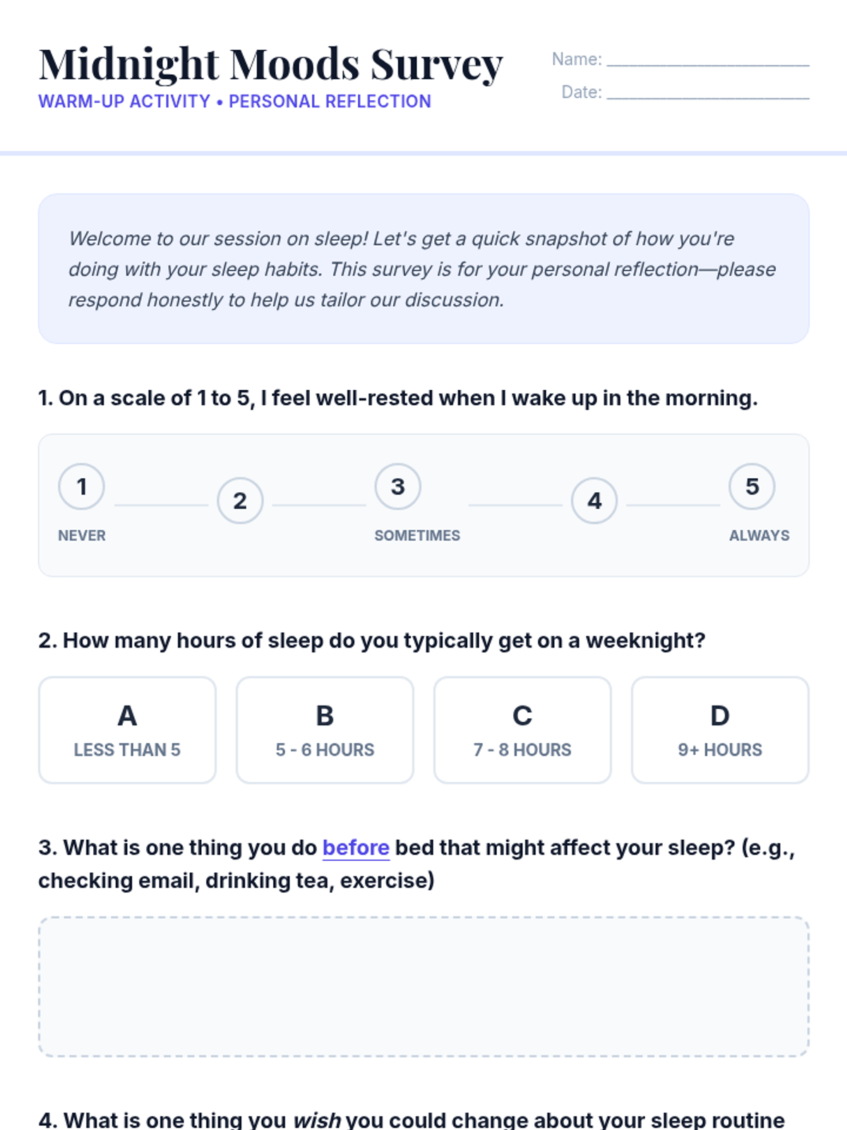 This lesson introduces students to healthy sleep hygiene habits through a personalized self-assessment checklist and teacher-led discussion. It focuses on concrete, actionable steps for improving evening and bedtime routines.