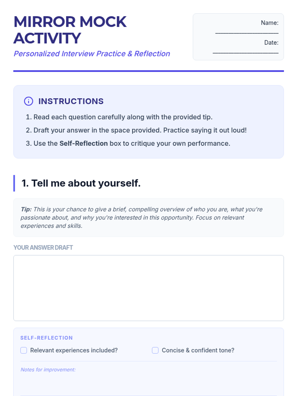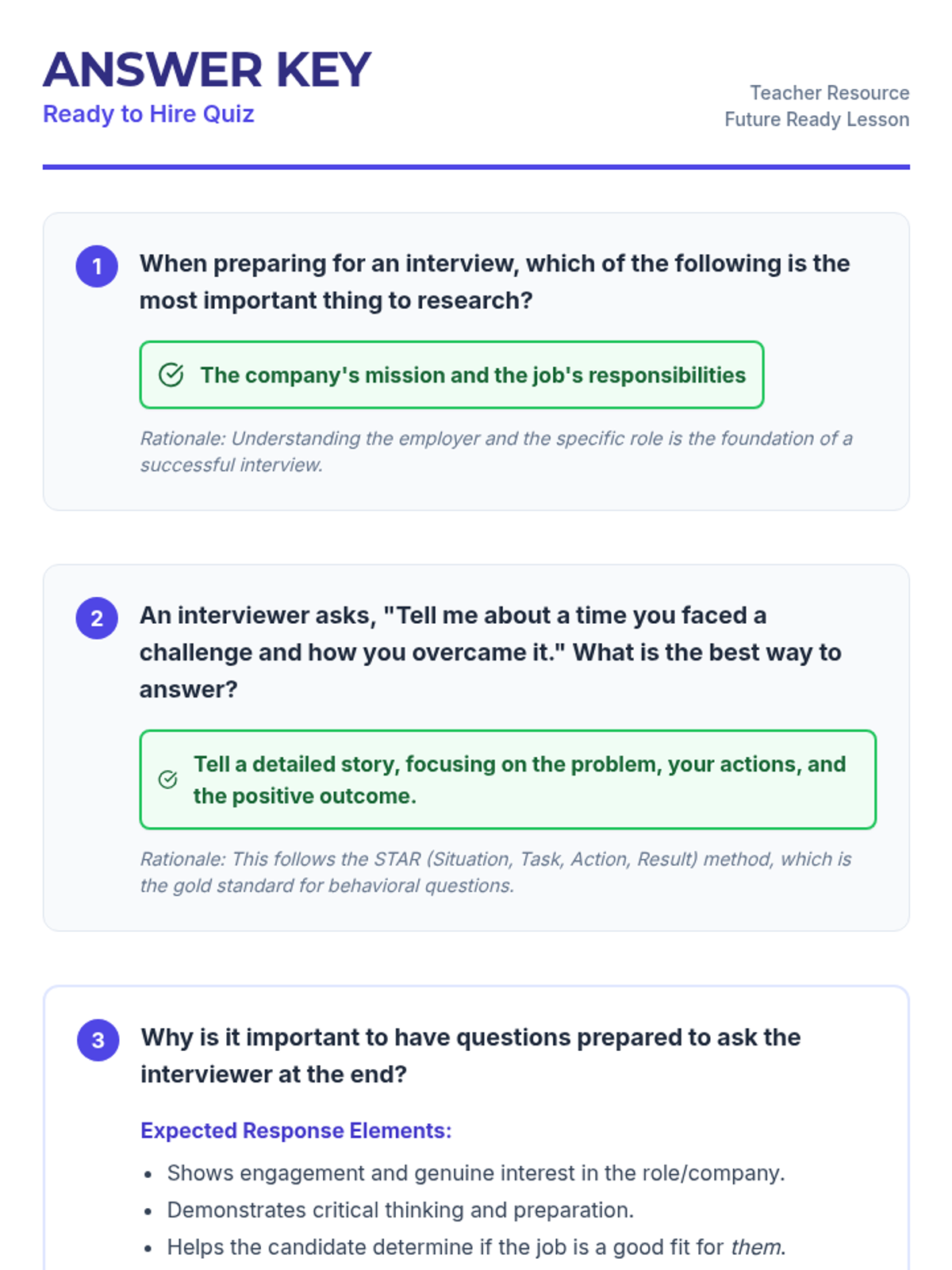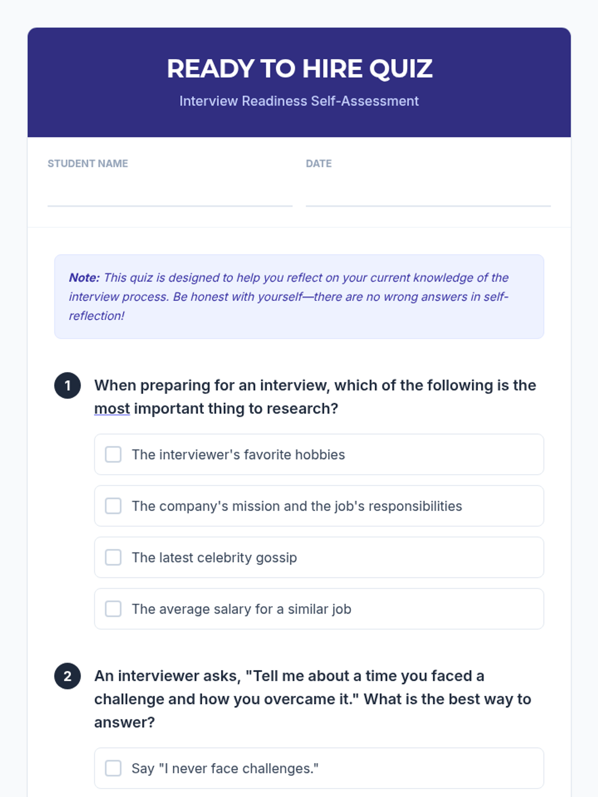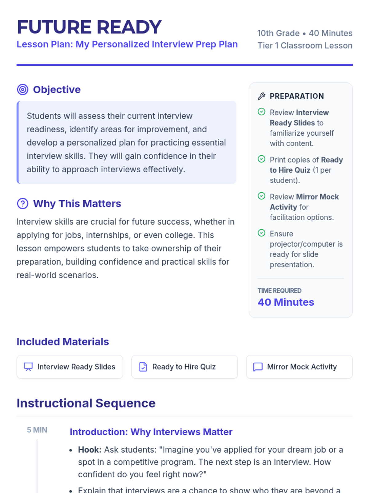 A comprehensive lesson designed to help 10th graders assess their interview readiness, practice essential skills, and build a personalized preparation plan to boost their confidence.