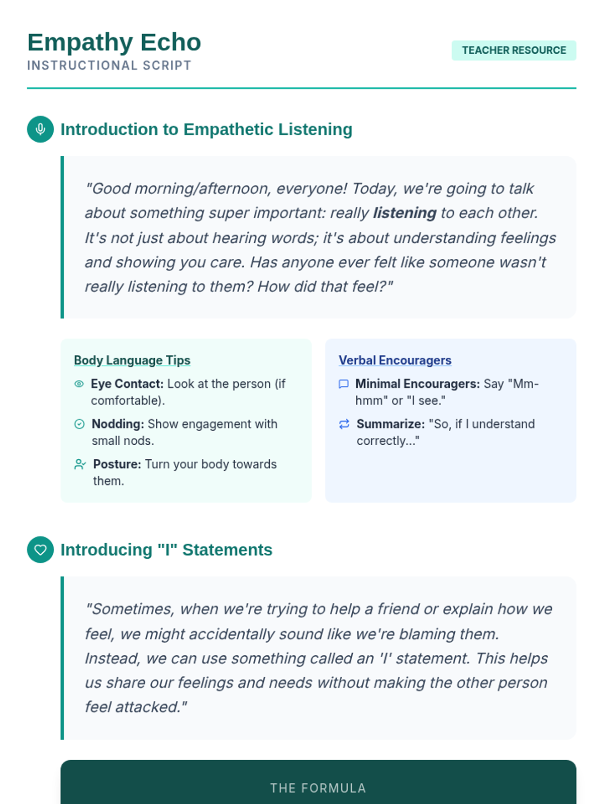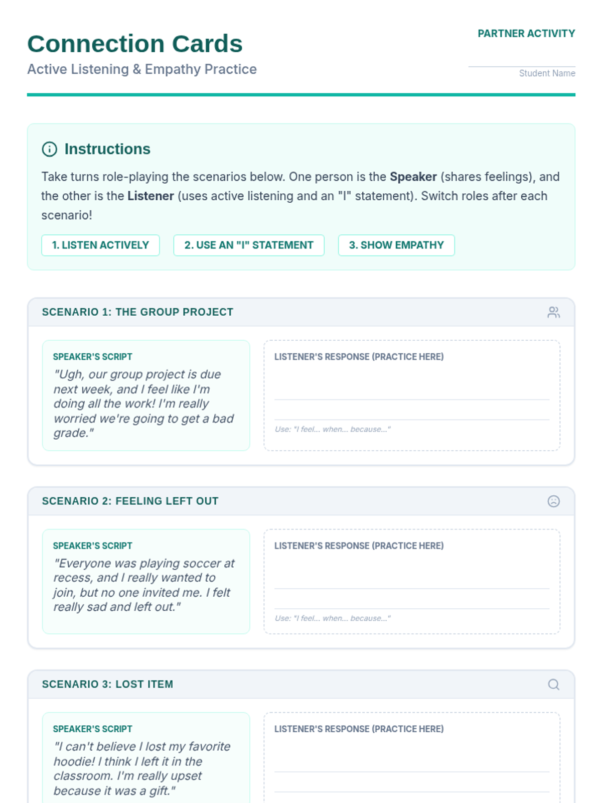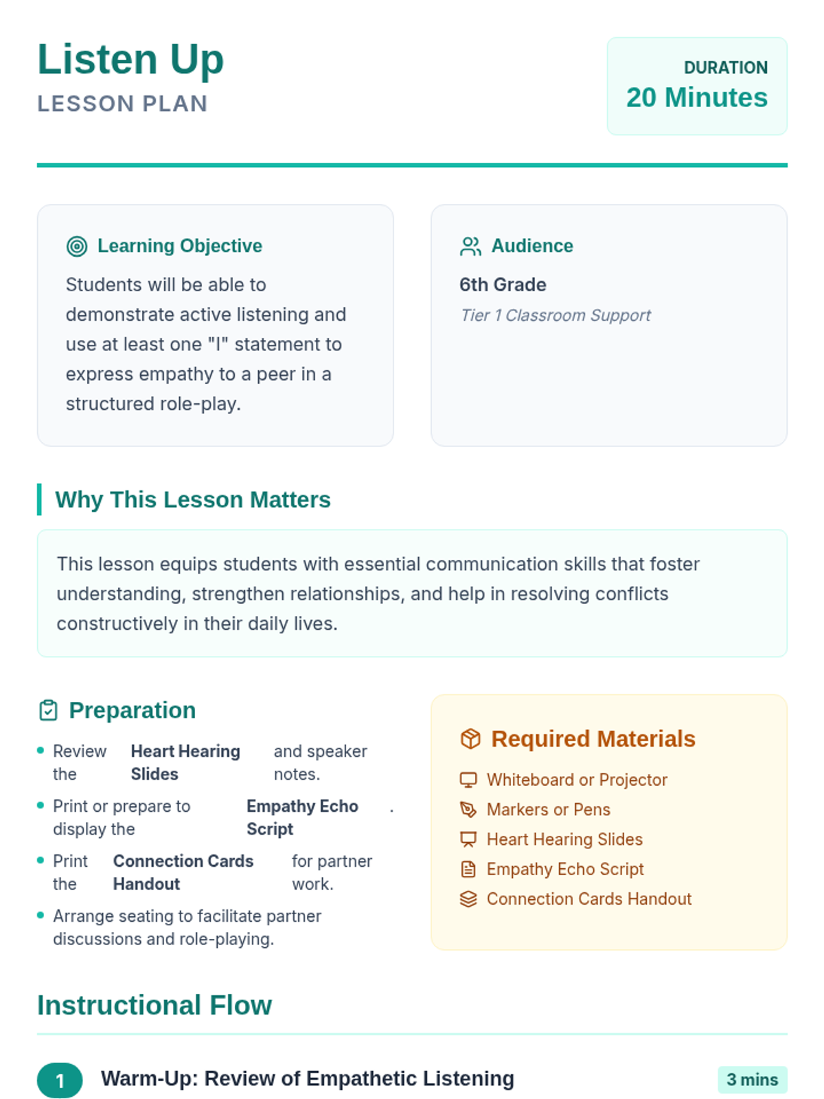 This 20-minute lesson teaches 6th-grade students the importance of active listening and empathetic communication through 'I' statements and role-playing.
