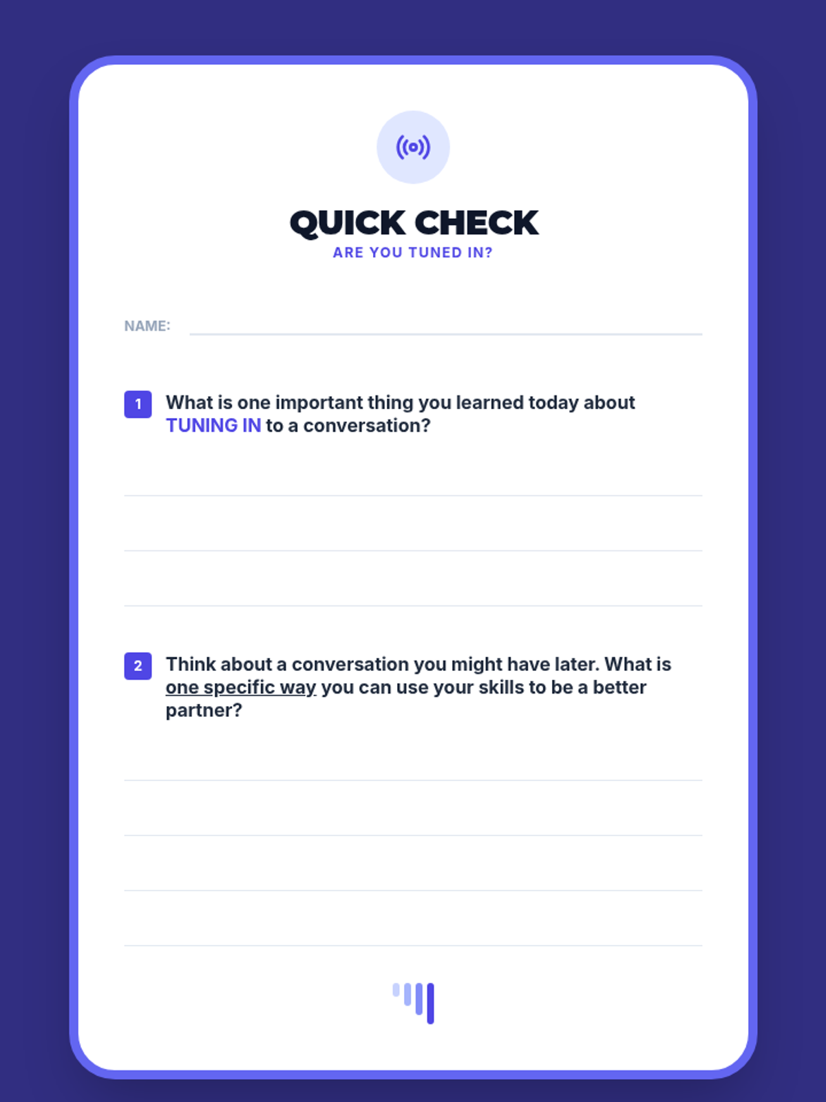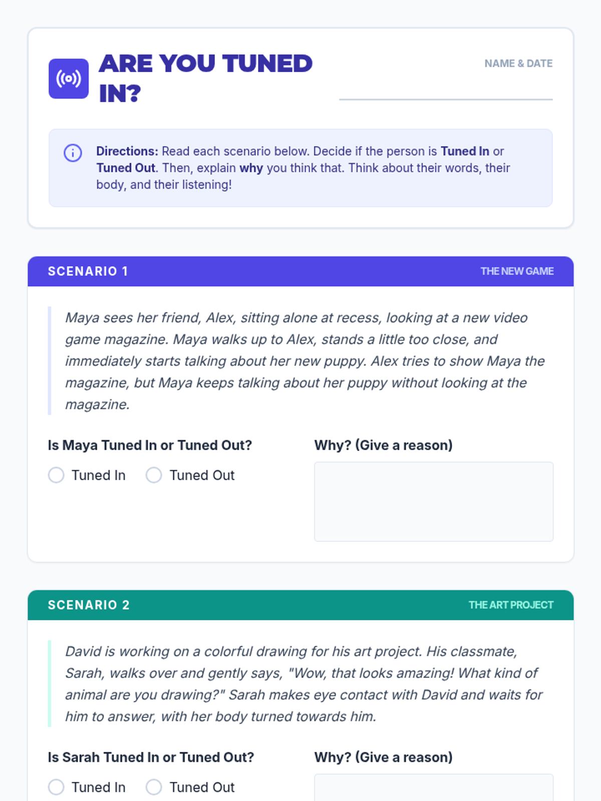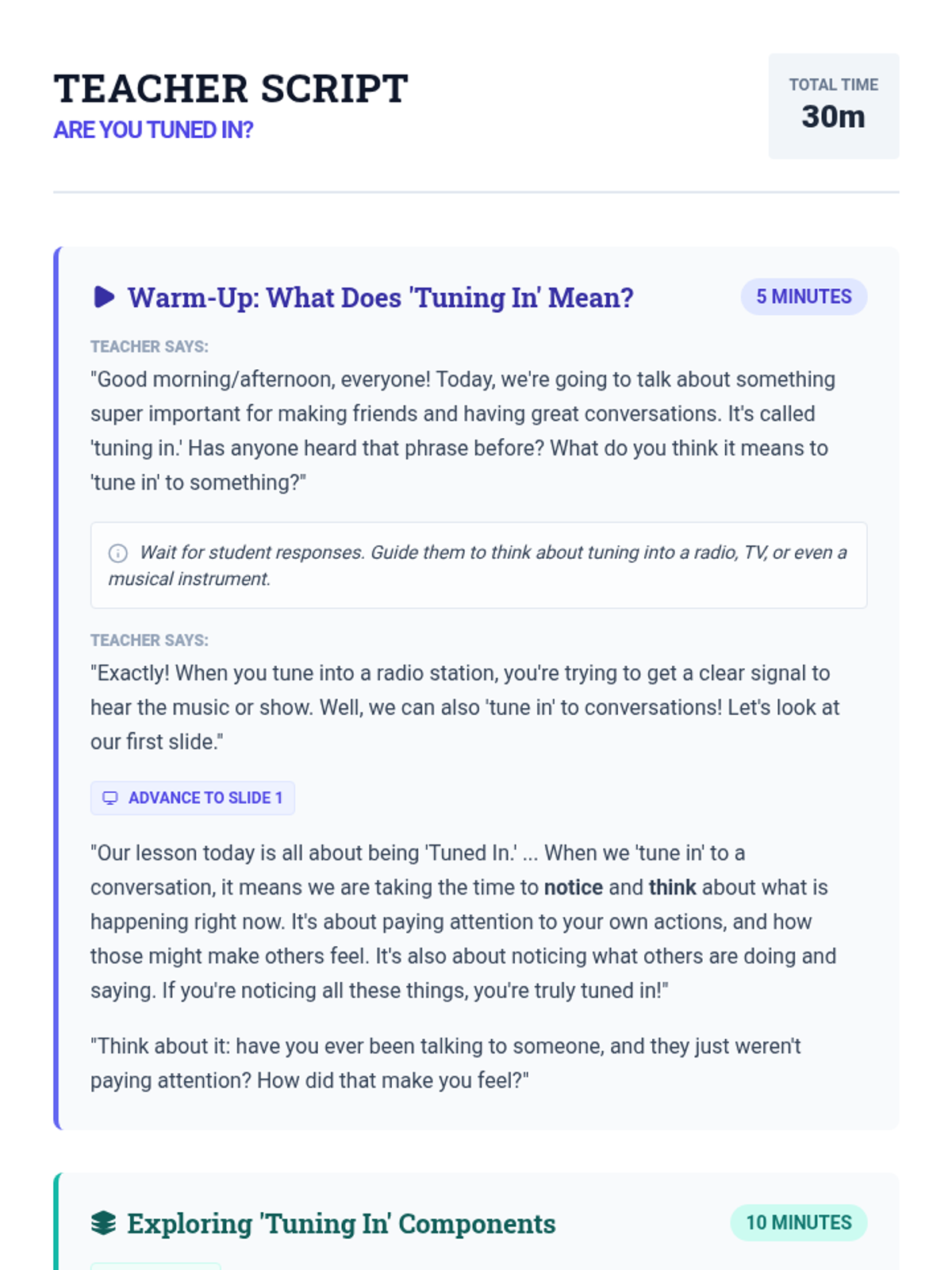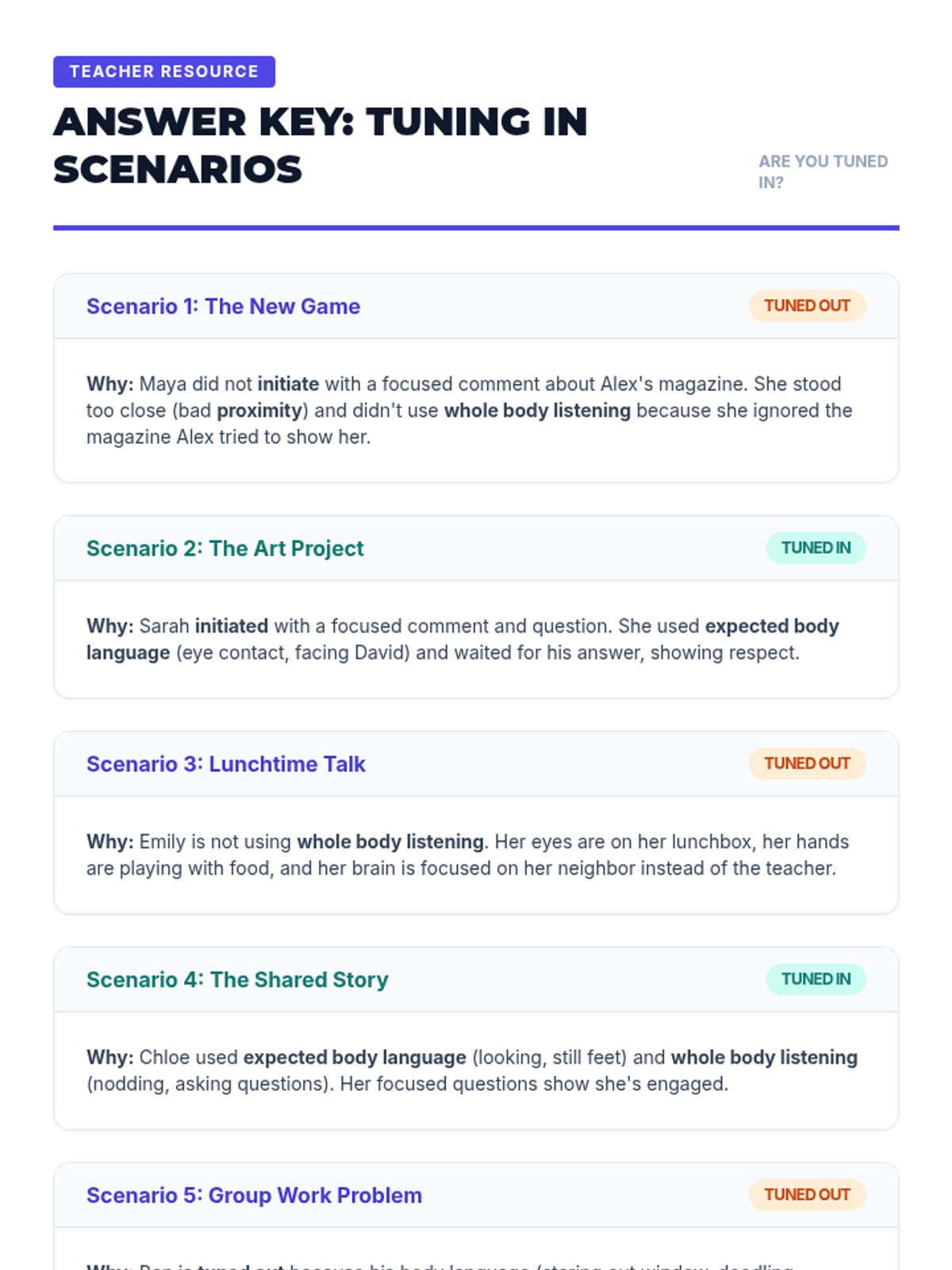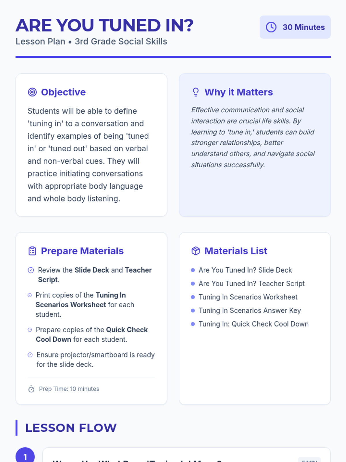 A 30-minute social-emotional learning lesson for 3rd graders focused on the concept of 'tuning in' to conversations using focused initiating, body language, and whole-body listening.