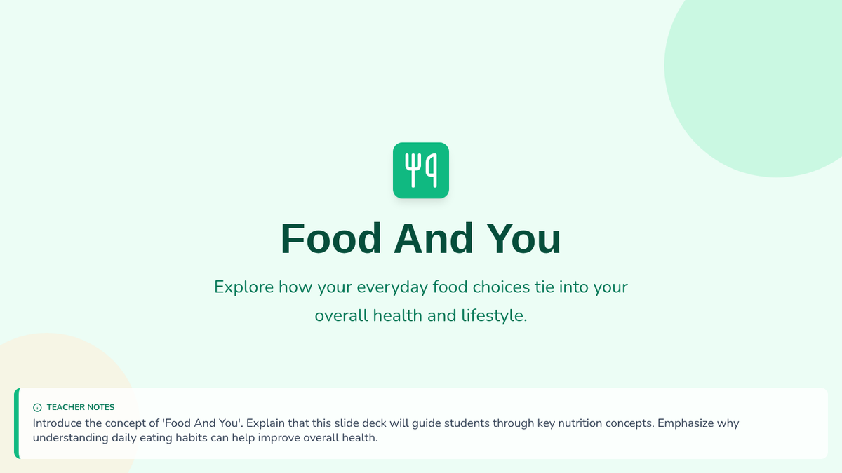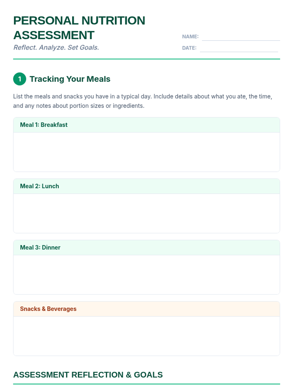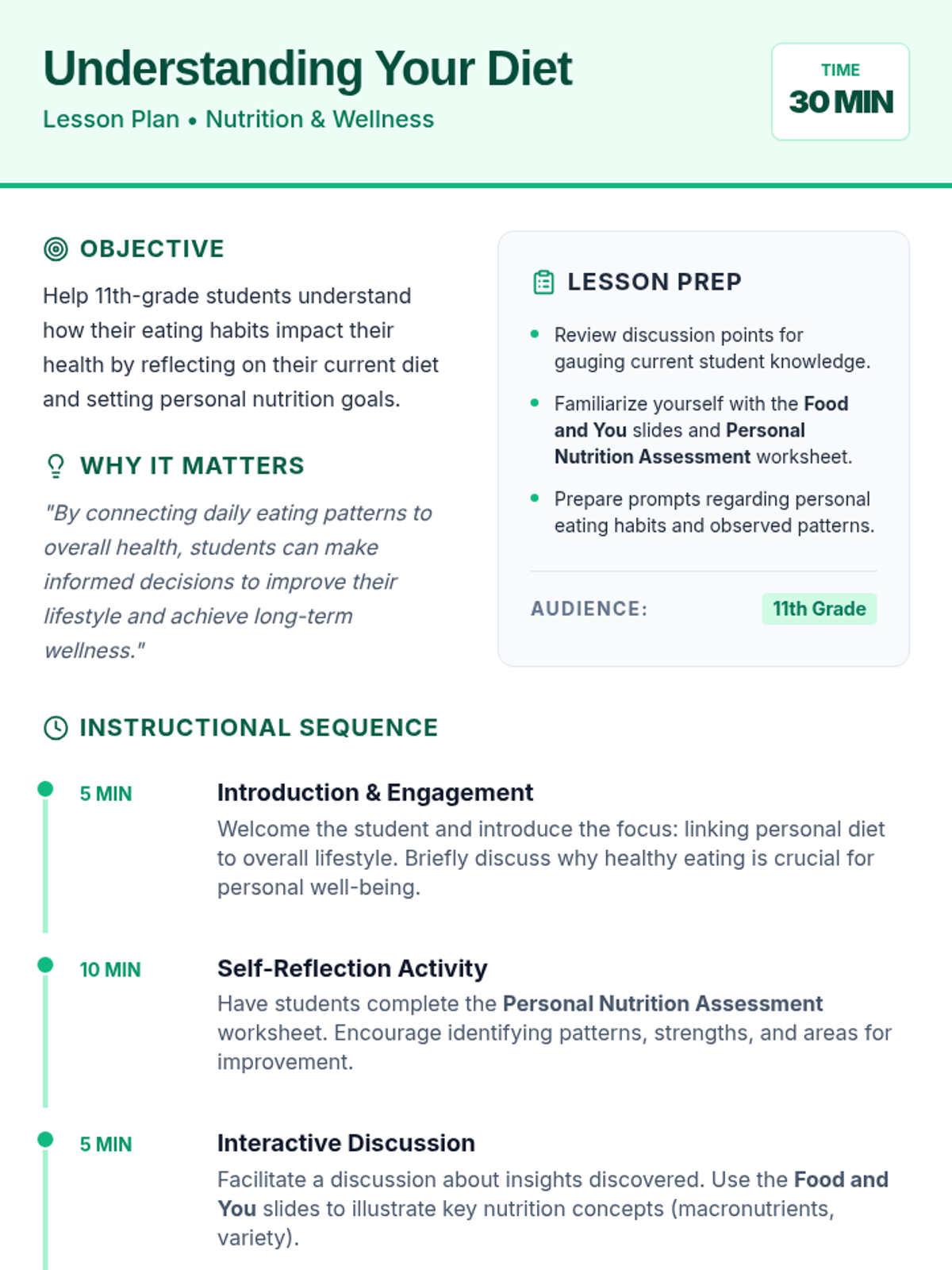 A personalized session for 11th-grade students to connect eating habits to health and lifestyle through self-reflection and goal-setting.