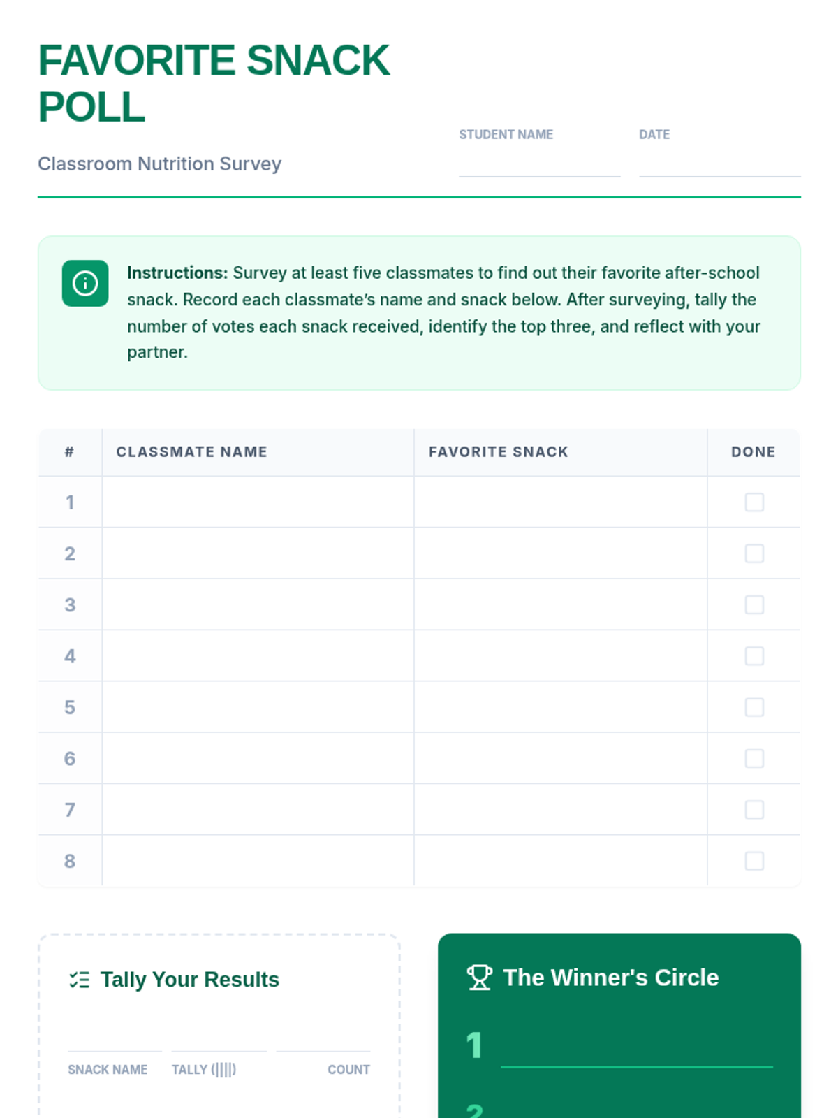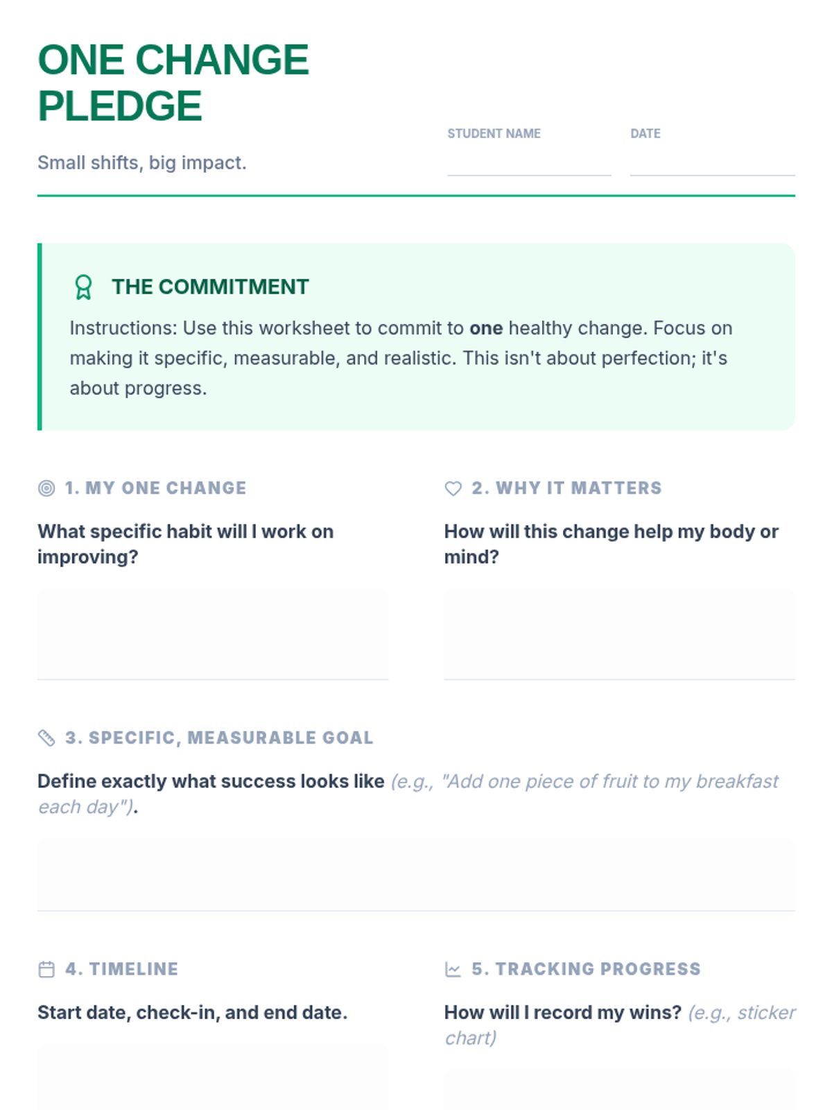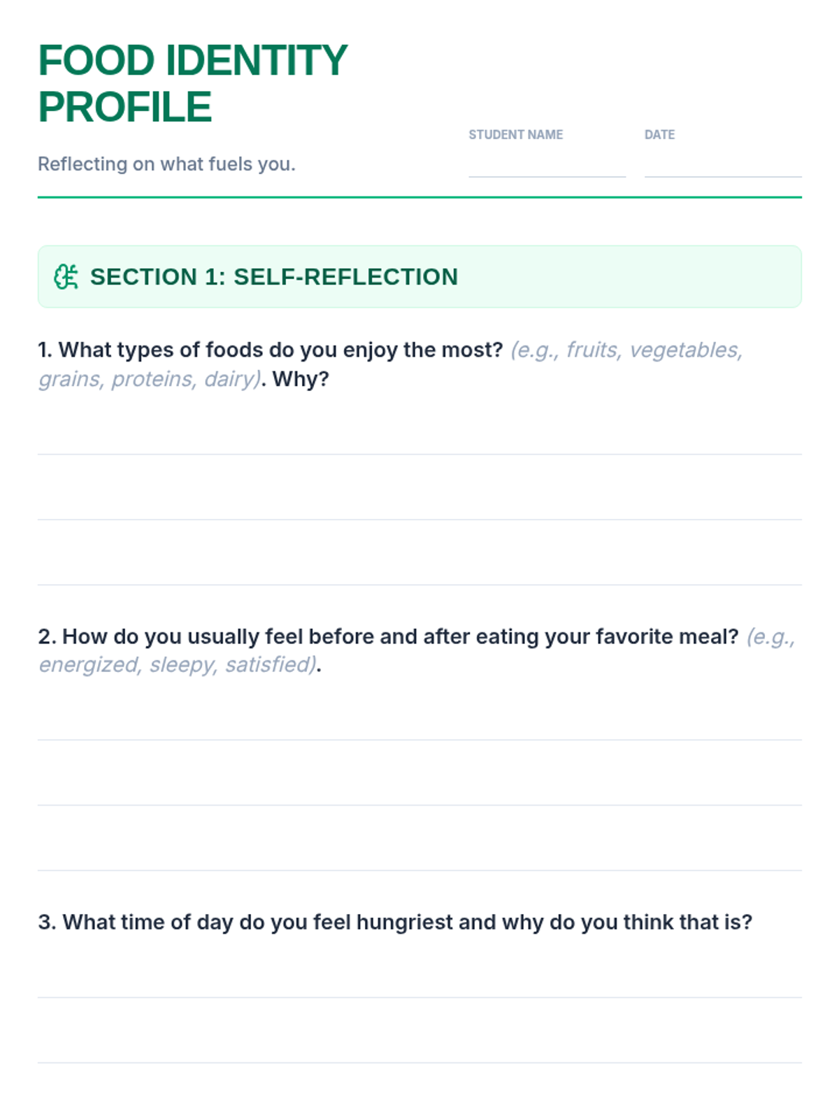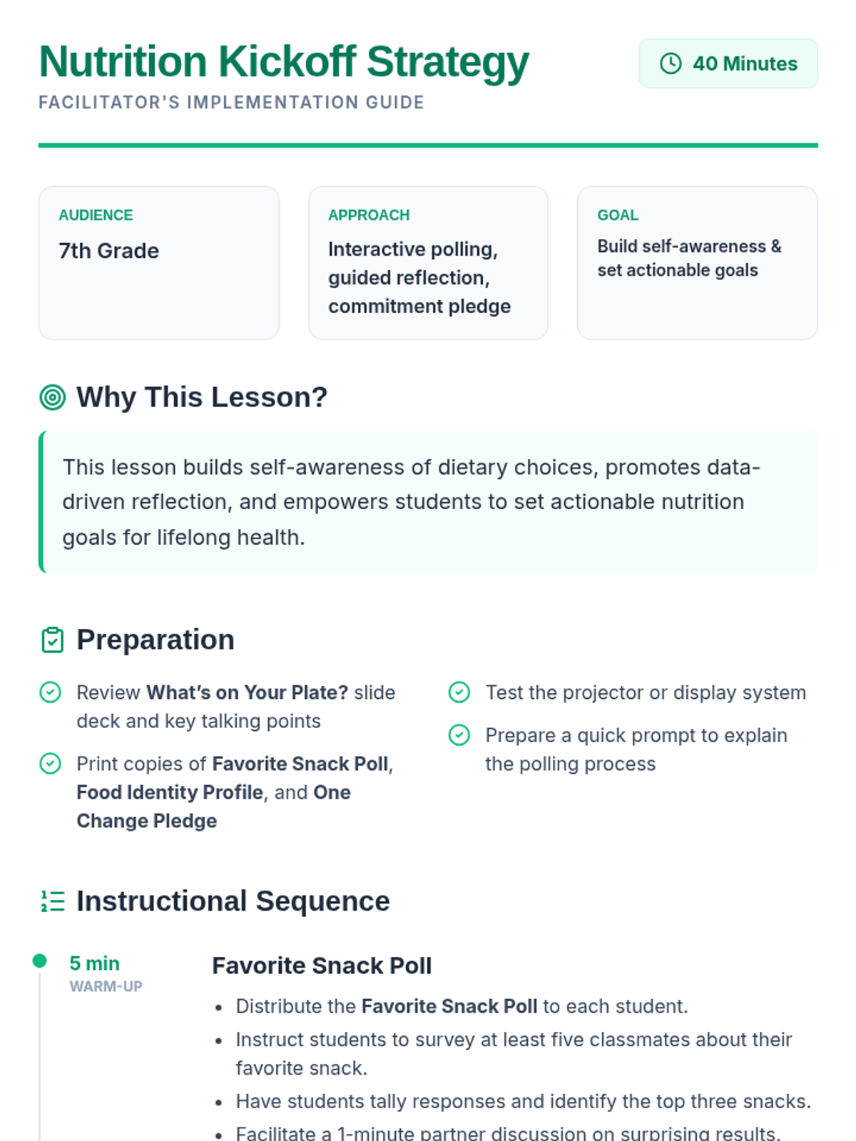 A 40-minute interactive nutrition lesson for 7th graders where they analyze their eating habits through polling, logging, and goal-setting. Students build self-awareness and commit to actionable dietary changes.