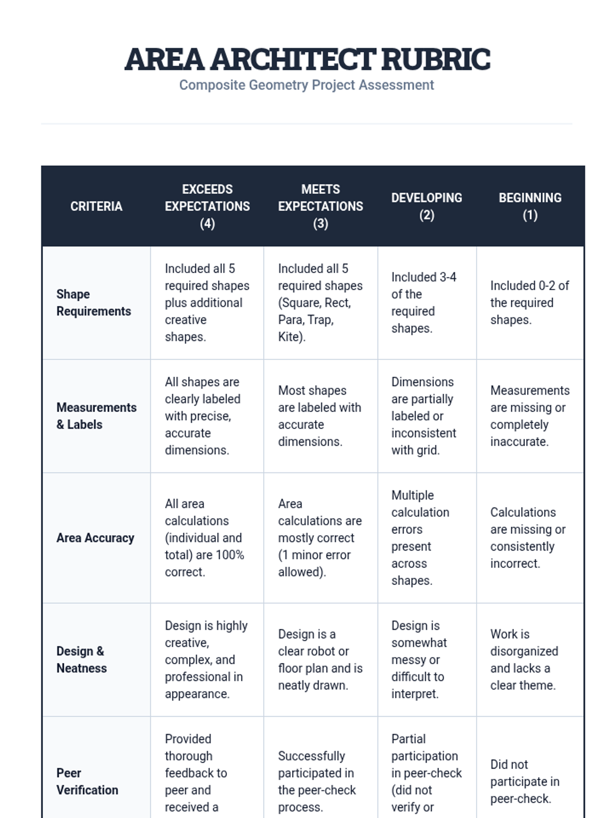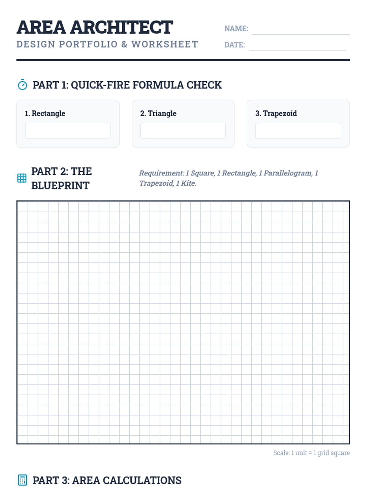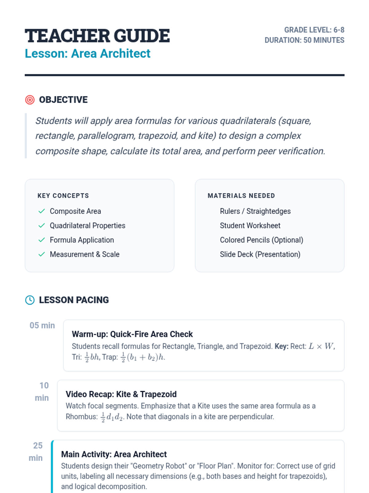 A middle school math lesson where students apply quadrilateral area formulas to design a composite 'Geometry Robot' or 'Floor Plan', calculating total area and performing peer reviews.