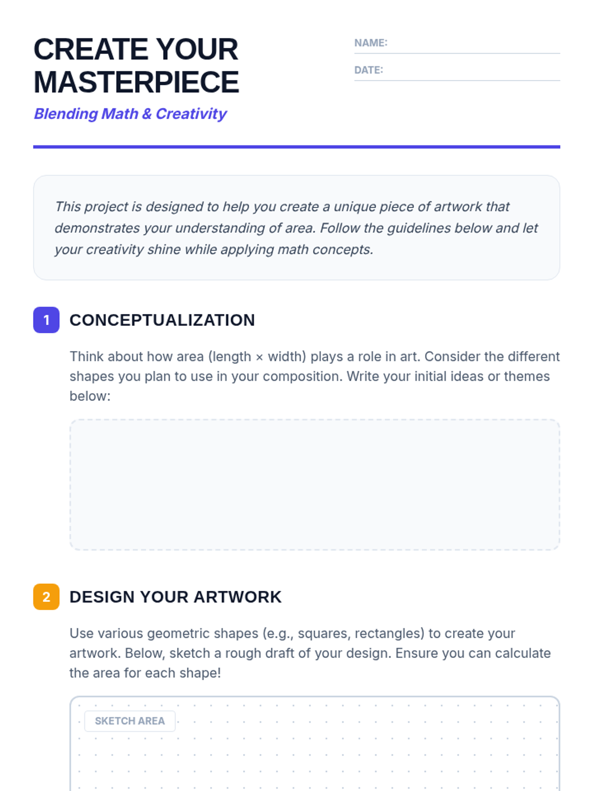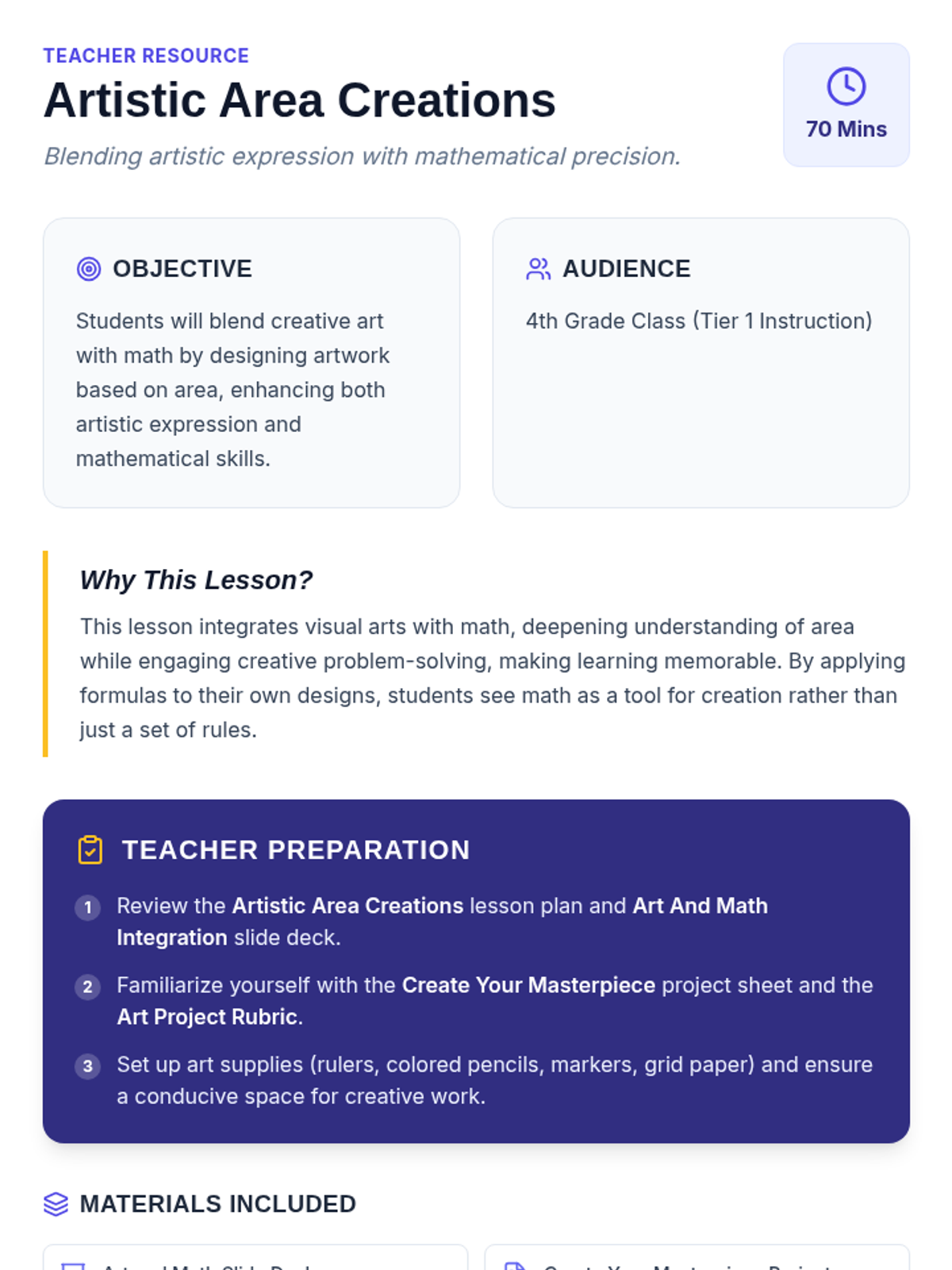 A 70-minute 4th-grade lesson where students blend geometry and art by designing masterpieces based on area calculations.