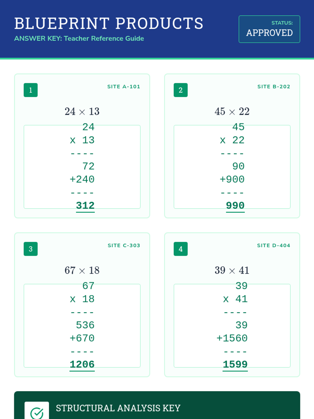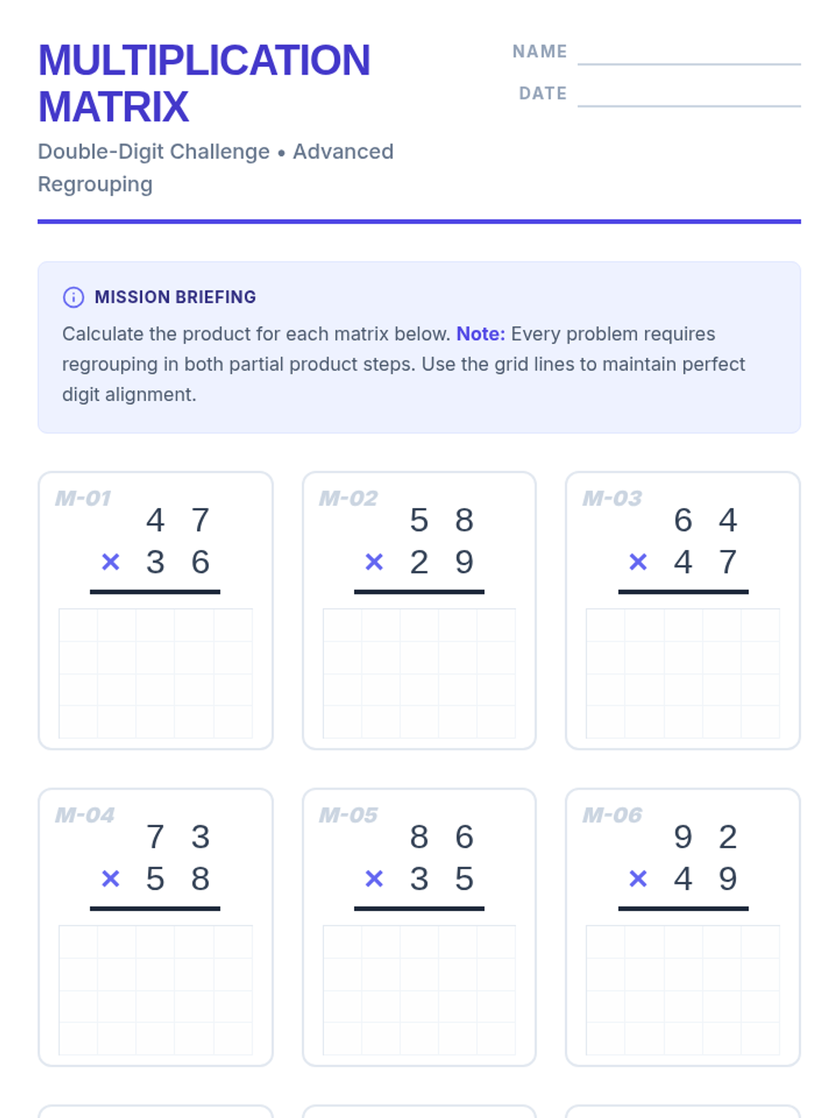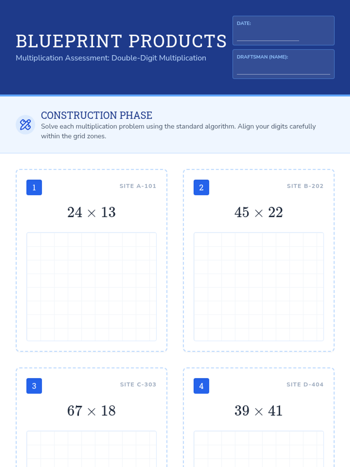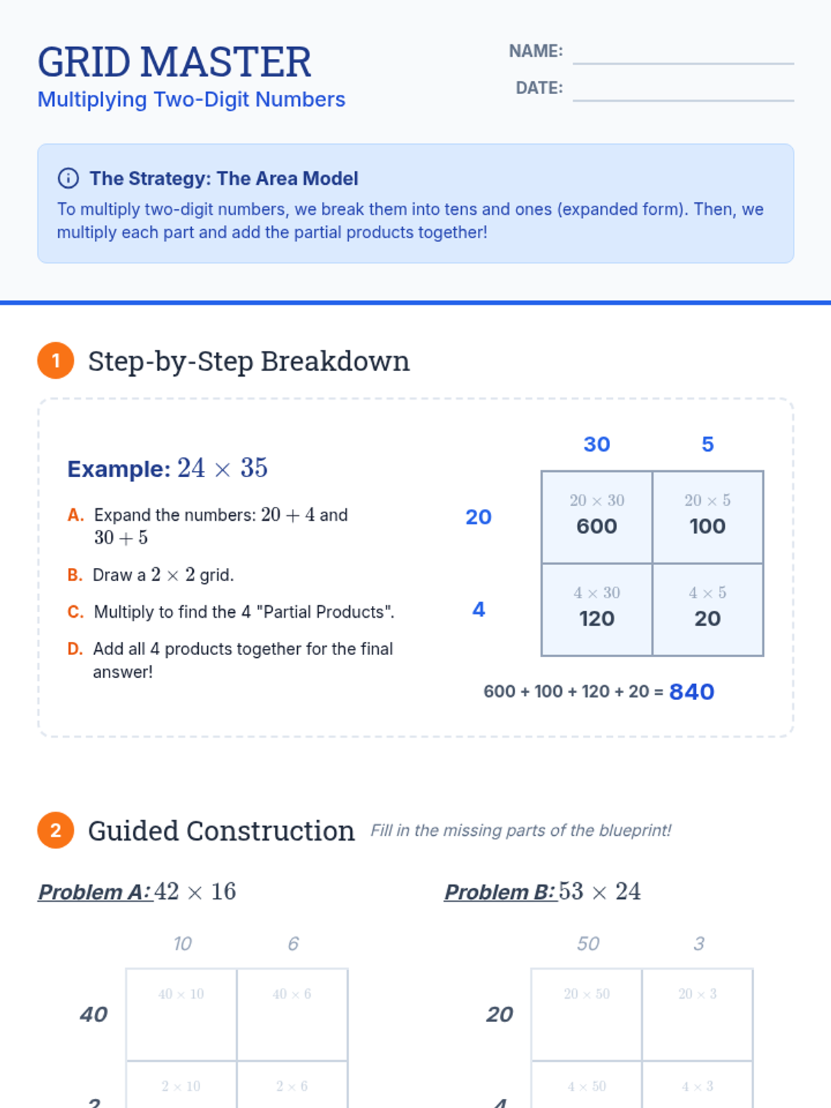 Students practice 2-digit by 2-digit multiplication using area models and partial products. Focus on ALN HLC 4 and 4.NBT.B.5.
