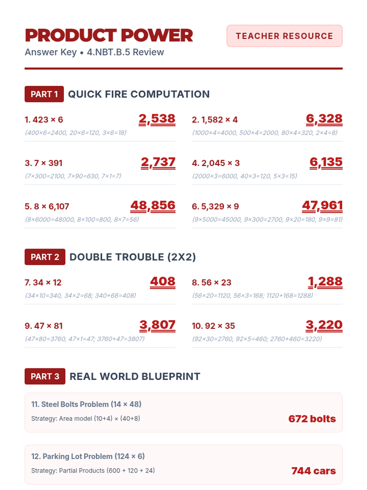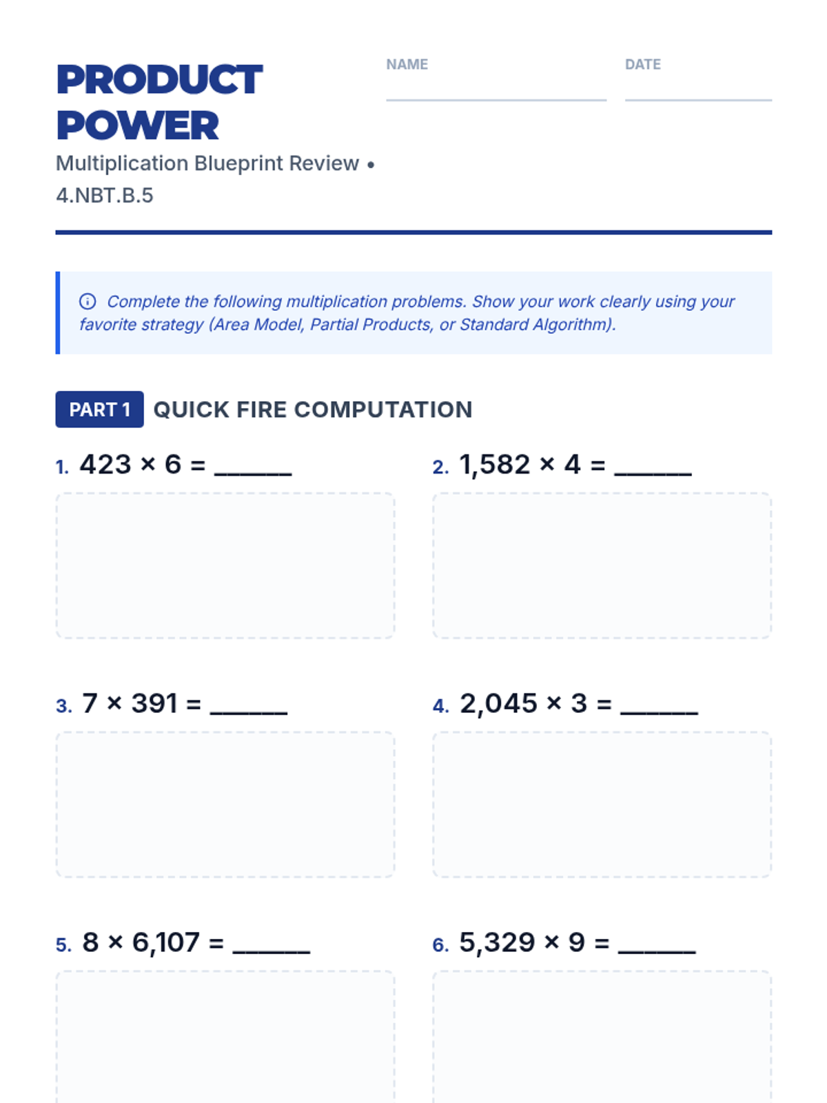 Students practice multi-digit by 1-digit multiplication using area models and partial products. Focus on ALN HLC 4 and 4.NBT.B.5.