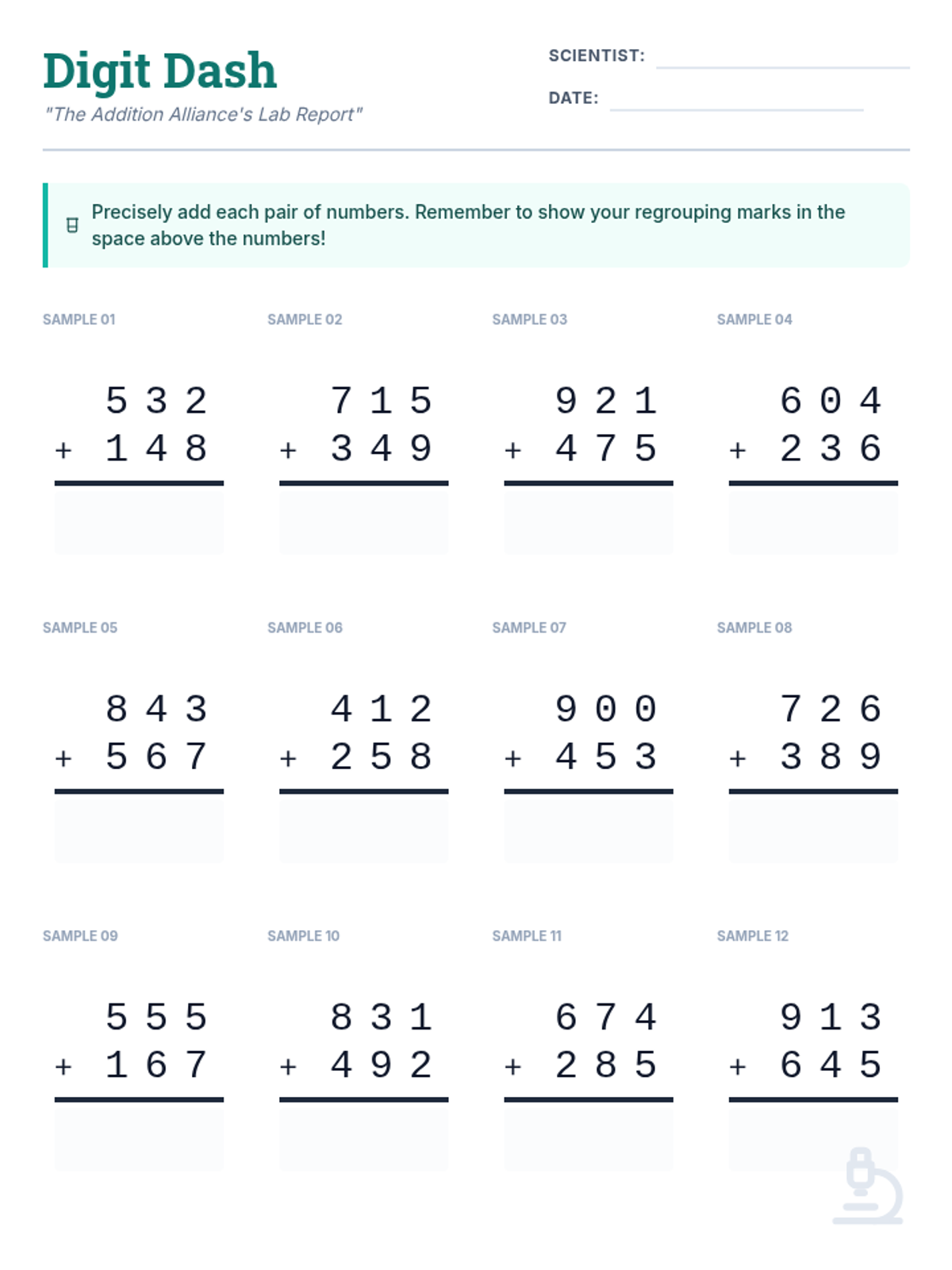 Students practice multi-digit addition using the standard algorithm, justified by place value understanding and base-ten models. Focus on ALN HLC 4 and 4.NBT.B.4.