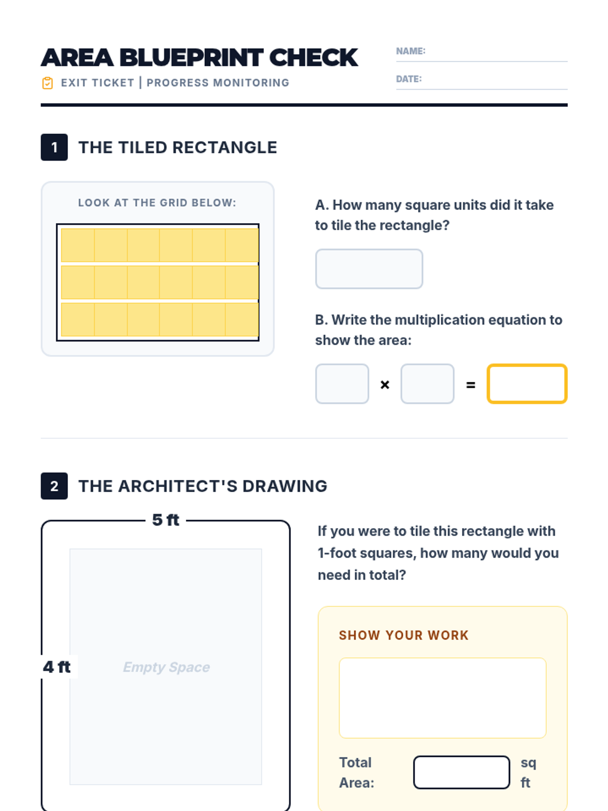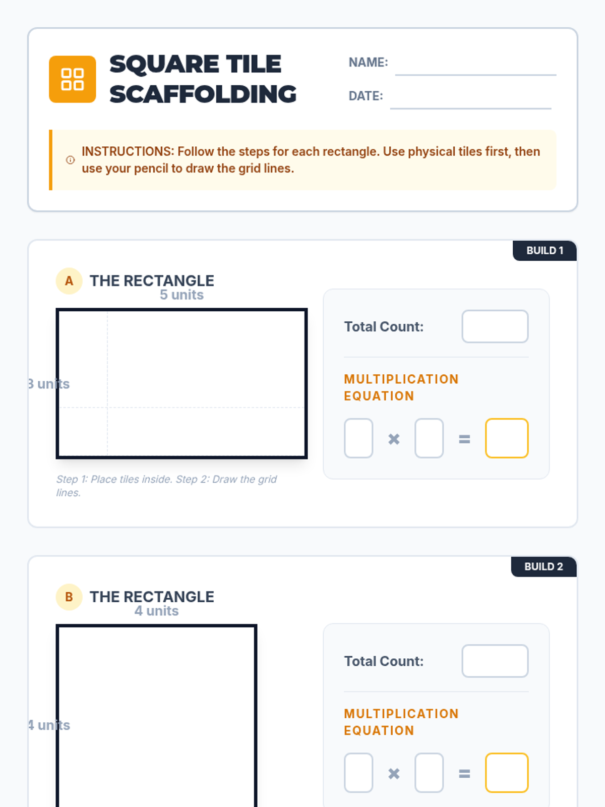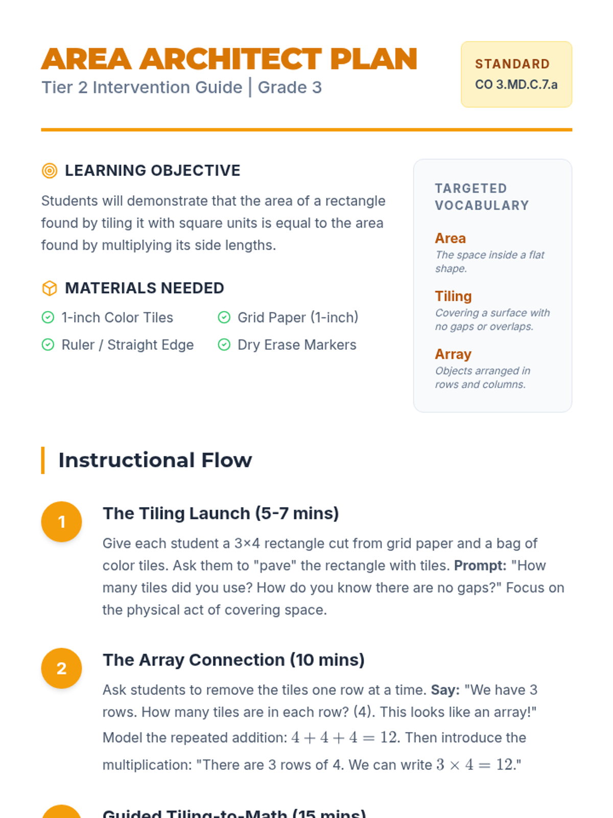 A Tier 2 intervention lesson for 3rd-grade students to bridge the conceptual gap between tiling a rectangle to find its area and using the multiplication of side lengths. This lesson uses hands-on manipulatives and scaffolded visual models to meet Colorado standard 3.MD.C.7.a.