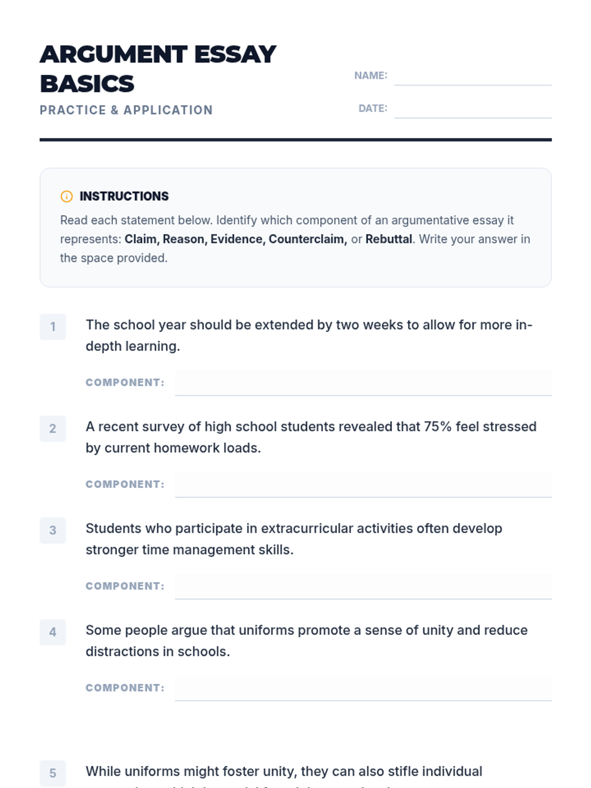 A lesson focused on analyzing the structure and content of a persuasive essay regarding school uniforms, helping students identify key argumentative components.