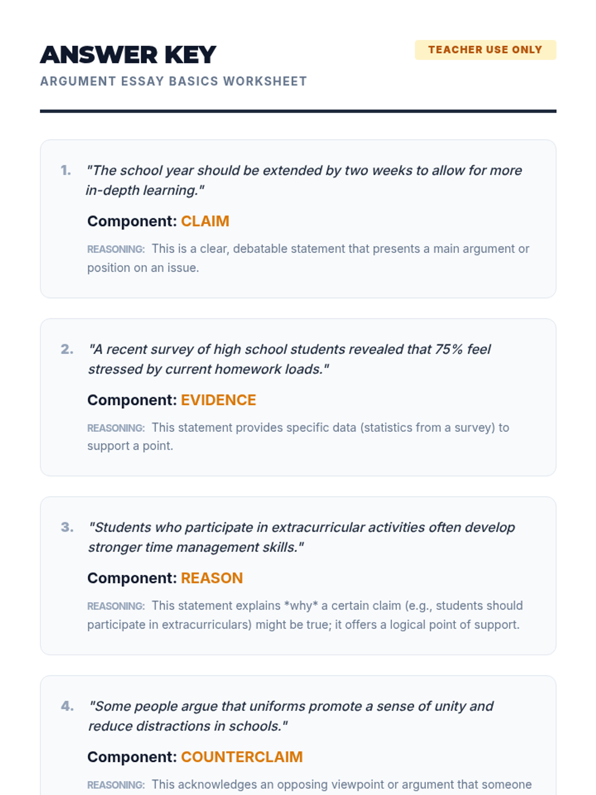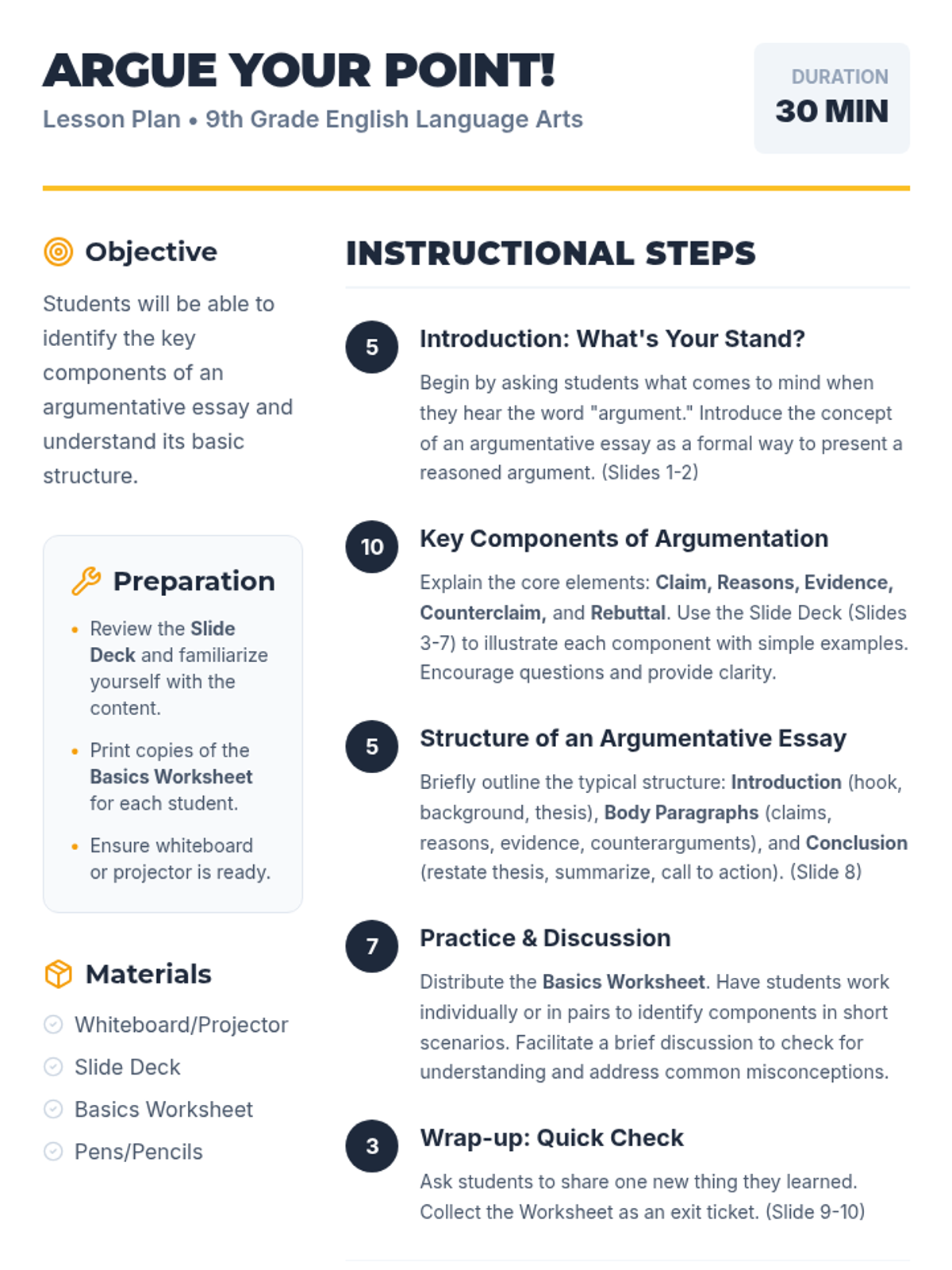 A 30-minute introductory lesson for 9th-grade students on the essential components of an argumentative essay, including claims, reasons, evidence, counterclaims, and rebuttals.