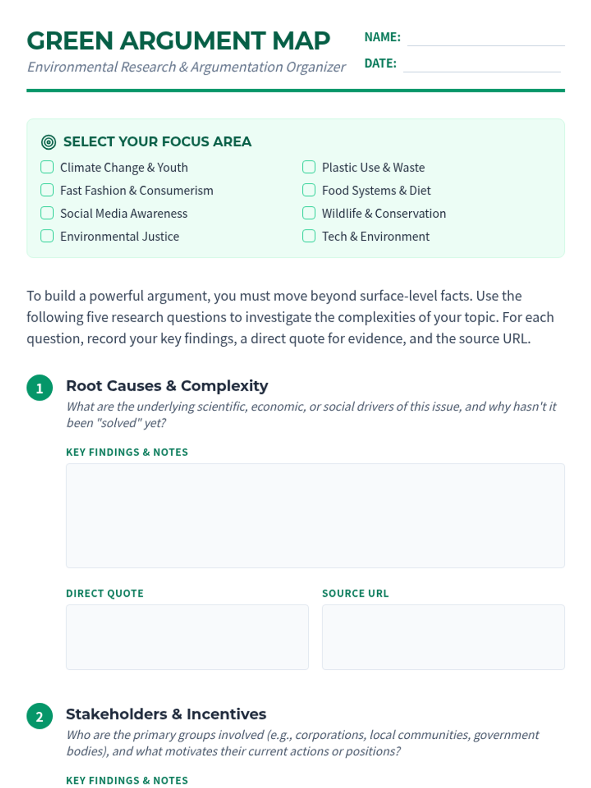 This lesson guides 10th-grade students through the research phase of an environmental argumentation essay. It provides a structured framework for gathering evidence, analyzing stakeholders, and preparing for counterarguments across various environmental sub-topics.