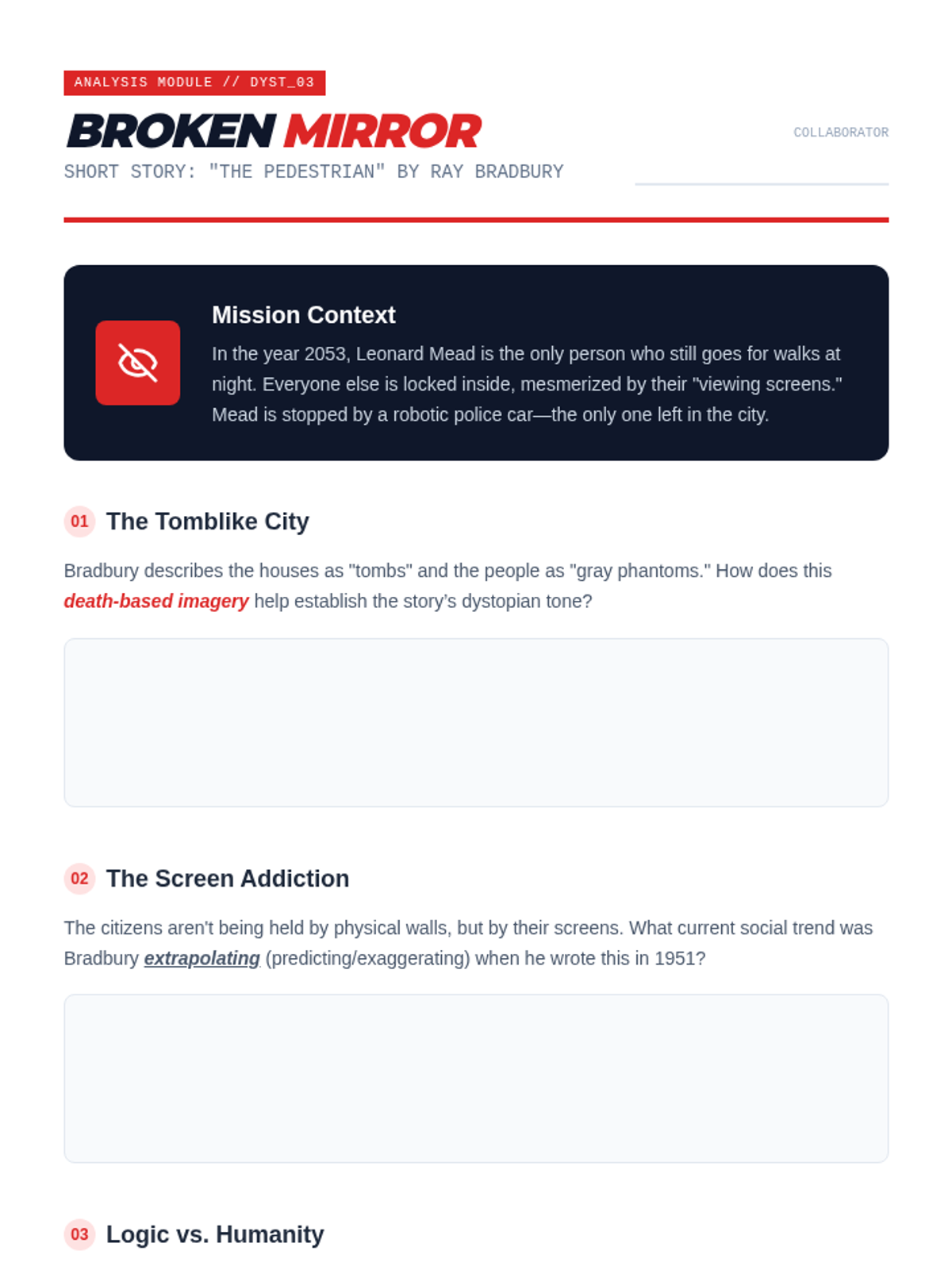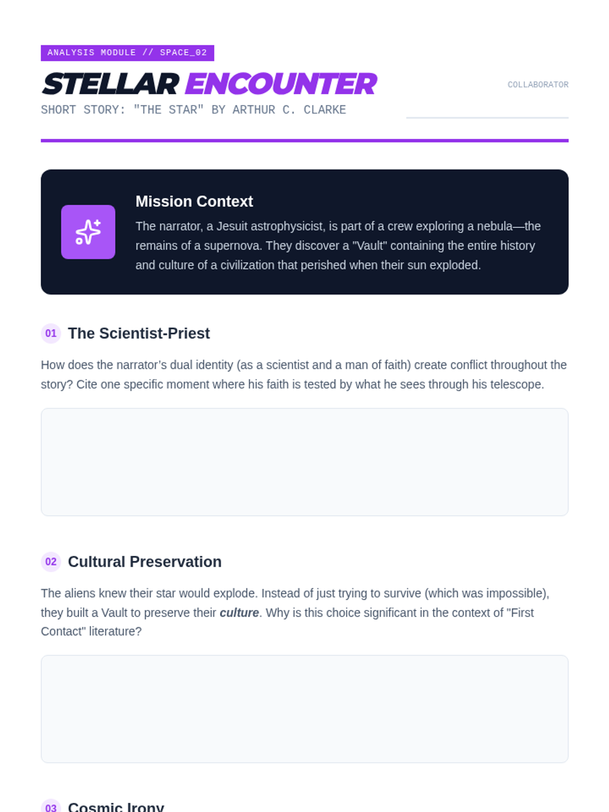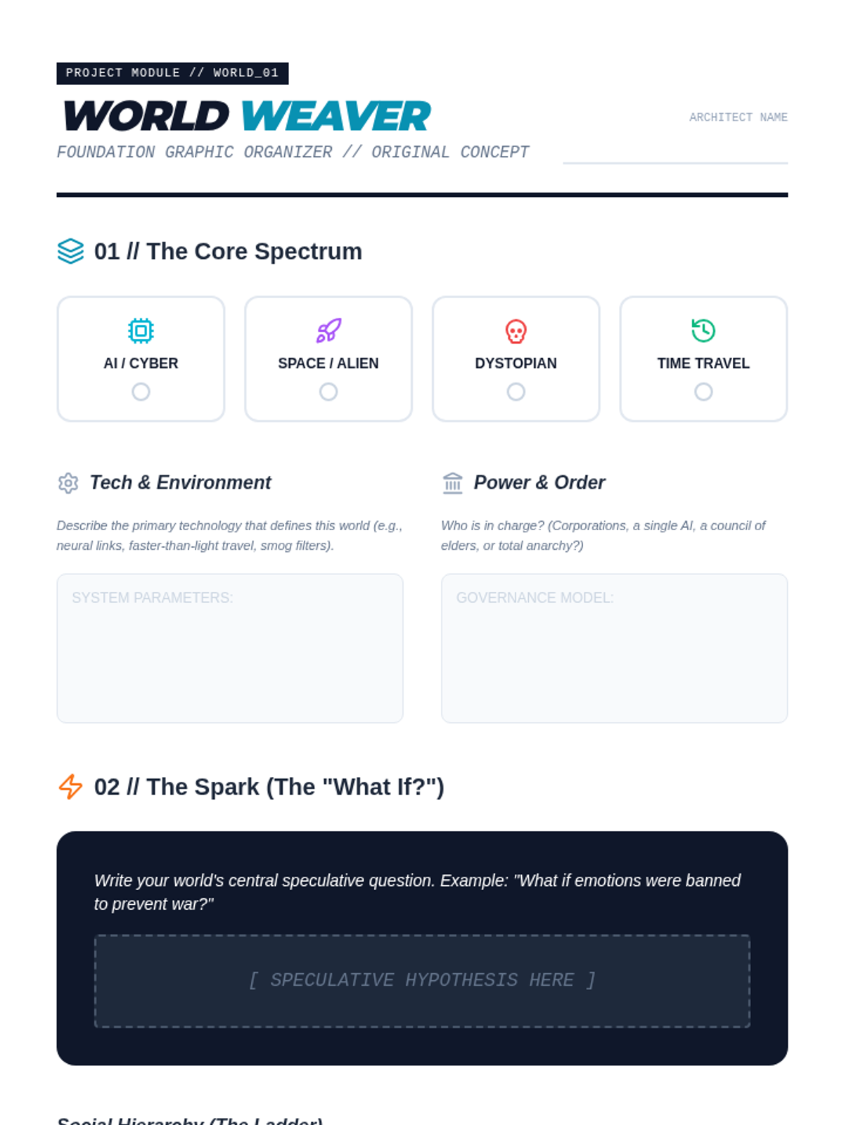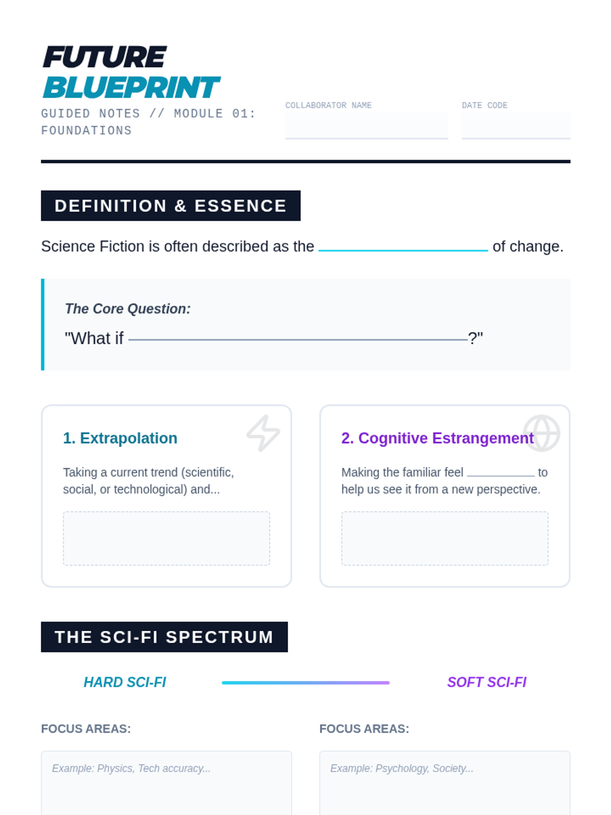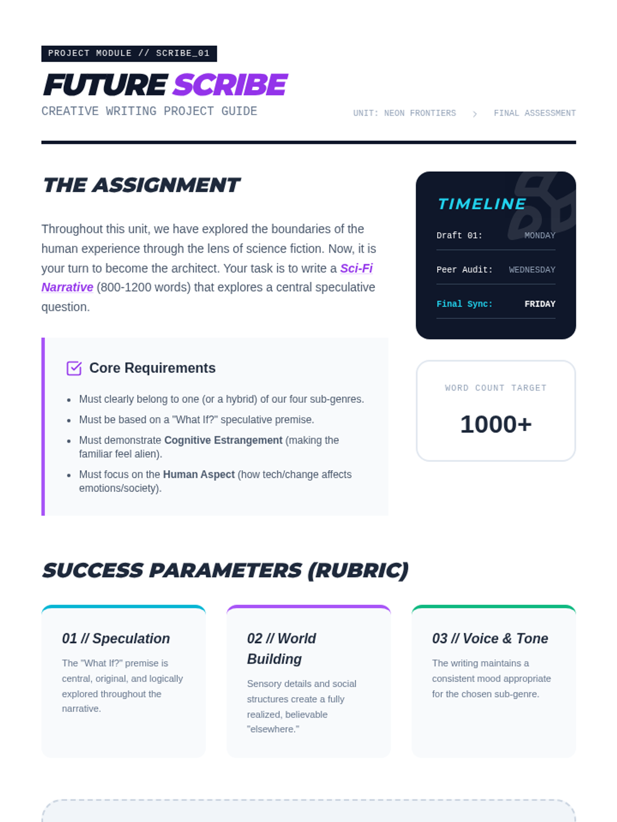 The summative assessment for the unit. Students synthesize their knowledge of science fiction sub-genres to create an original world, character, and plot premise.