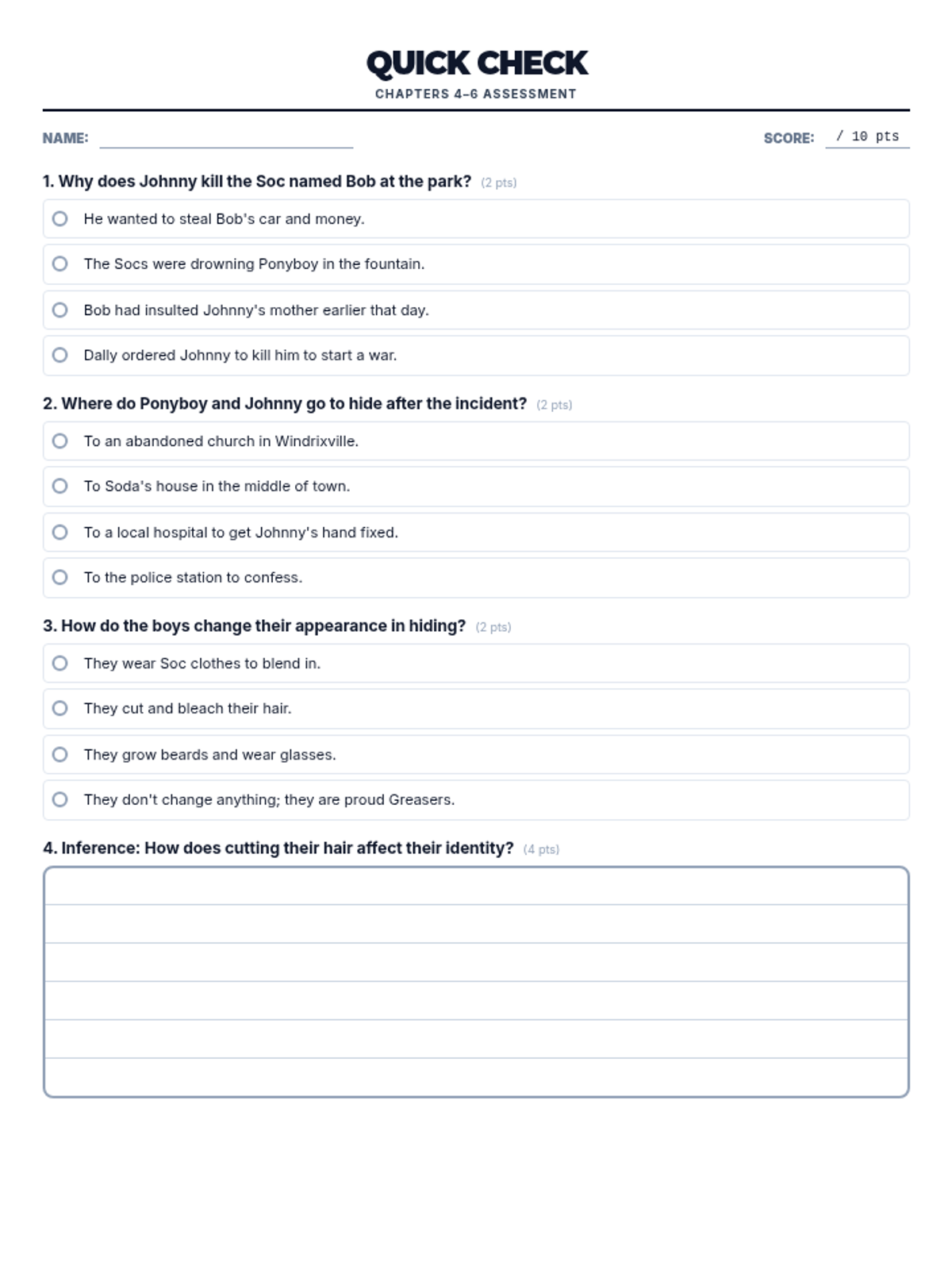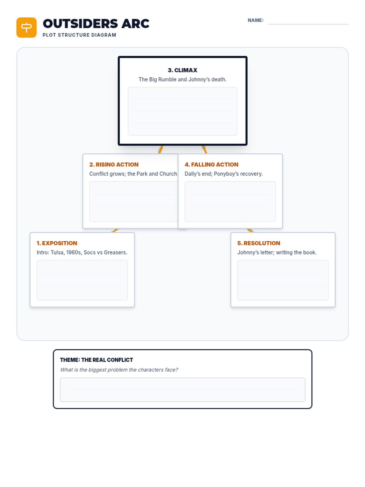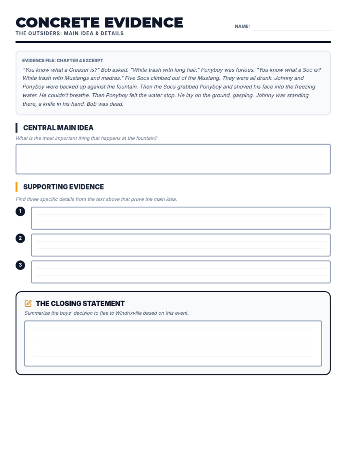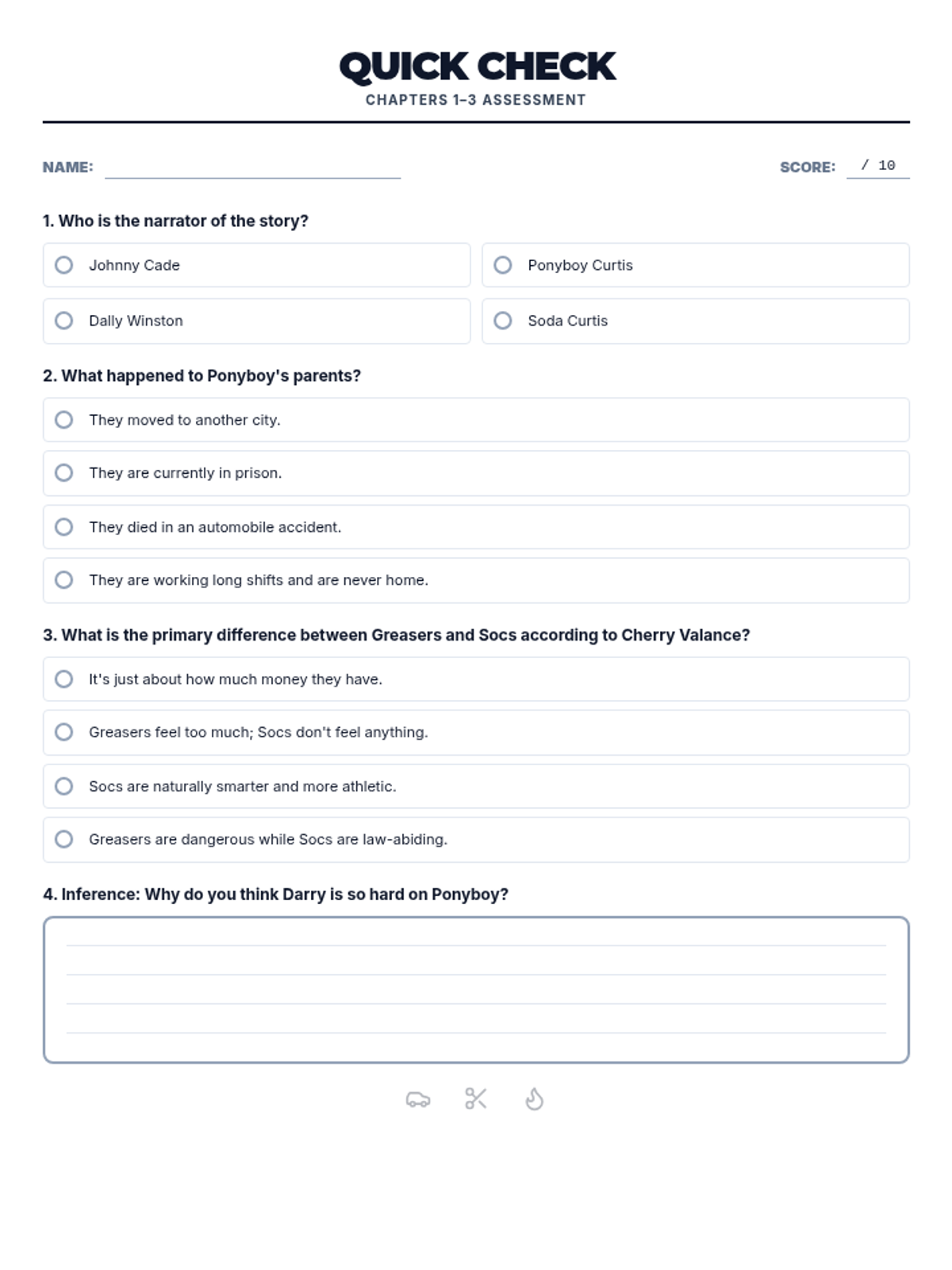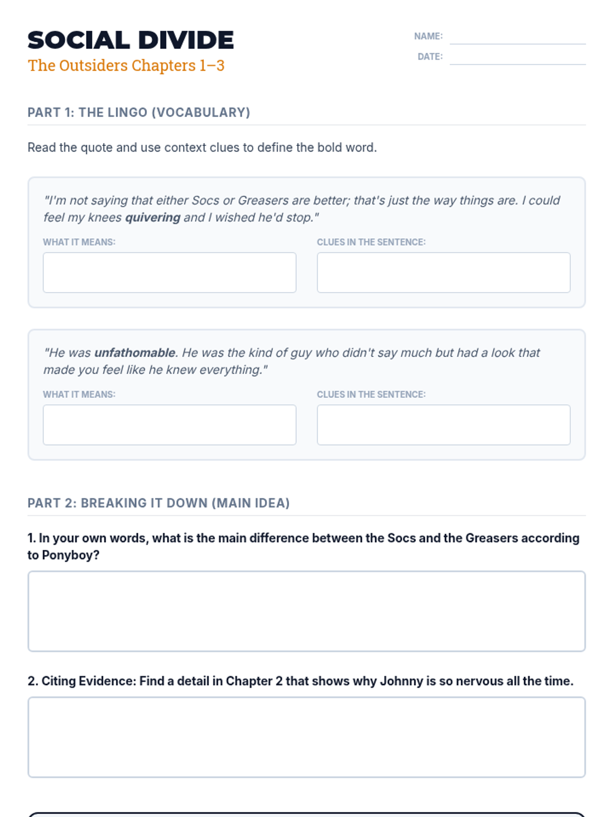 Introduces the social divide between Greasers and Socs, character archetypes, and the setting of 1960s Tulsa. Students focus on identifying main ideas and making initial character inferences.