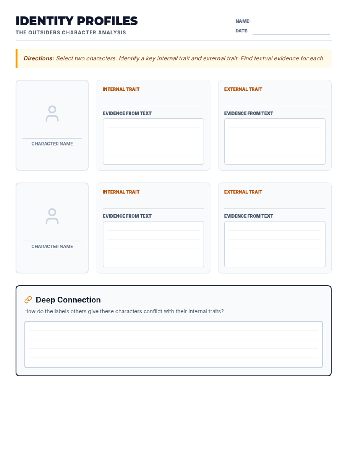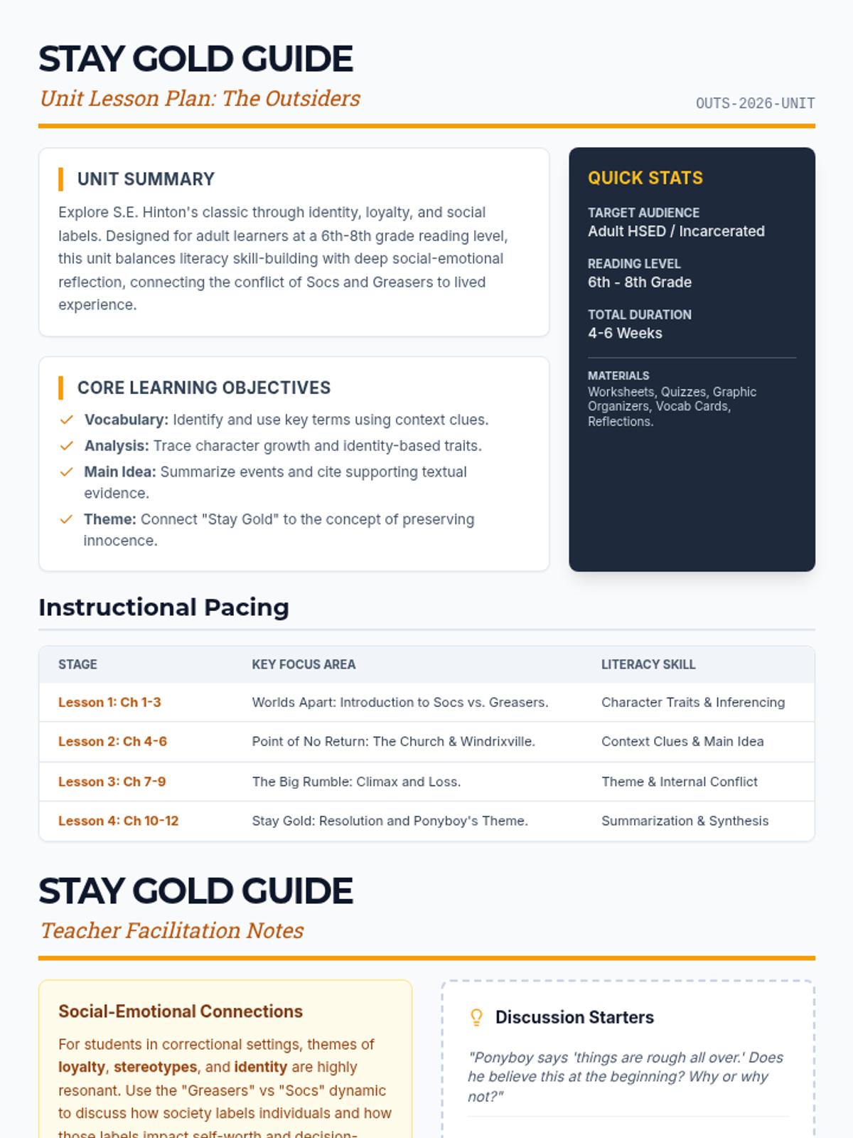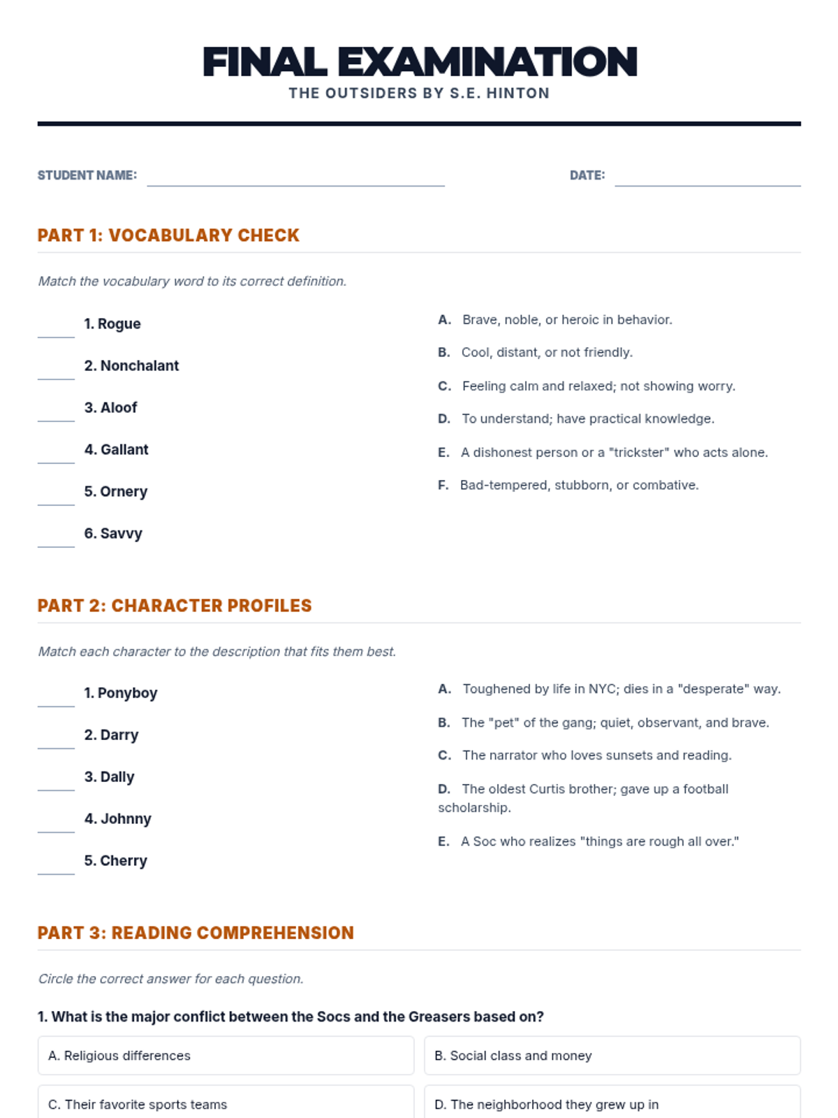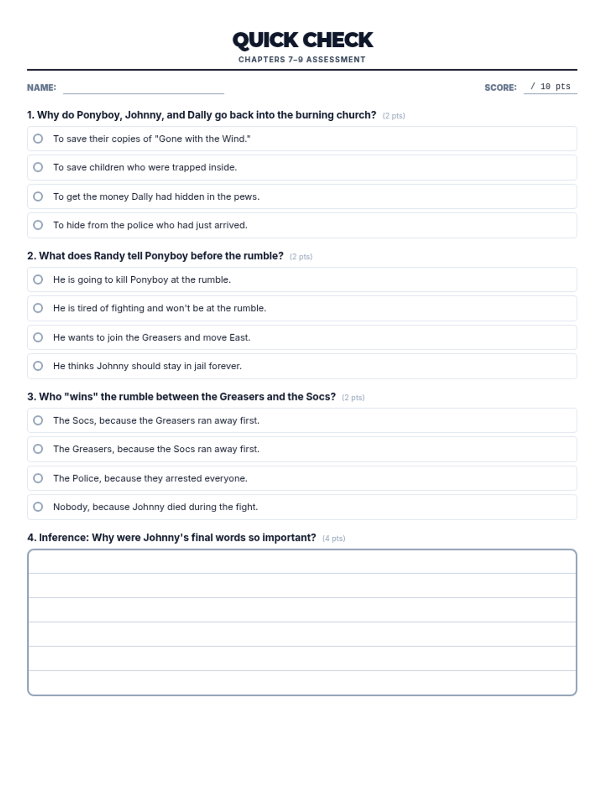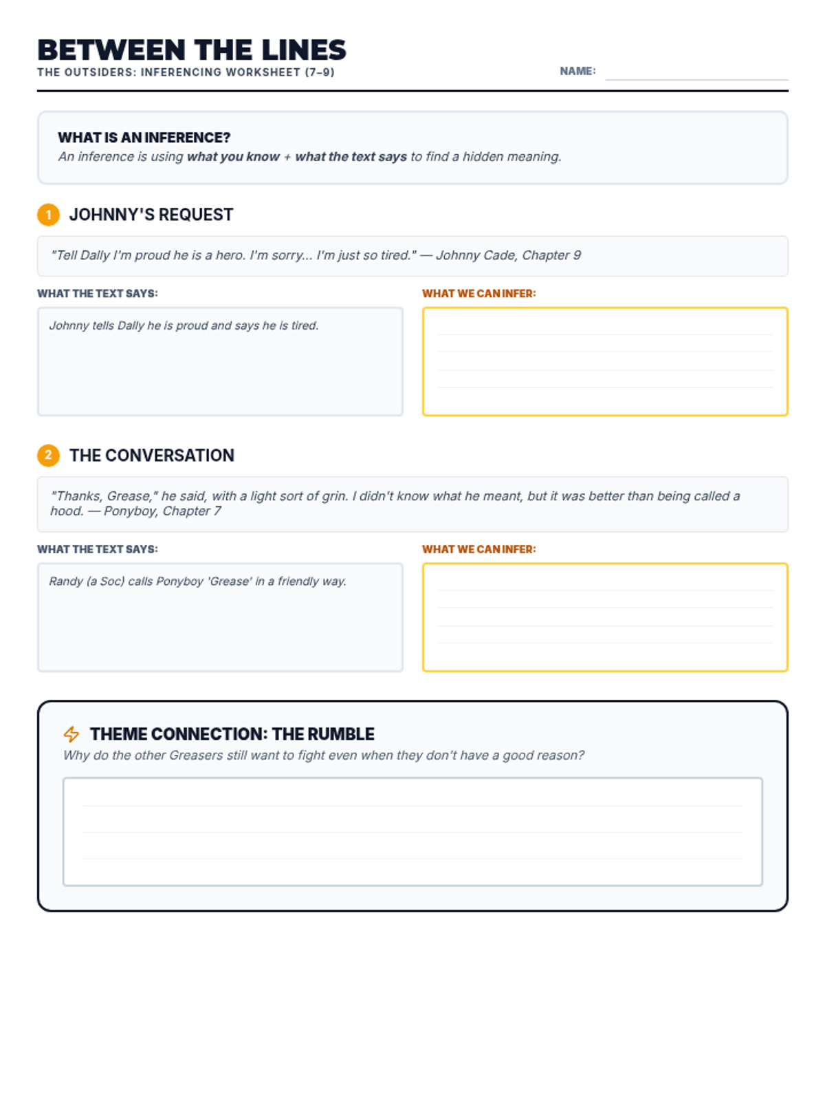 Introduces the social divide between Greasers and Socs, character archetypes, and the setting of 1960s Tulsa. Students focus on identifying main ideas and making initial character inferences.